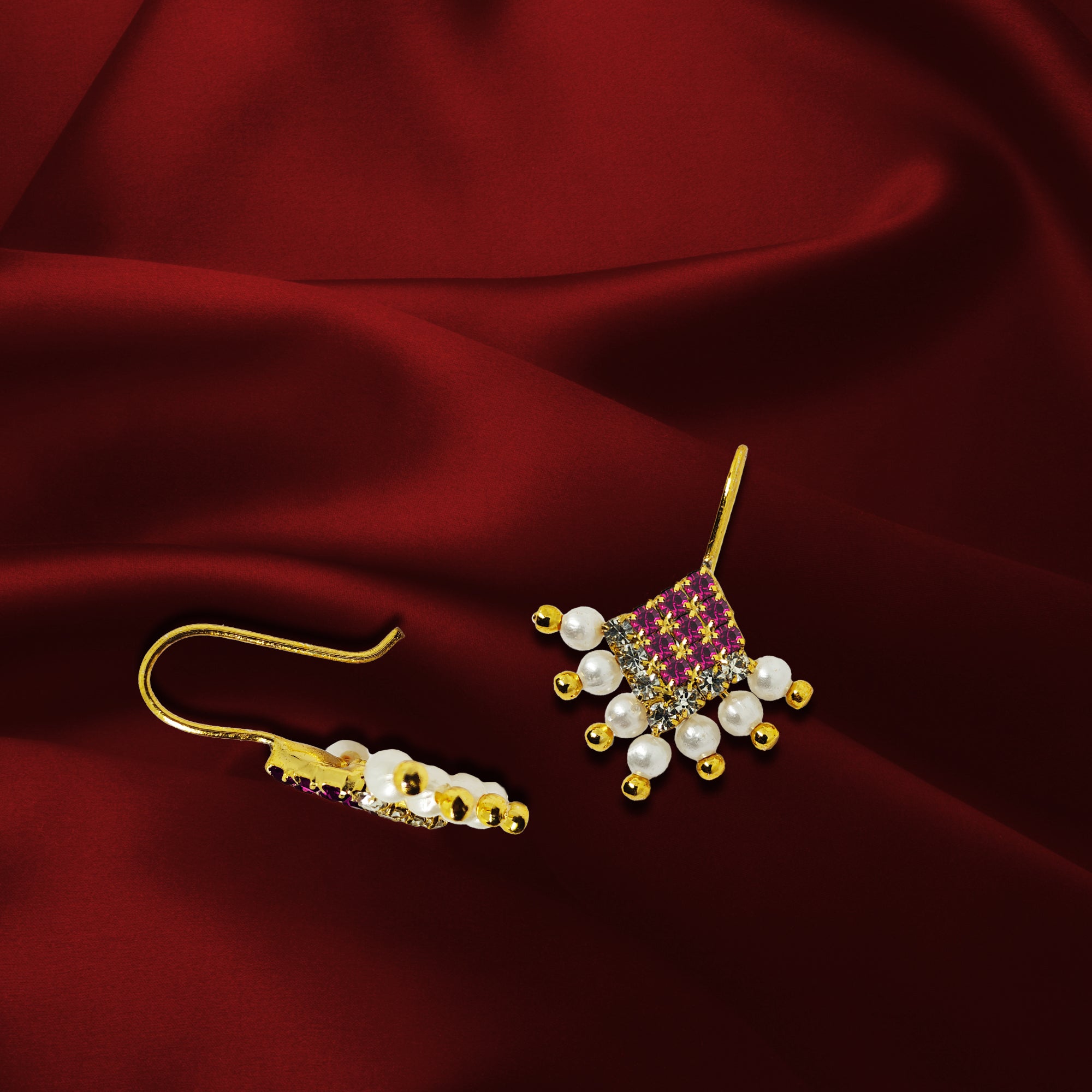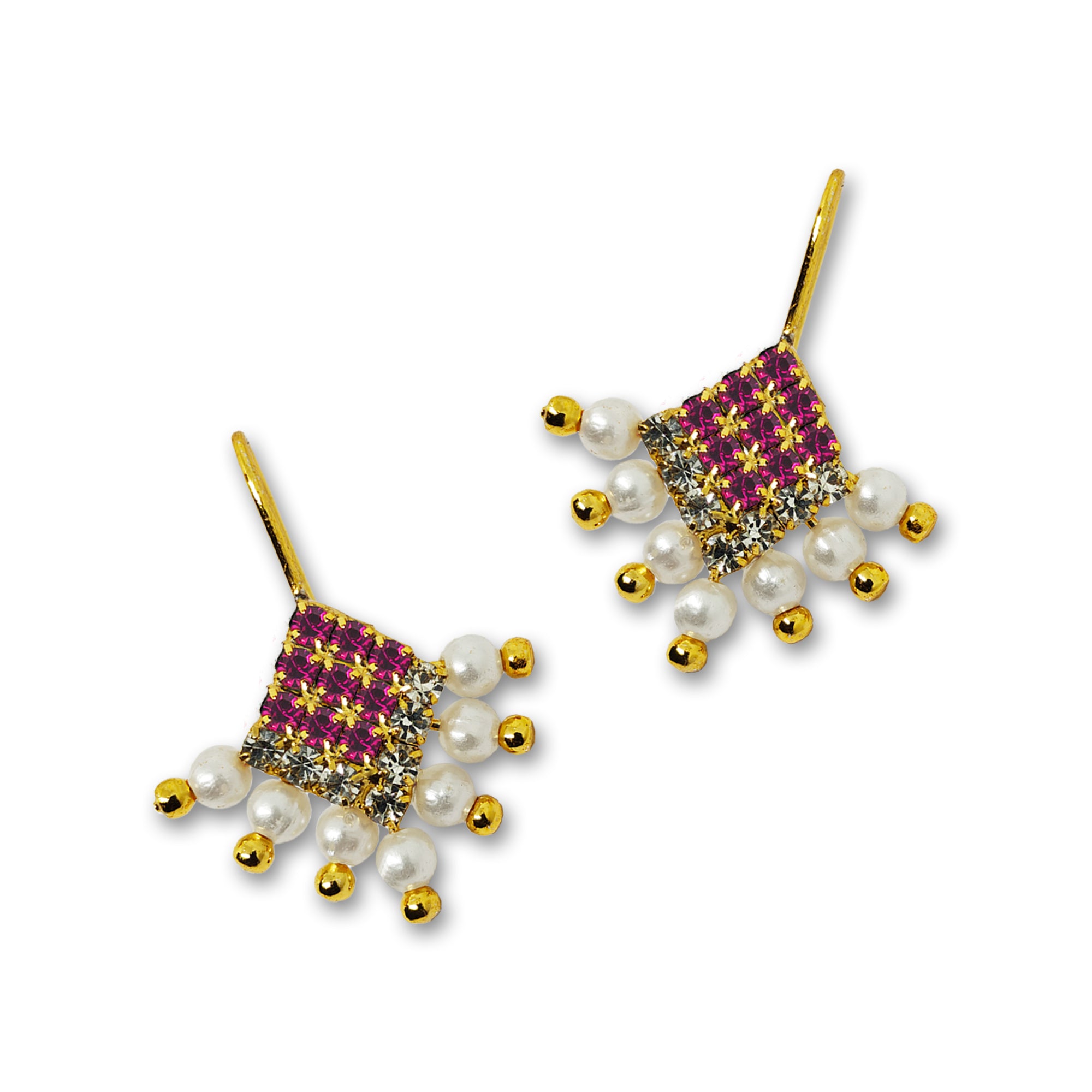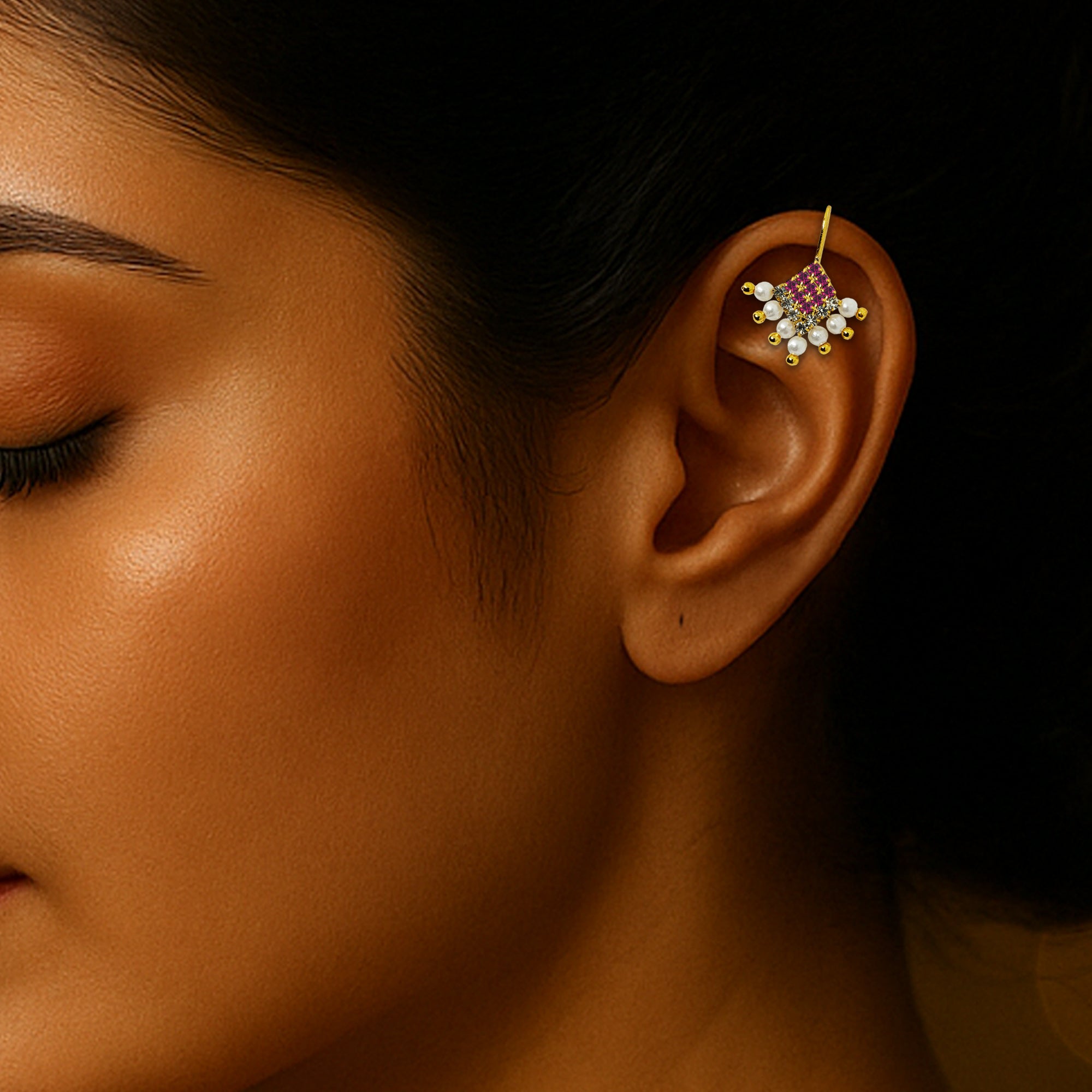 Make your festive look stand out with this stunning Diamond-Shaped Pink Stone & Pearl Ear Cuff by Comet Busters®. Featuring shimmering pink stones, sparkling crystals and delicate pearl danglings, this stylish accessory gives a graceful traditional touch—without the need for any piercing. Lightweight, comfortable and elegant, it’s perfect for weddings, festivals, dance performances and cultural celebrations.