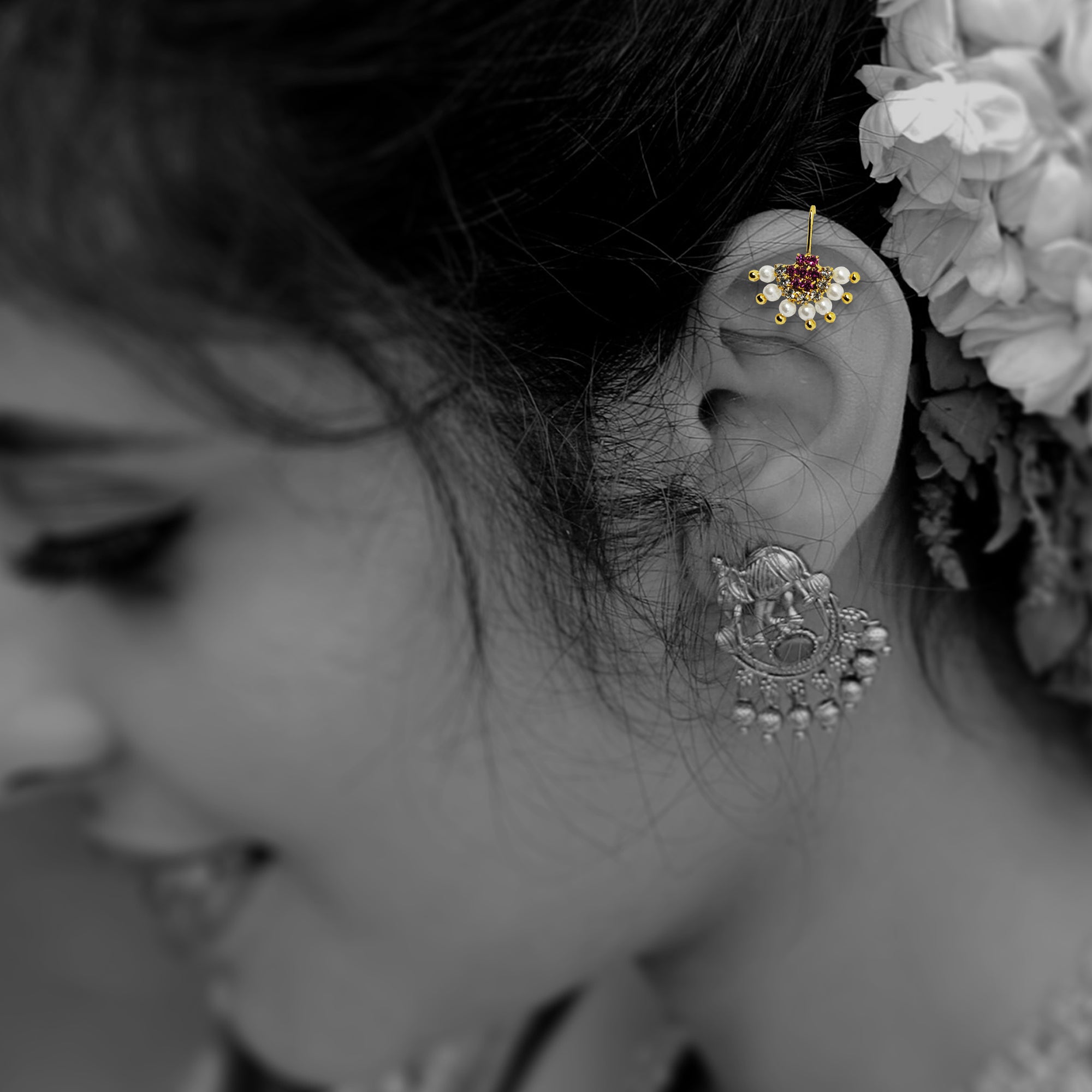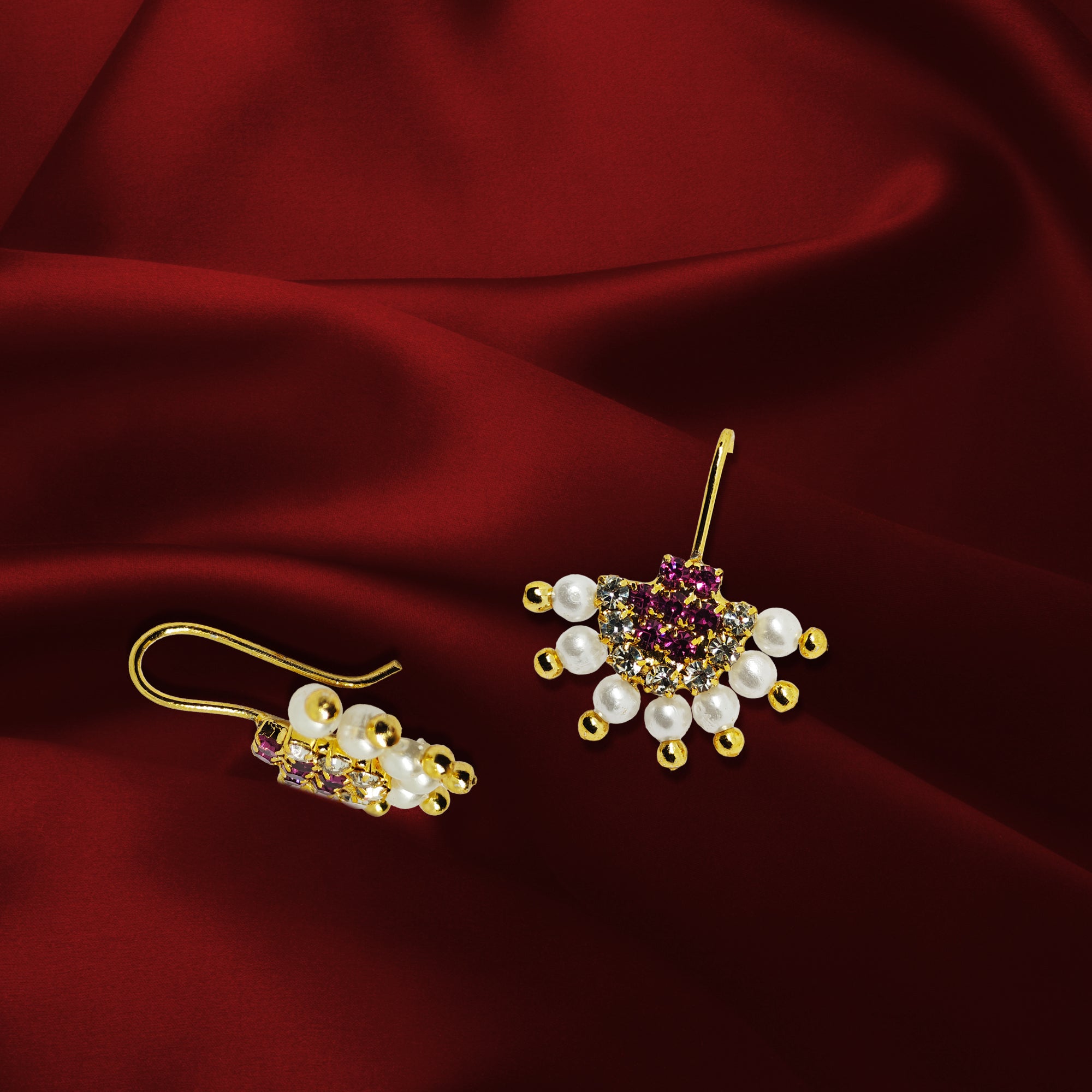 Elevate your festive and ethnic style with this Mini Pearl & Pink Stone Ear Cuff by Comet Busters®. Designed with shimmering pink stones, sparkling crystals and delicate pearl drops, this dainty ear cuff adds a touch of elegance—without requiring any piercing. Lightweight, secure and stunning, it’s the perfect accessory for weddings, sangeet, festivals and traditional dressing.