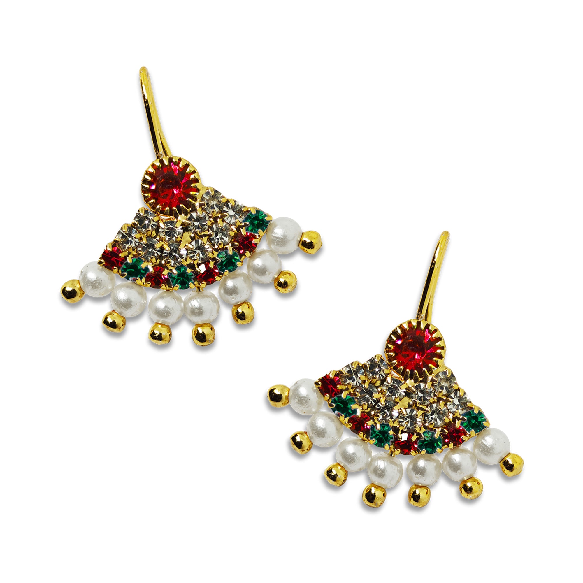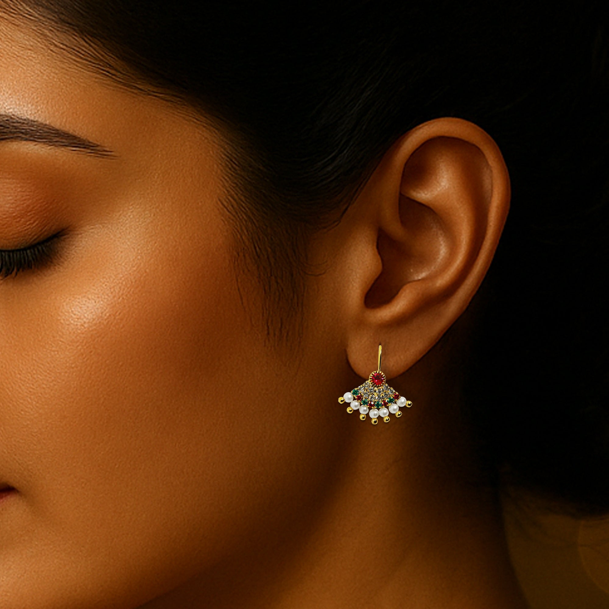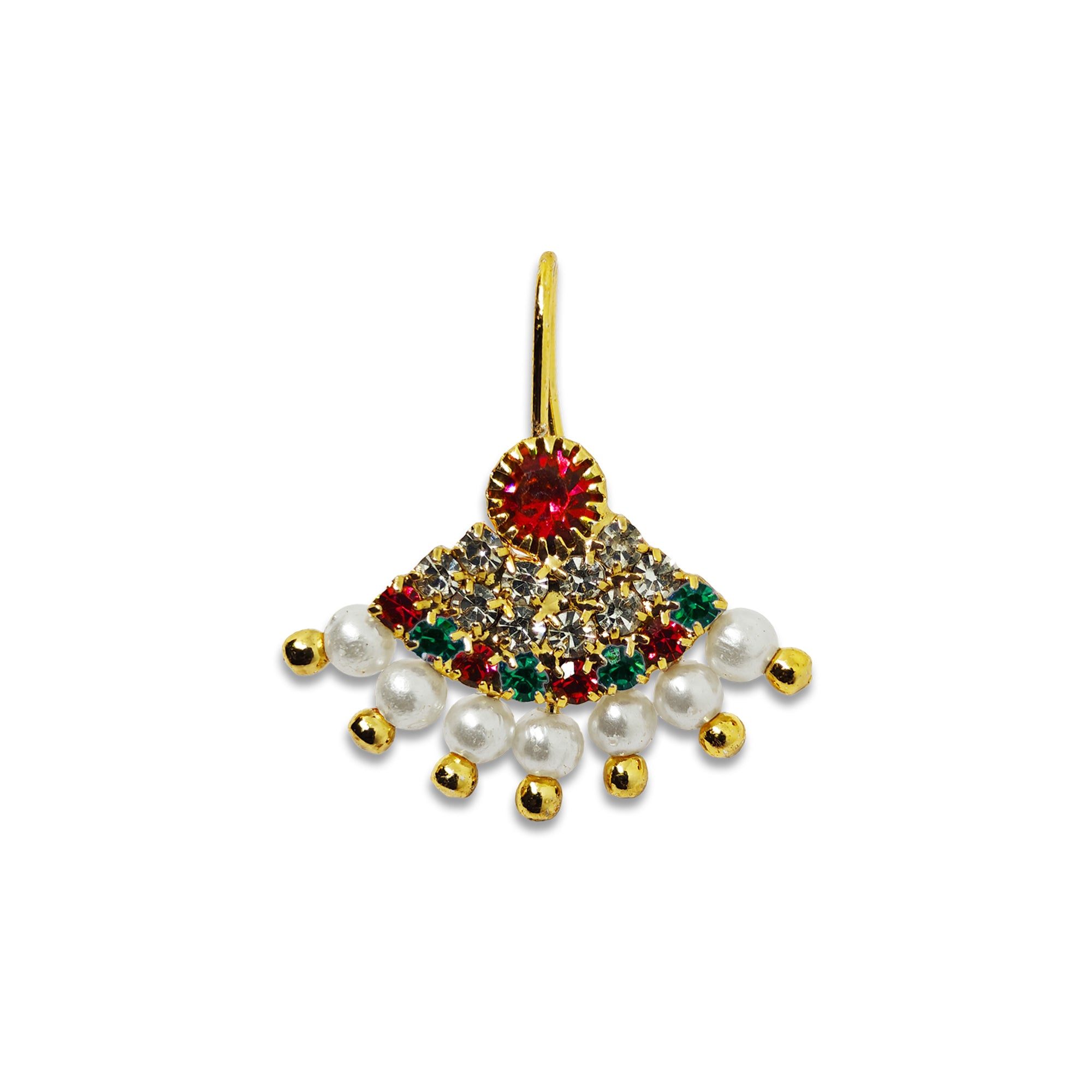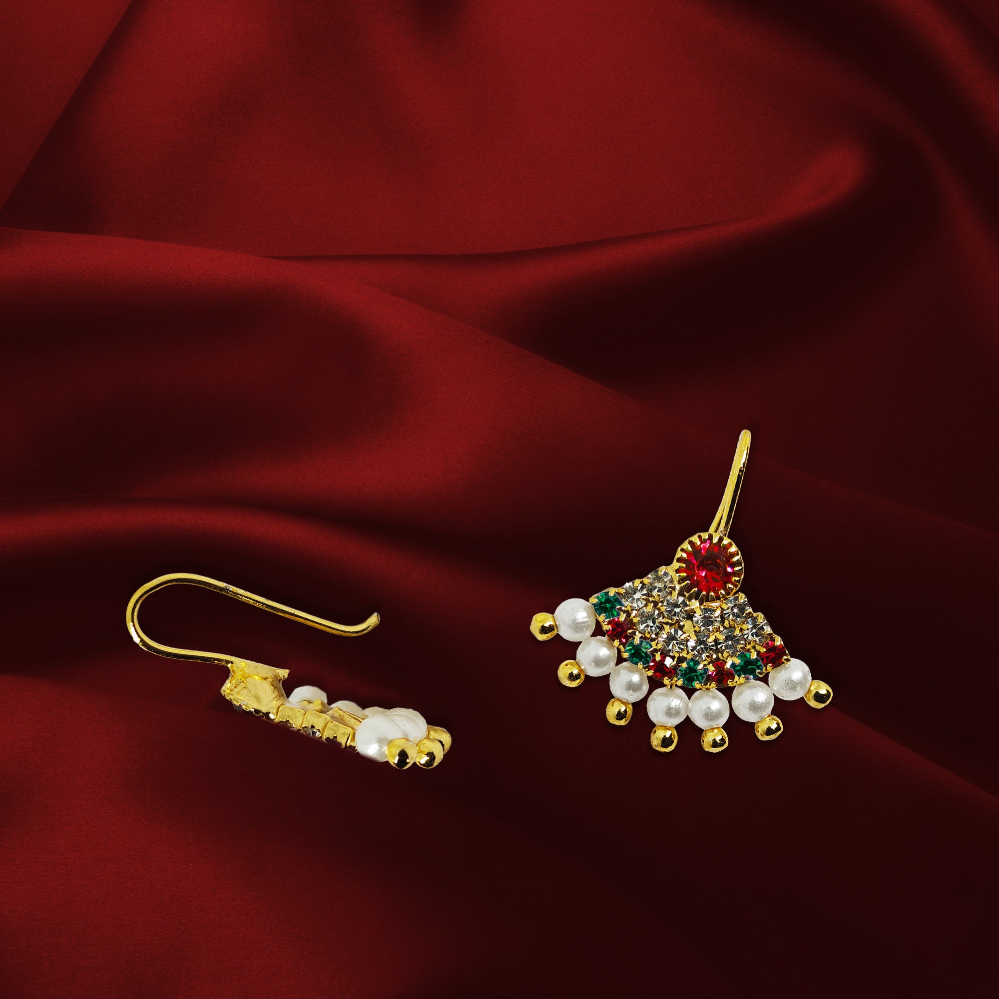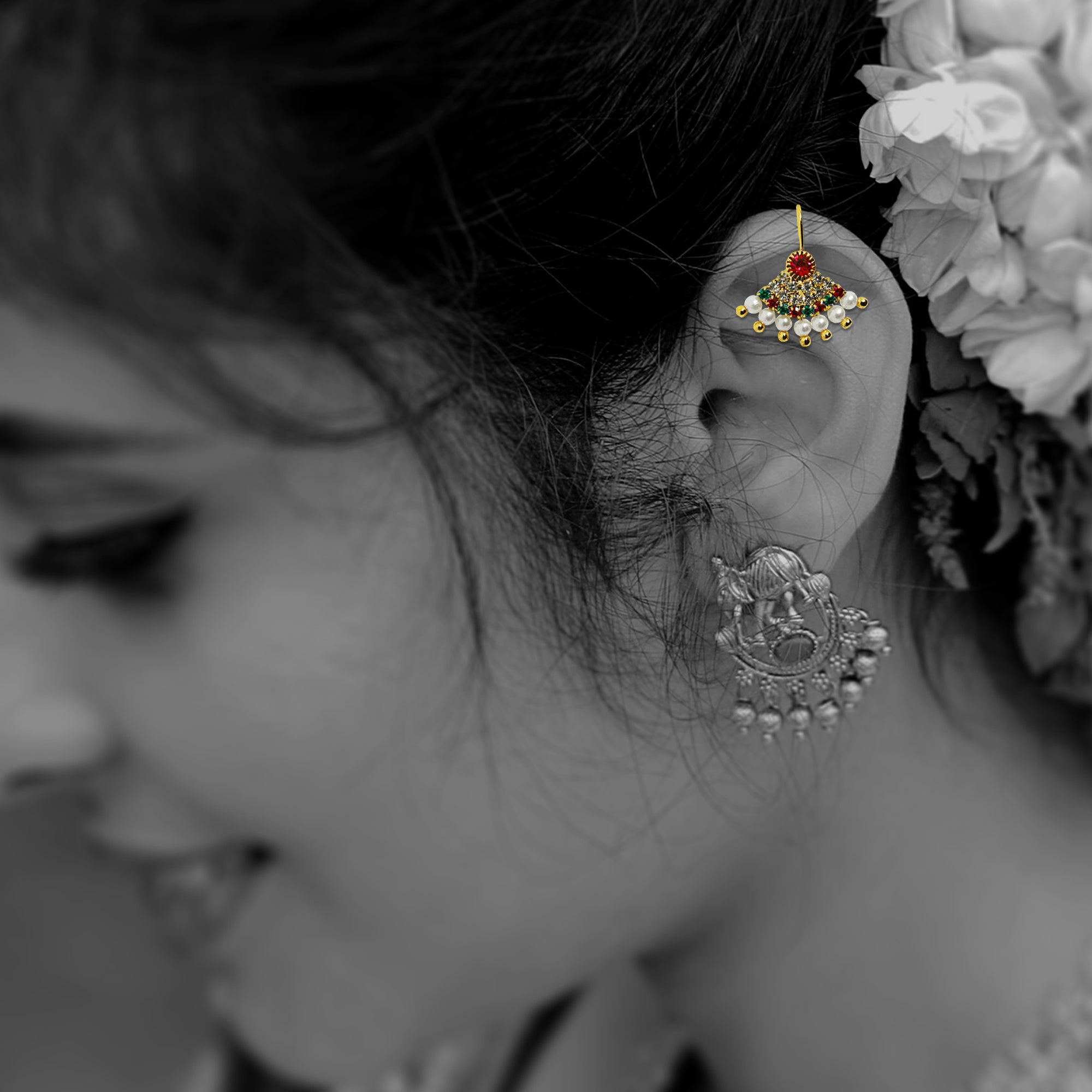 Add a vibrant festive touch to your ethnic look with this Multicolour Stone & Pearl Ear Cuff by Comet Busters®. Adorned with shimmering maroon stones, green and gold crystals, and finished with delicate pearl danglings, this jhumka-inspired mini ear cuff enhances your style—without requiring any piercing. Lightweight, secure and statement-worthy, it’s the perfect accessory for weddings, festivals and cultural celebrations.
