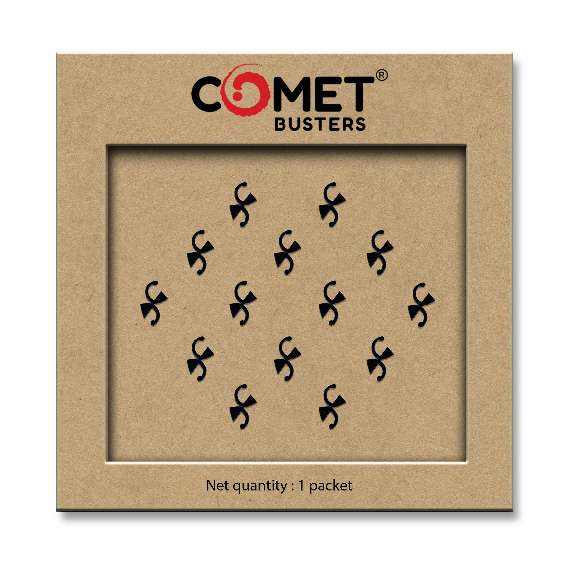 Comet Busters® Black Designer Fusion Abstract Bindis feature a sharp geometric centre paired with smooth curved strokes, creating a bold and elegant fusion look. Lightweight, skin-safe, easy to apply, and reusable — perfect for women and girls who love stylish, modern ethnic accessories.
