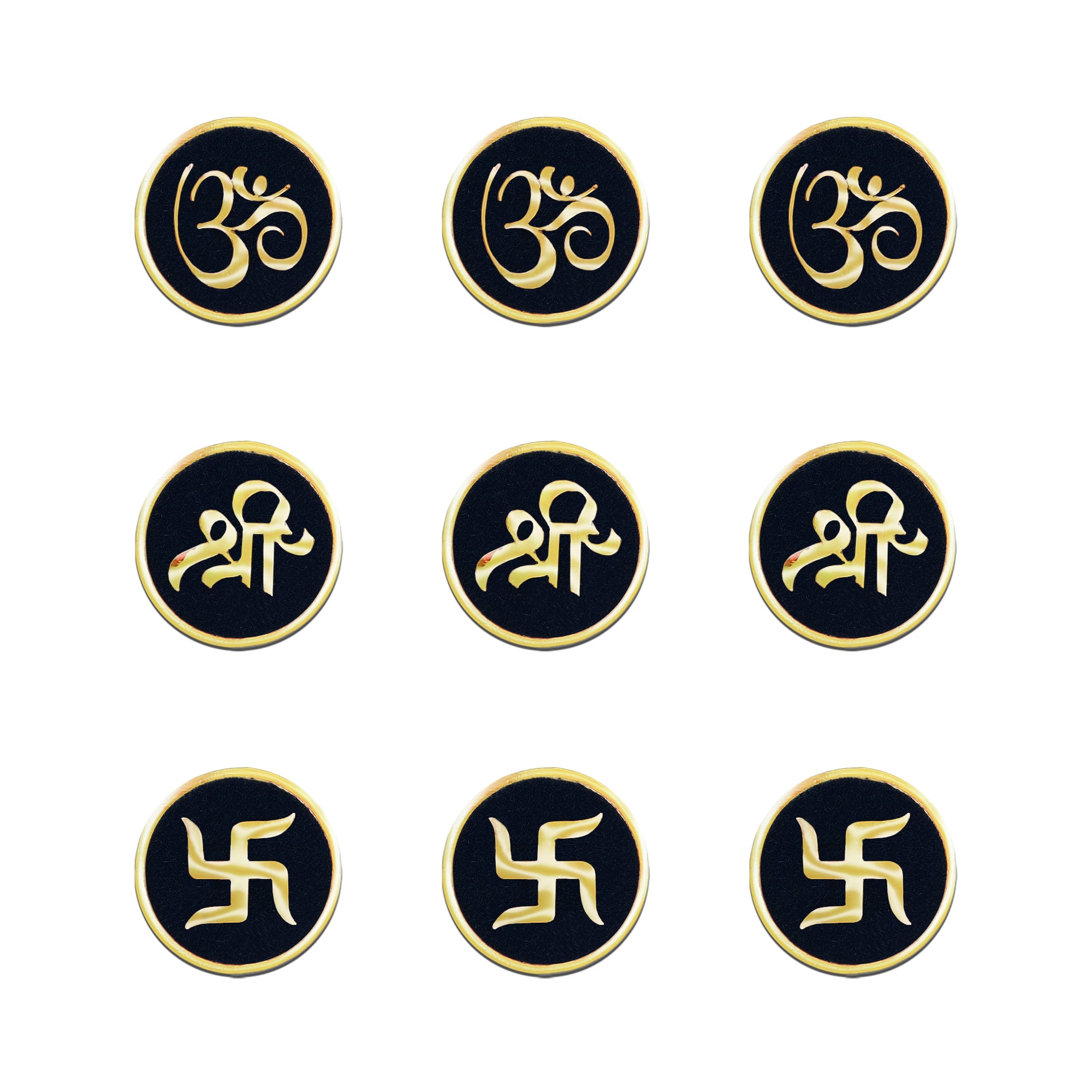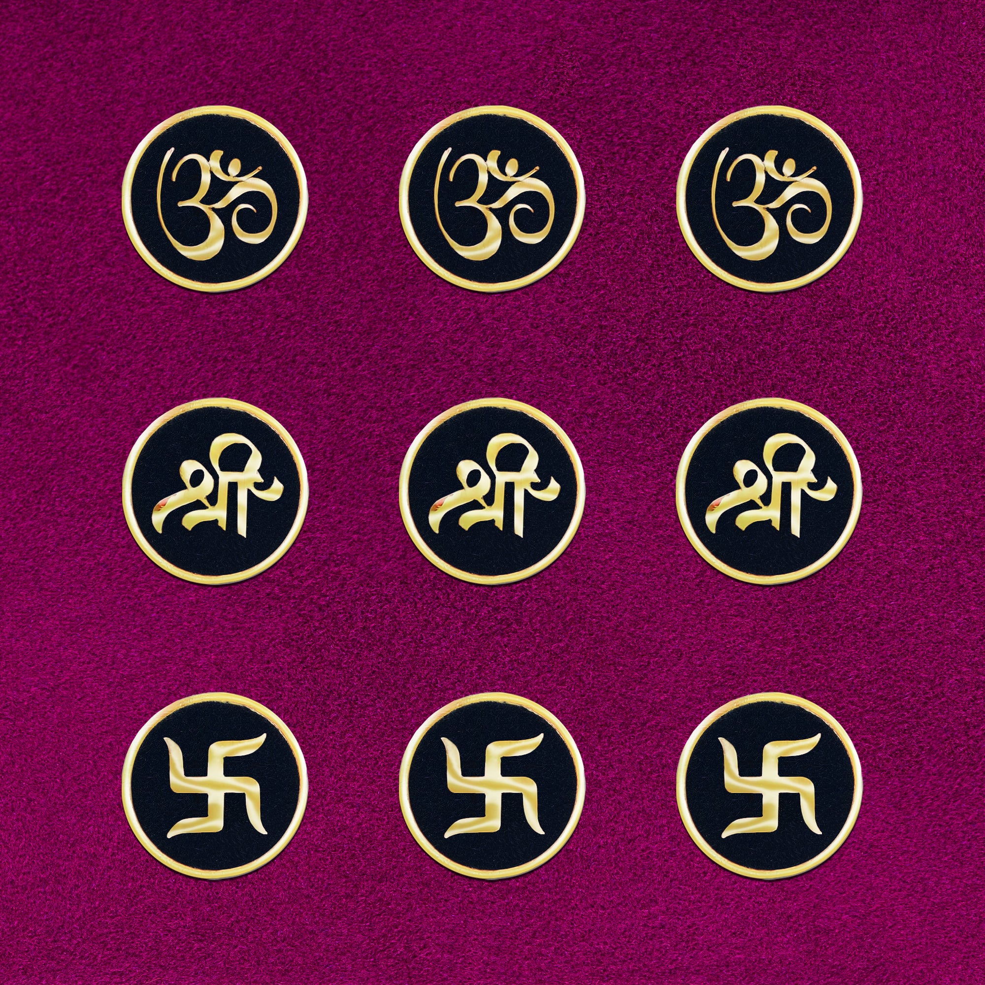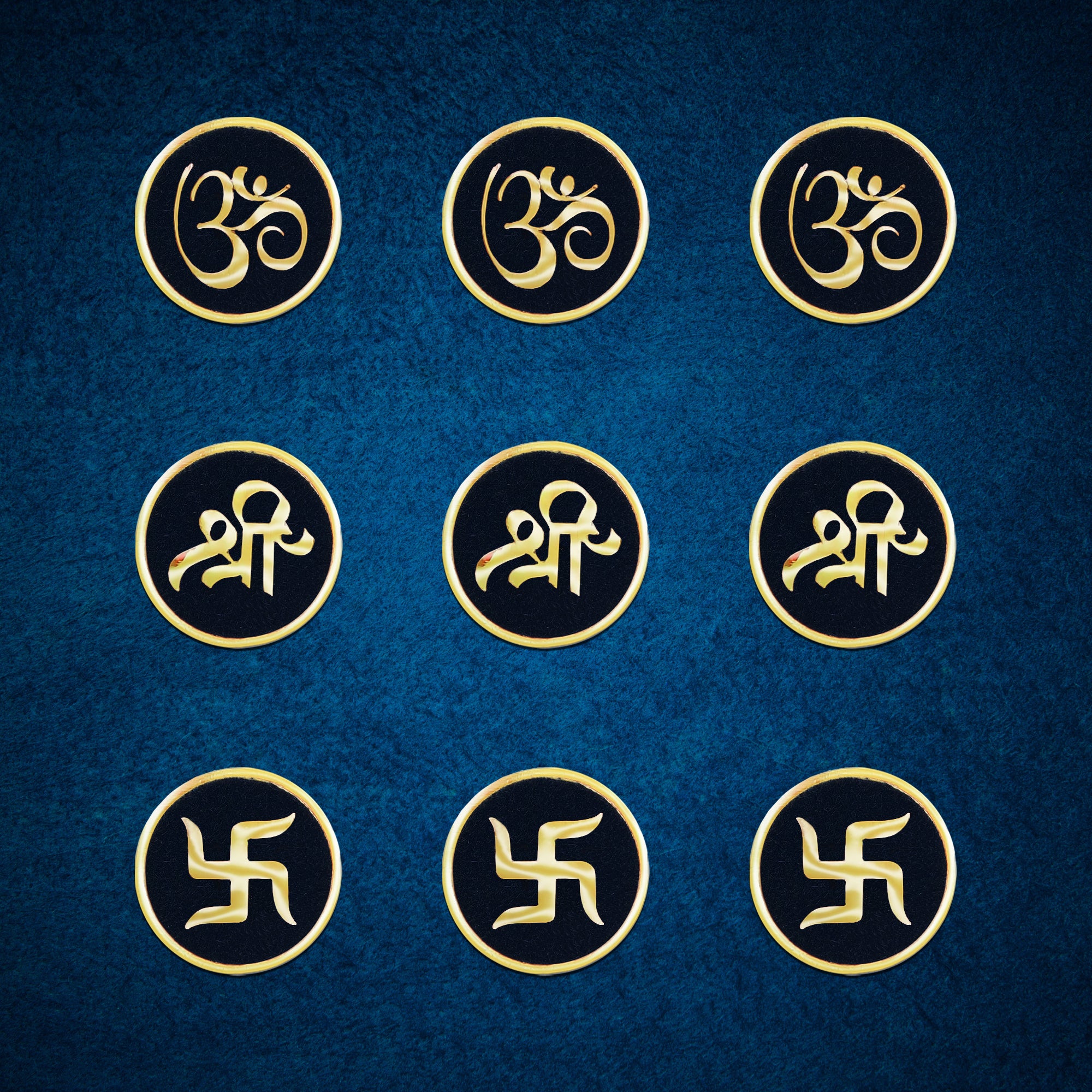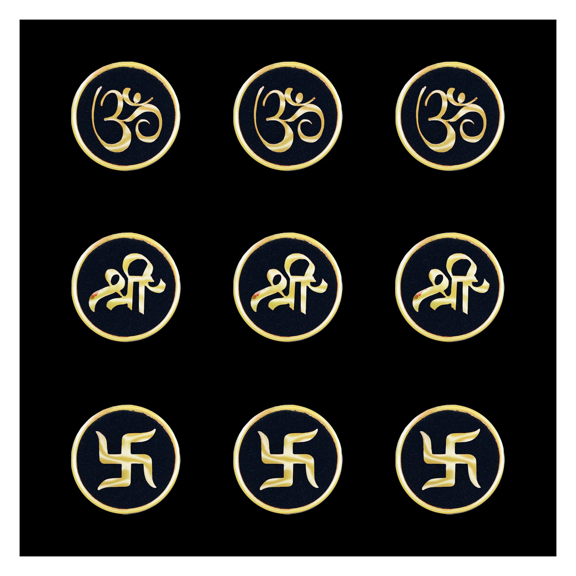 Each bindi is handcrafted on a rich black velvet base and features sacred golden Om (ॐ), Shree (श्री), and Swastik (卐) motifs — symbols of divinity, prosperity, and positive energy. The 15mm round size makes these bindis bold yet graceful, adding a regal touch to your look.