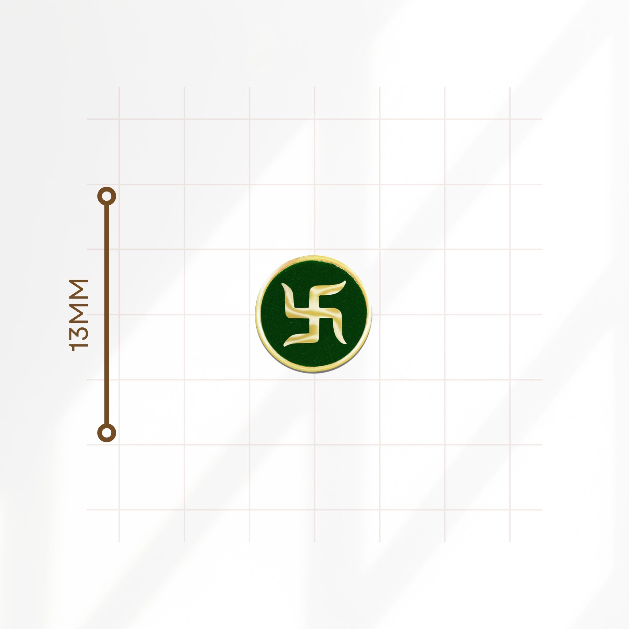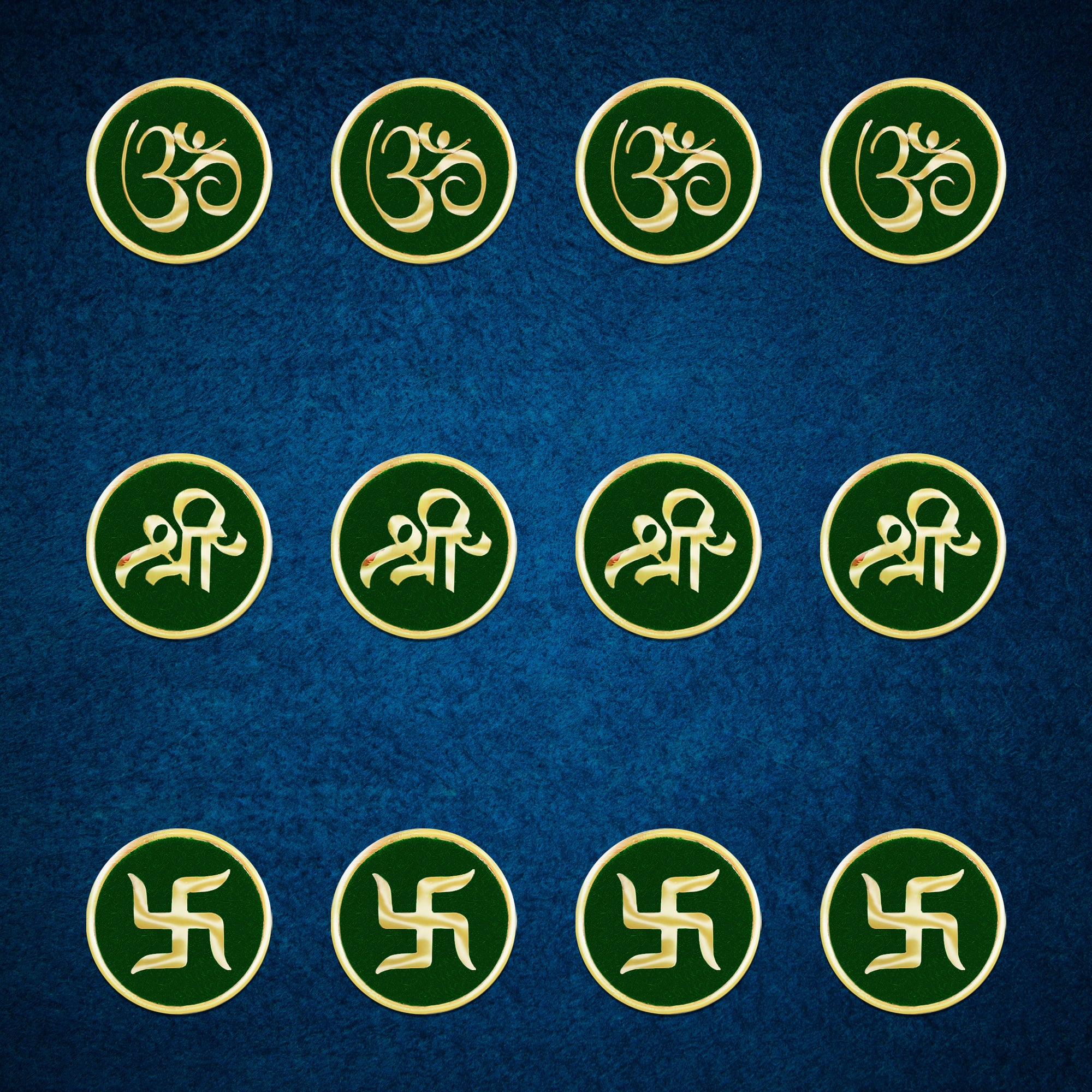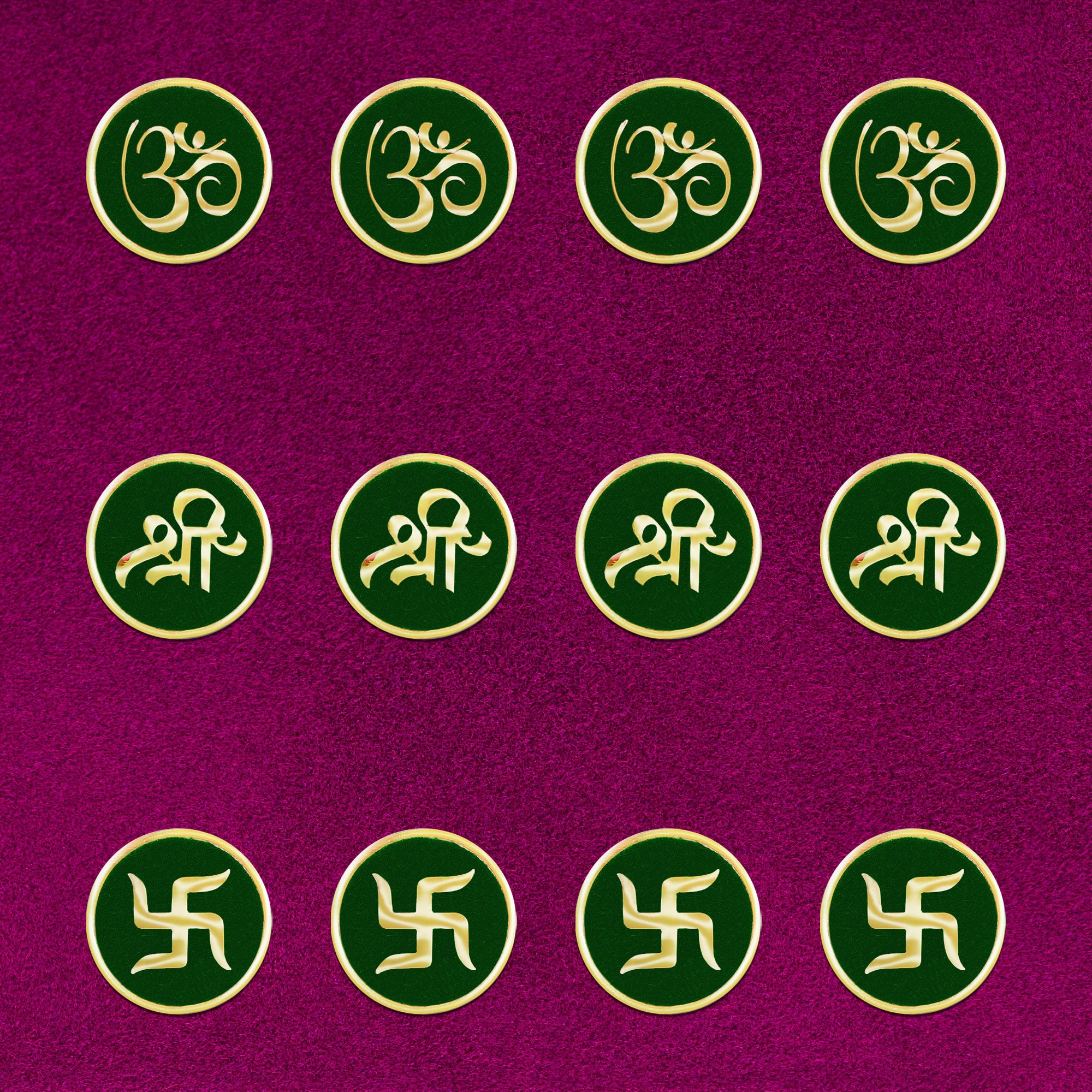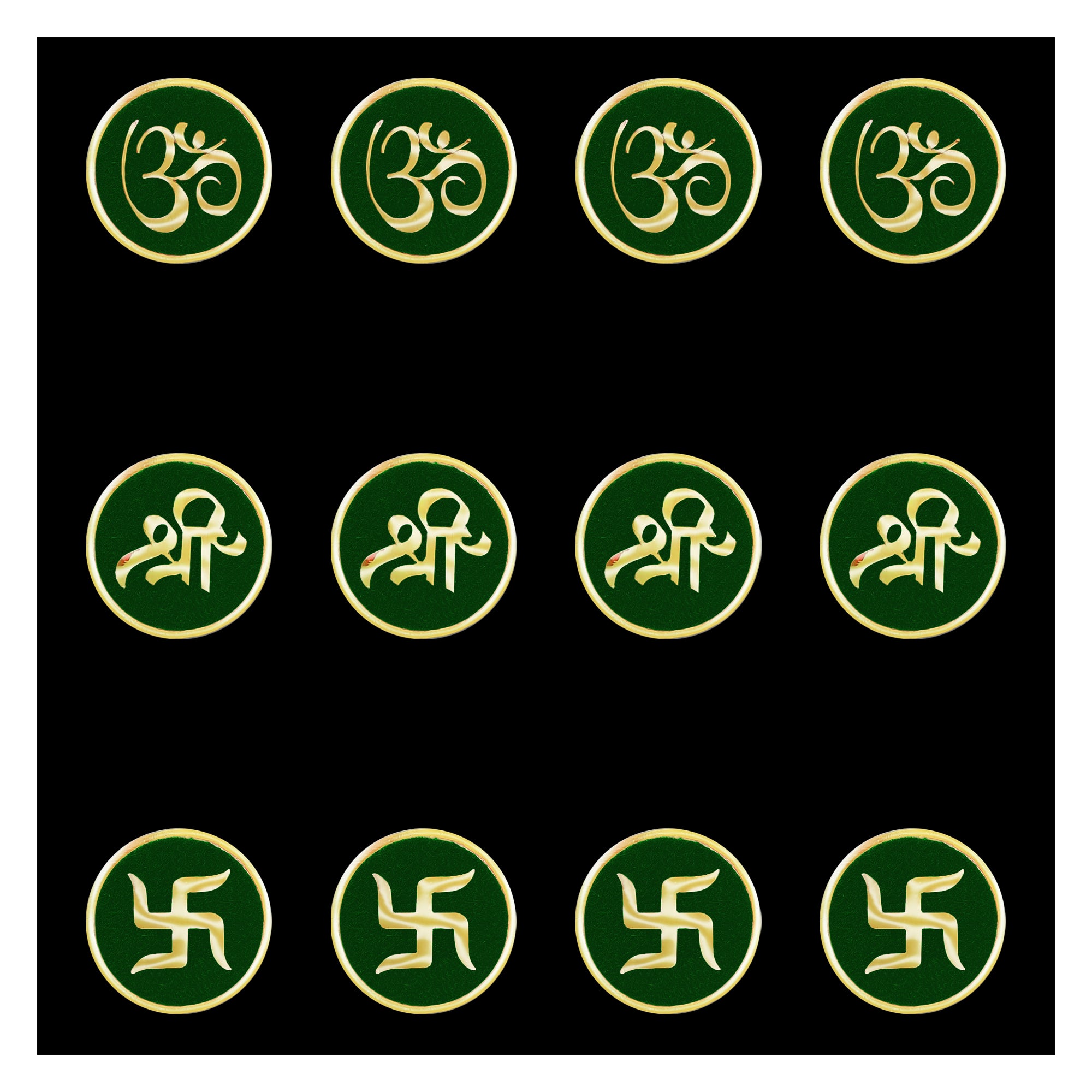 Each handcrafted bindi features intricate golden Om, Shree, and Swastik symbols, representing divine harmony, prosperity, and positive energy. The rich green velvet base embodies growth, balance, and spiritual calm — ideal for auspicious occasions and traditional celebrations.