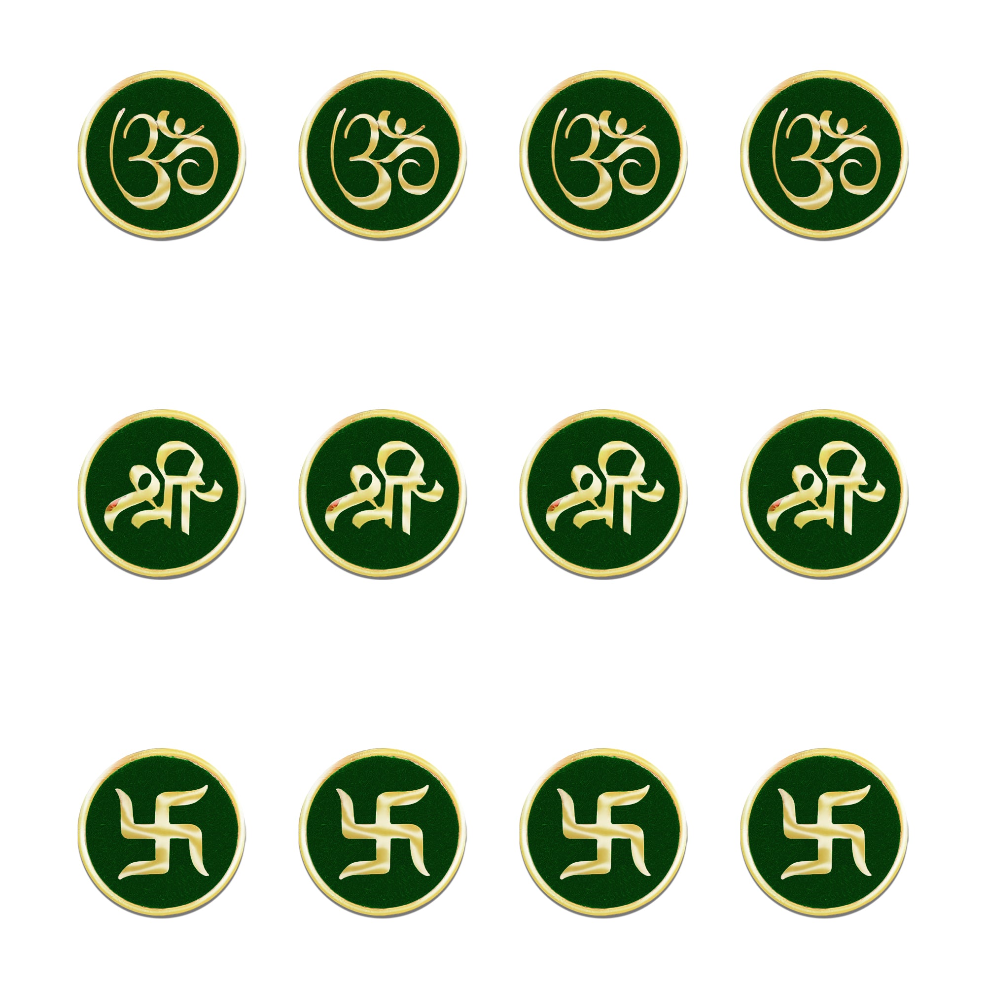Indira Spiritual Bindis – Premium Designer Green Velvet Om Shree Swastik Bindis (13mm)- 12 Round Bindis Forehead Stickers for Women & Girls (INDI024)