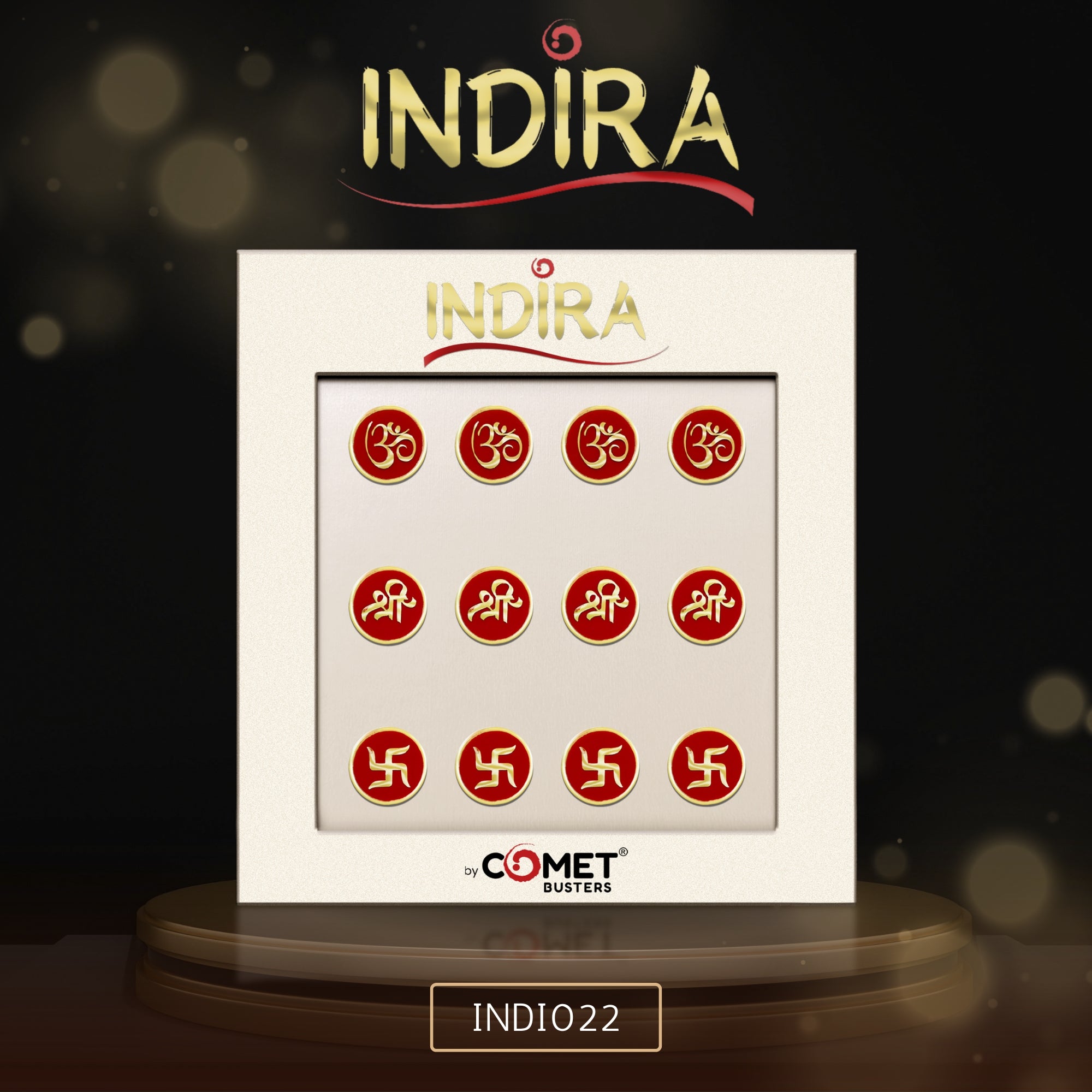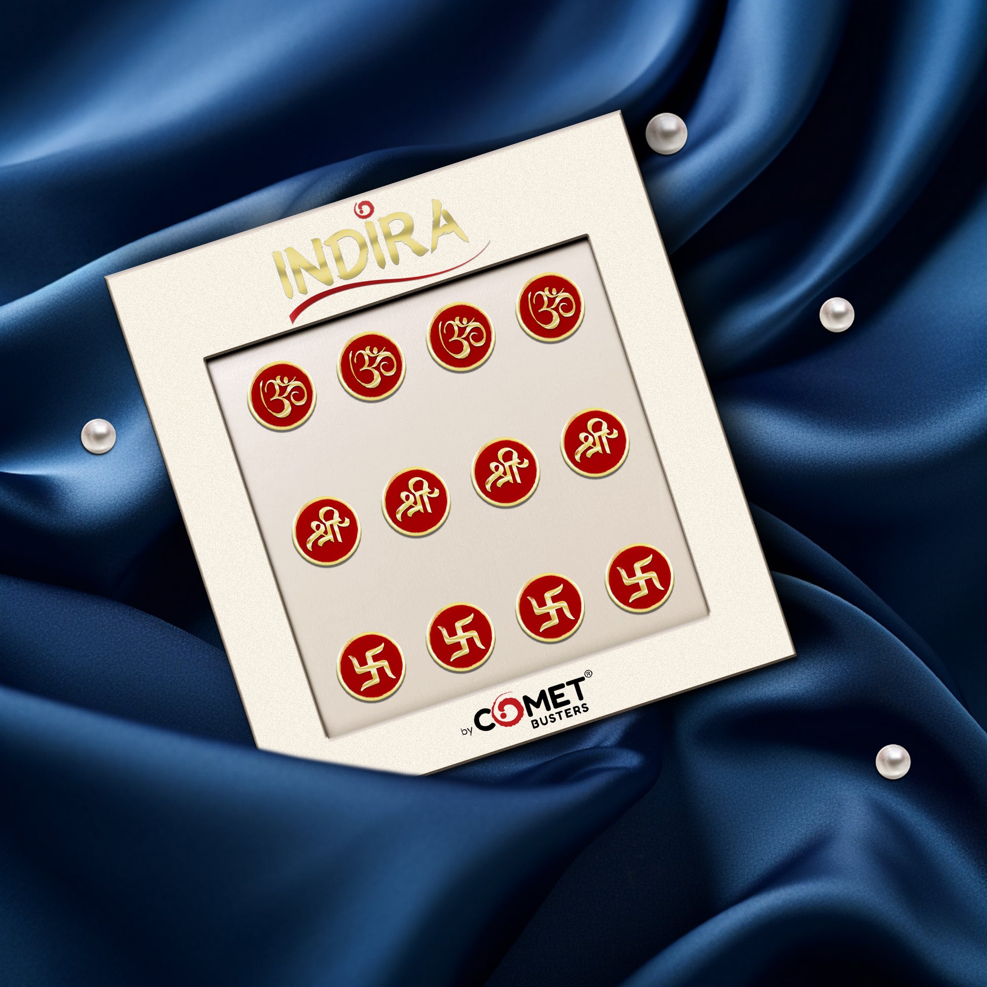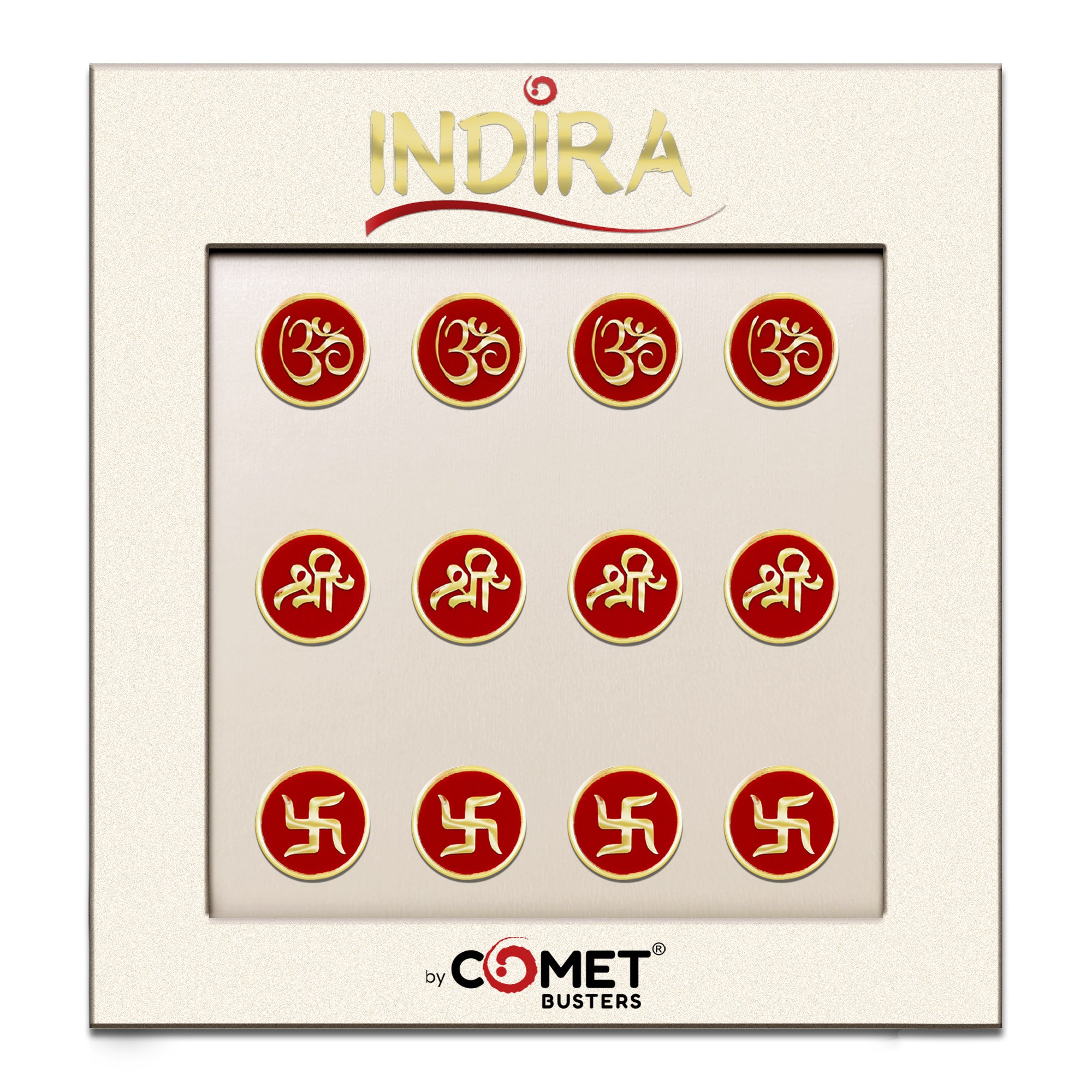 Celebrate faith, beauty, and tradition with the Comet Busters® Indira Spiritual Bindis (13mm) — a luxurious red velvet collection that brings sacred symbols to life through elegant craftsmanship.