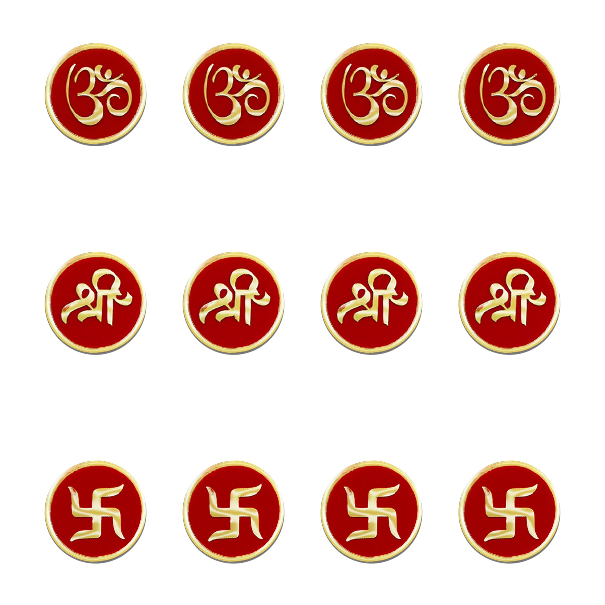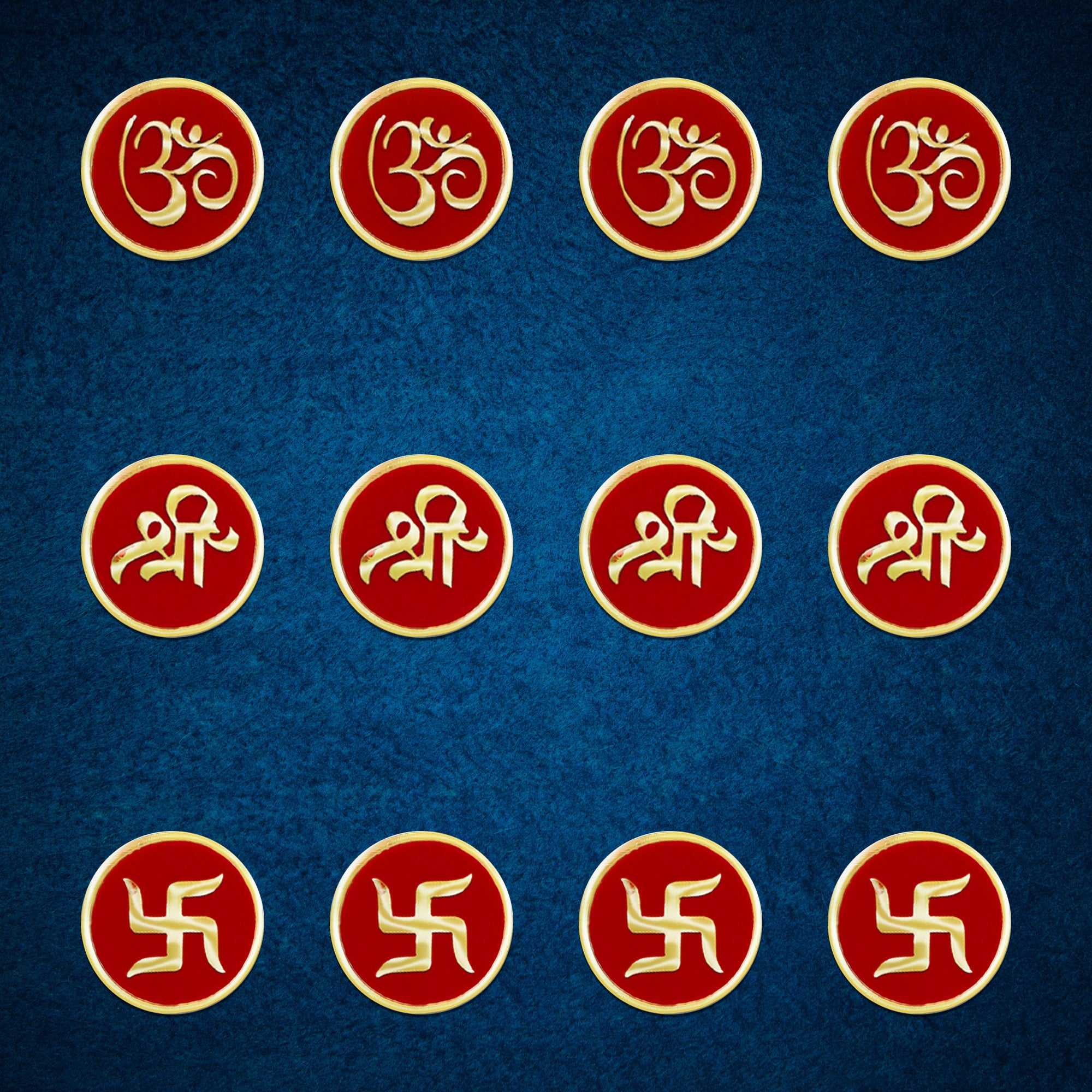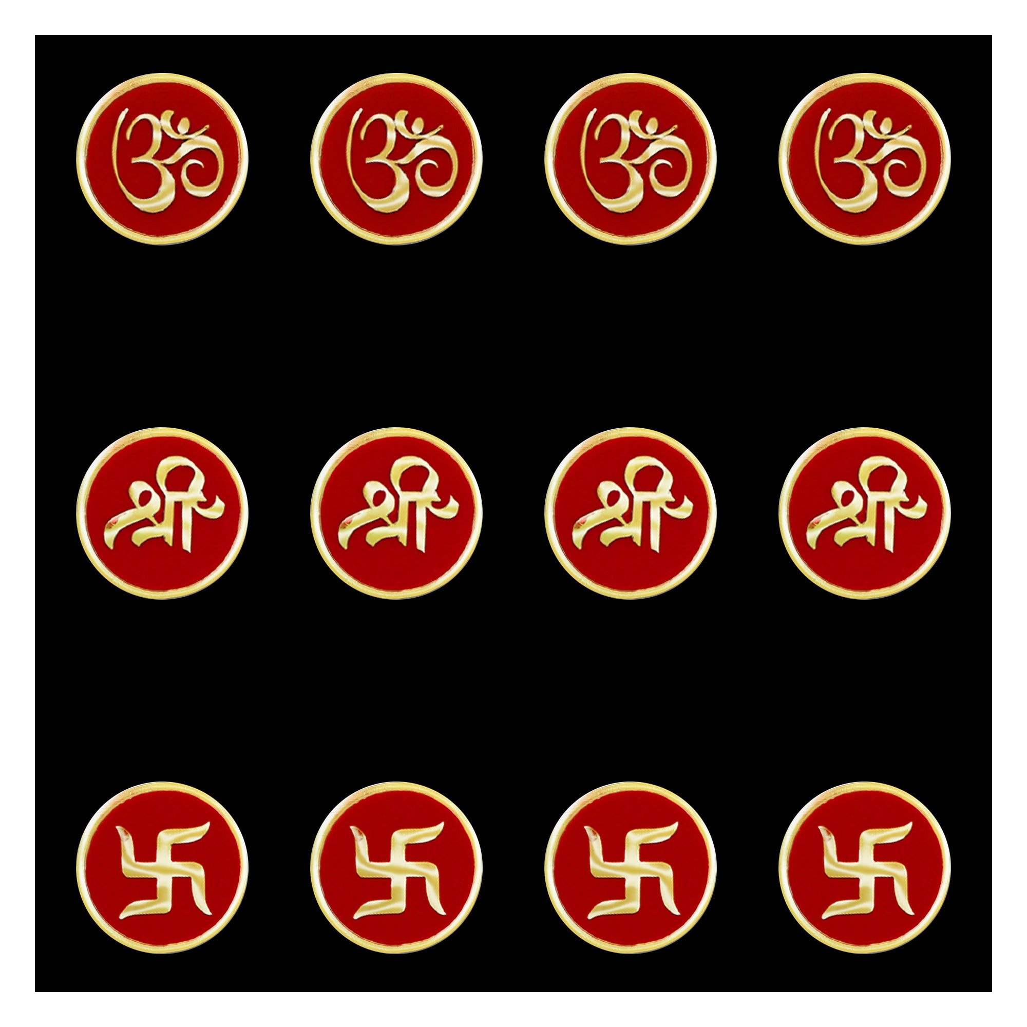 Each bindi in this premium set is beautifully adorned with golden Om, Shree, and Swastik motifs, representing divine energy, prosperity, and positivity. The deep red velvet base adds richness and purity, while the gold metallic detailing elevates the design, making it perfect for spiritual ceremonies, festive occasions, and temple wear.
