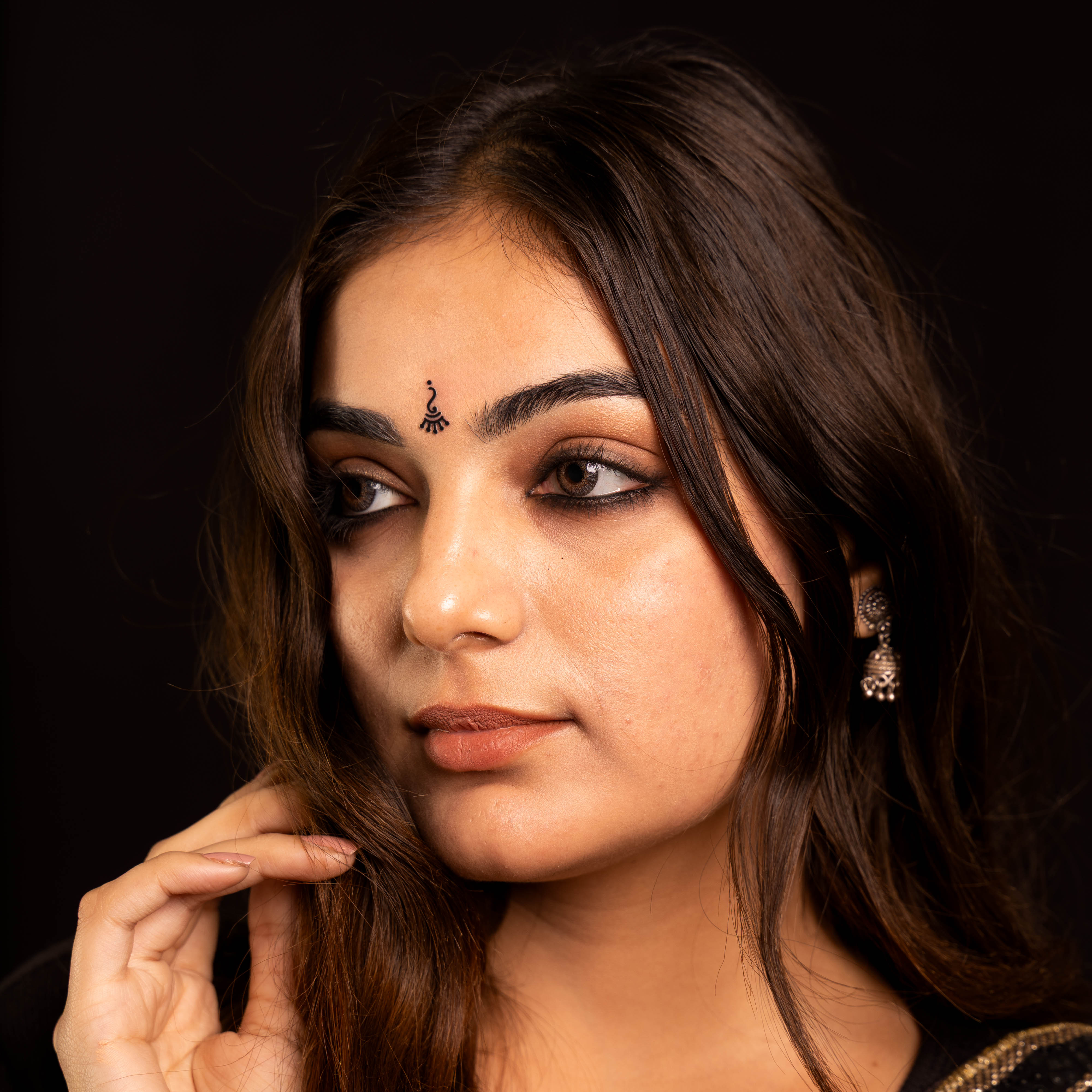 • To apply, gently remove the bindi from its backing and place it between the eyebrows.