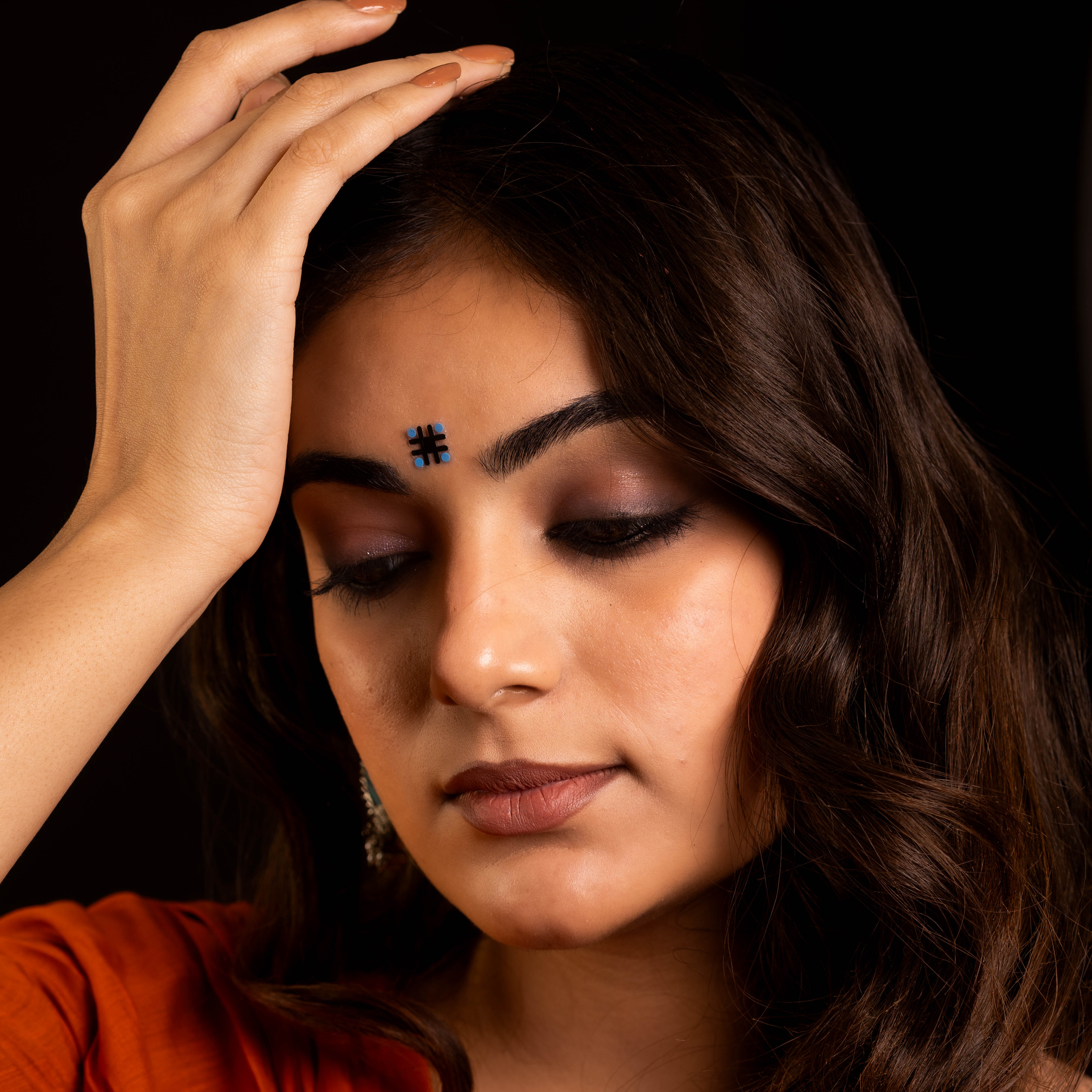 • To apply, gently remove the bindi from its backing and place it between the eyebrows.
