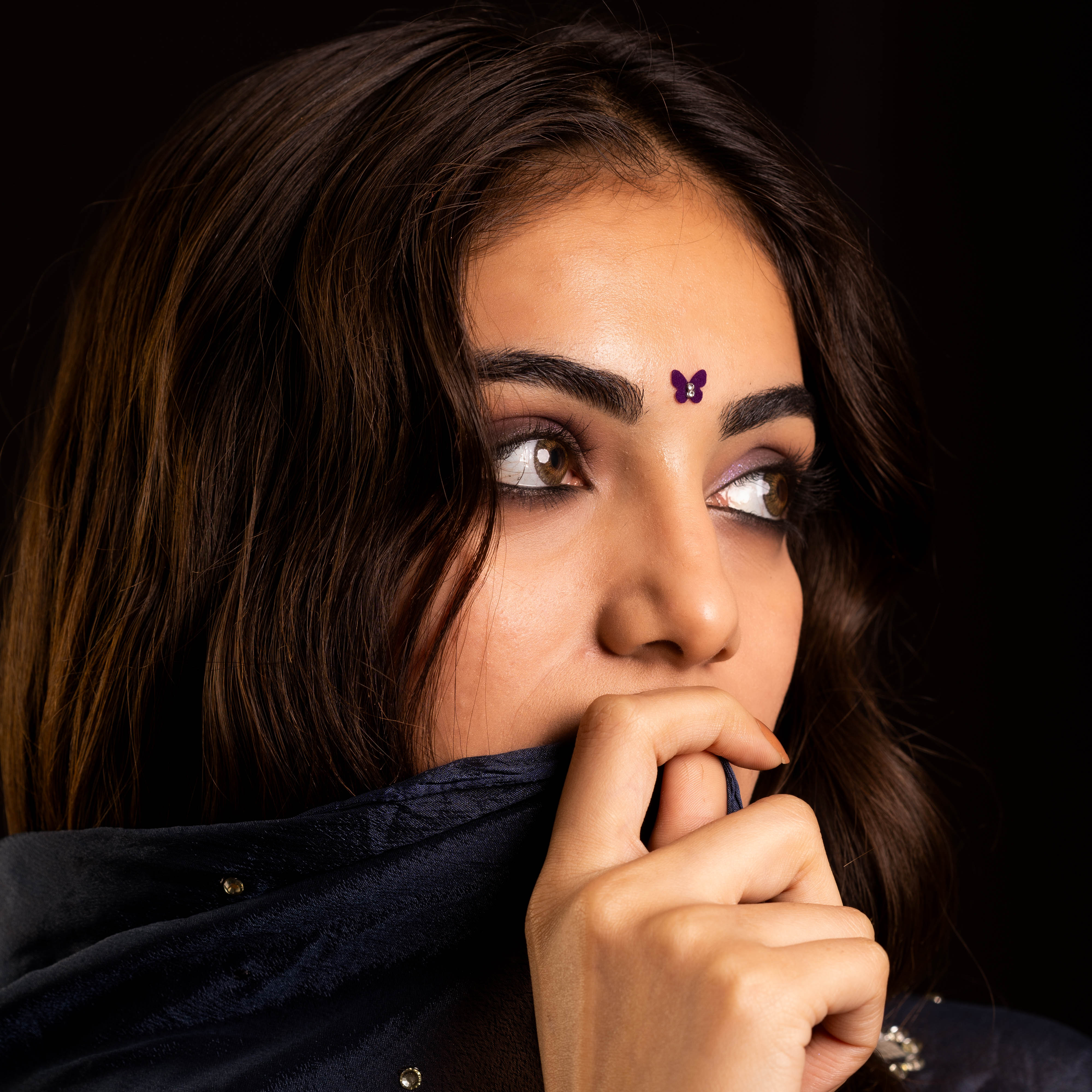 • To apply, gently remove the bindi from its backing and place it between the eyebrows.