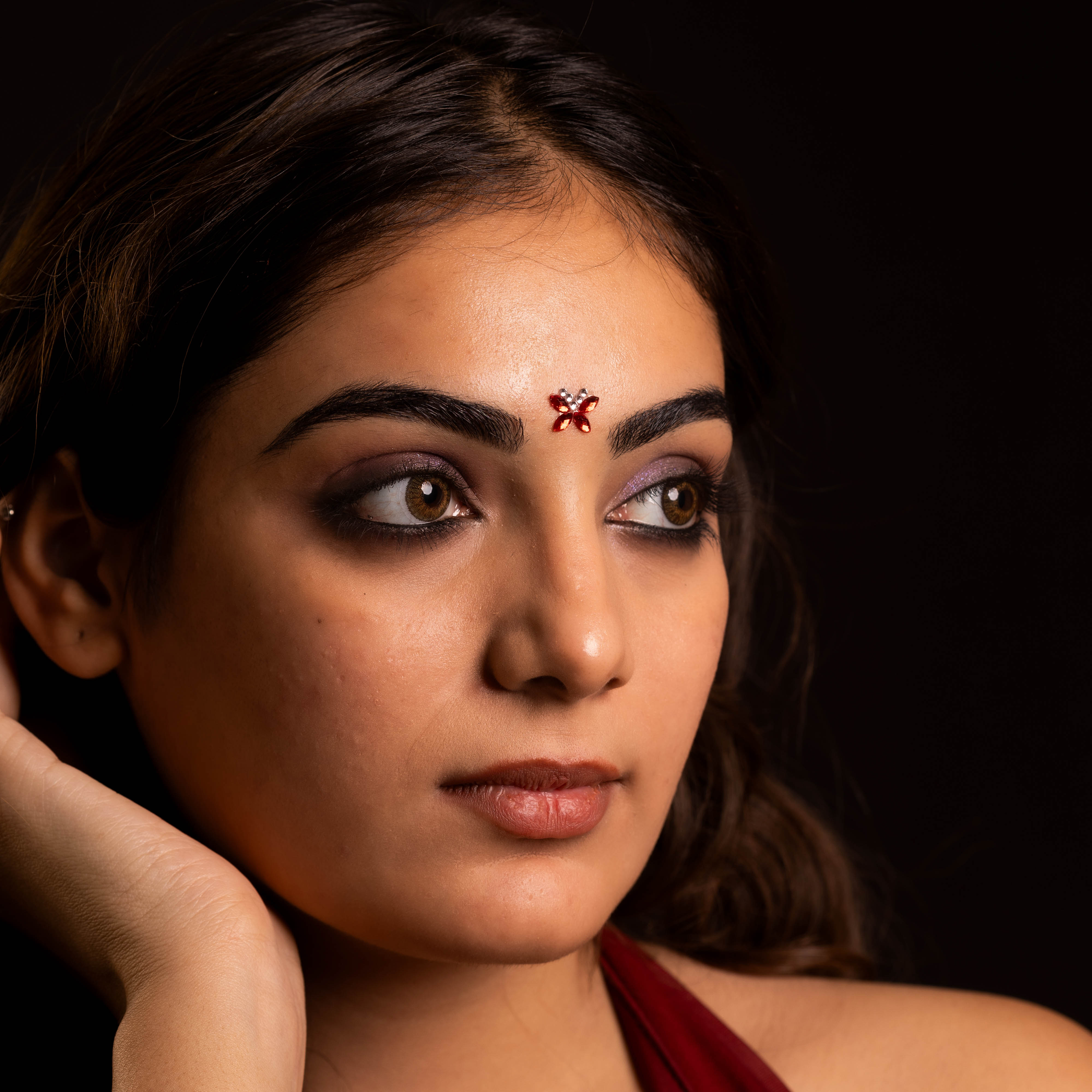 • To apply, gently remove the bindi from its backing and place it between the eyebrows.