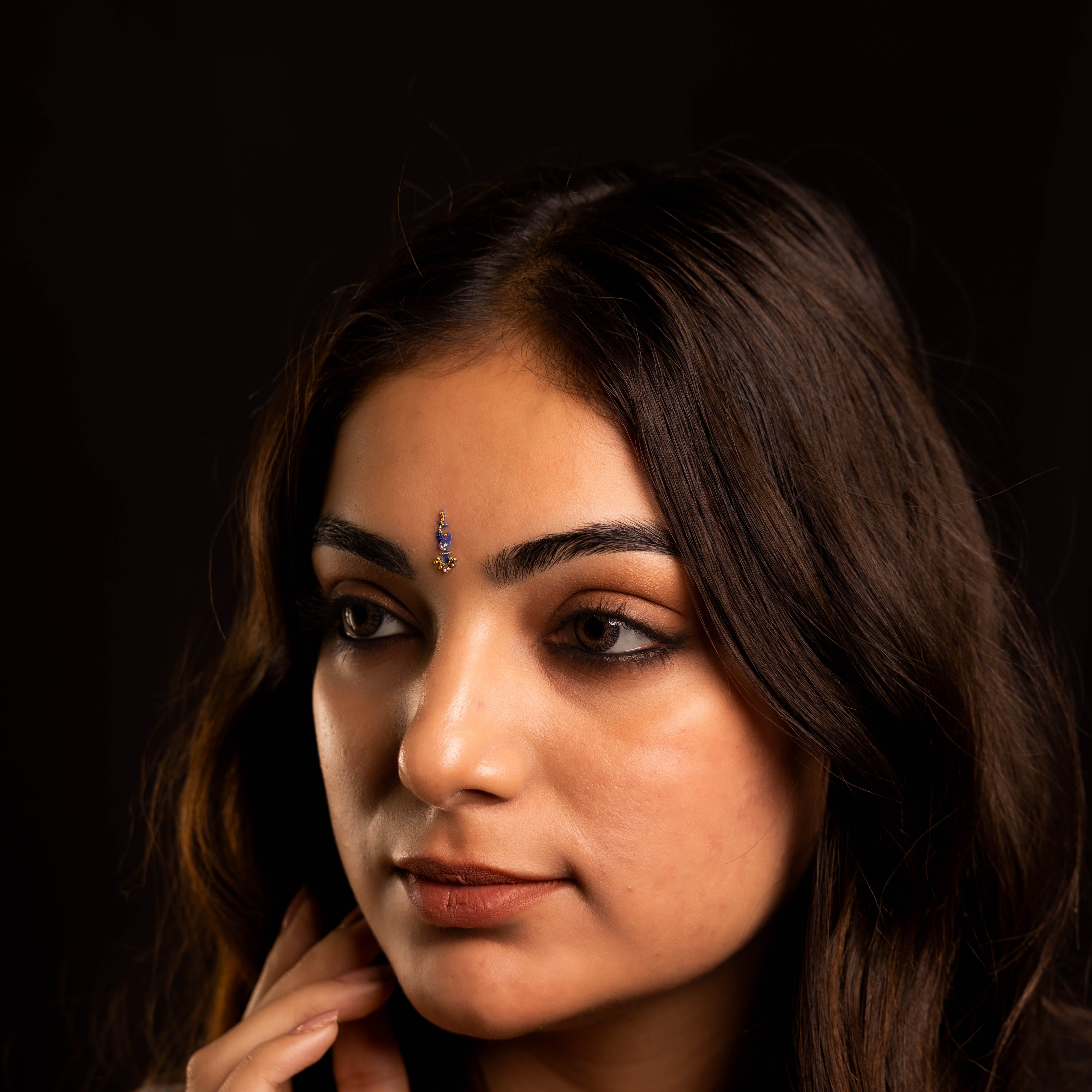 • To apply, gently remove the bindi from its backing and place it between the eyebrows.