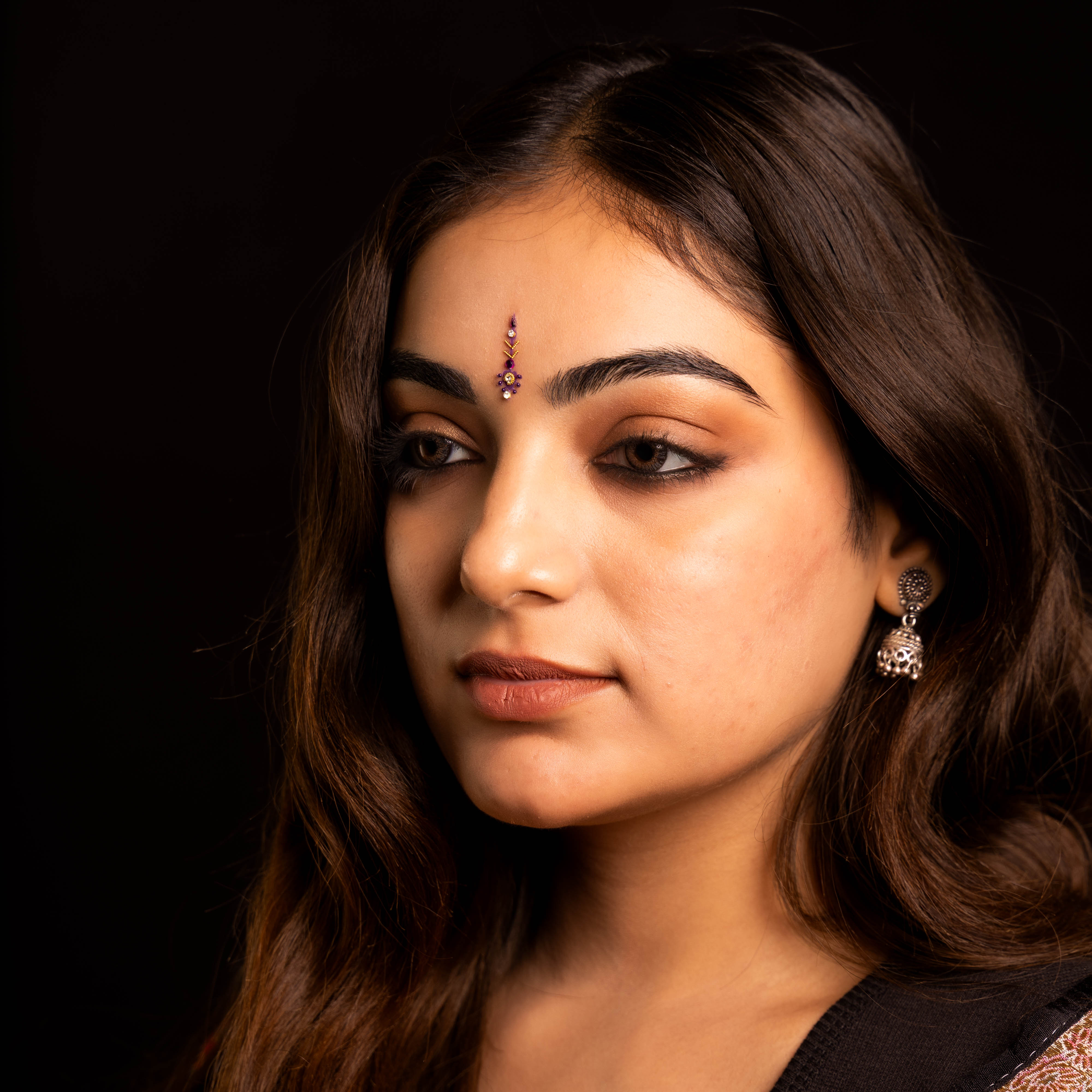 • To apply, gently remove the bindi from its backing and place it between the eyebrows.