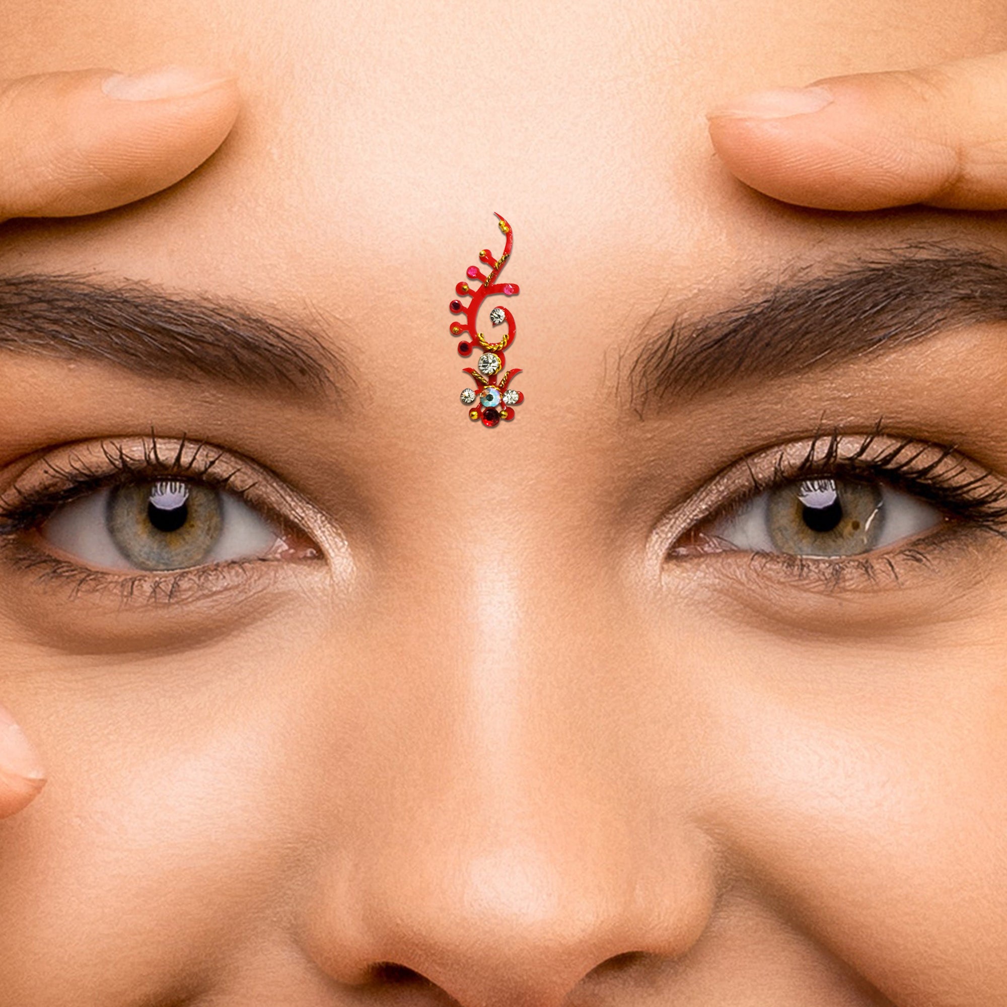 • To apply, gently remove the bindi from its backing and place it between the eyebrows.