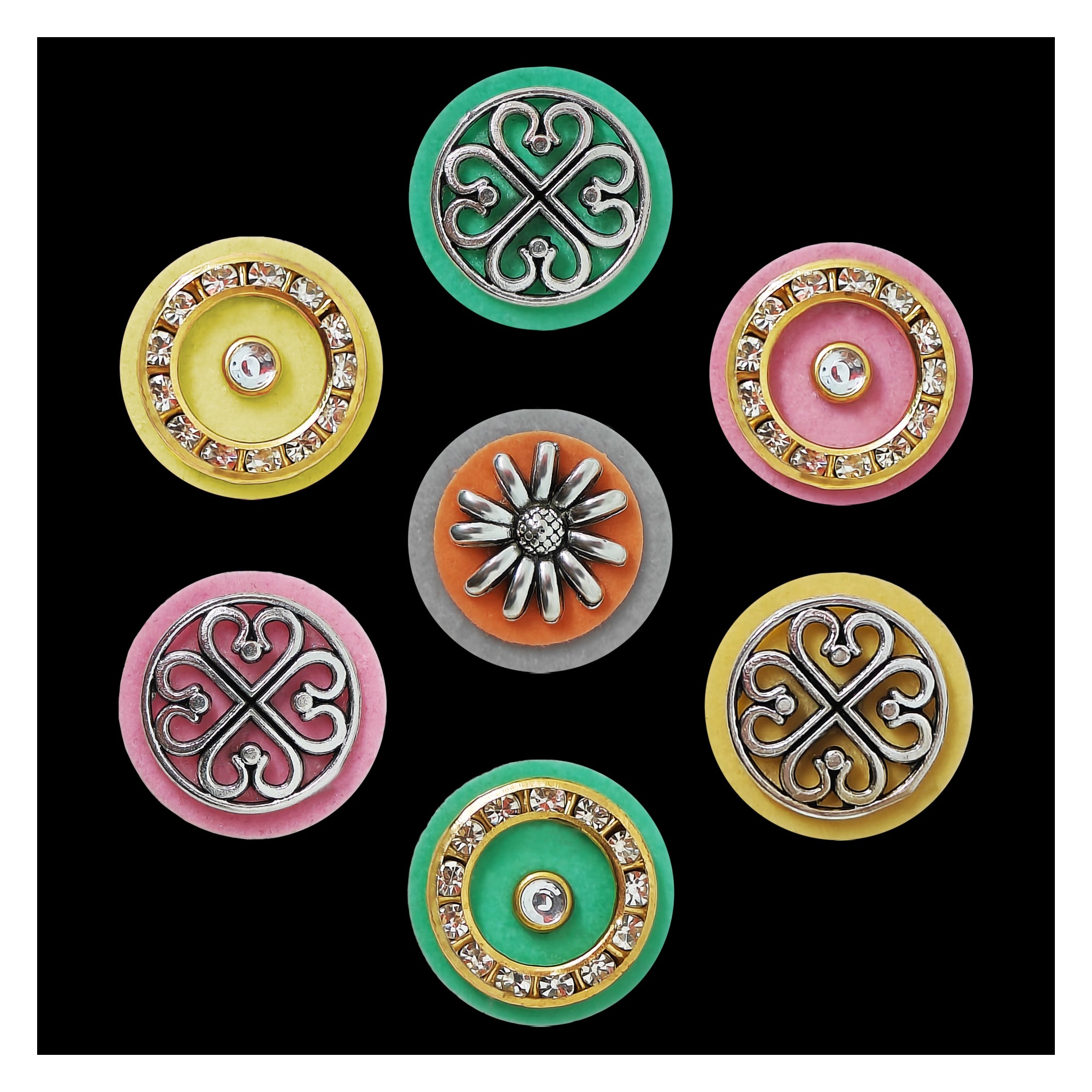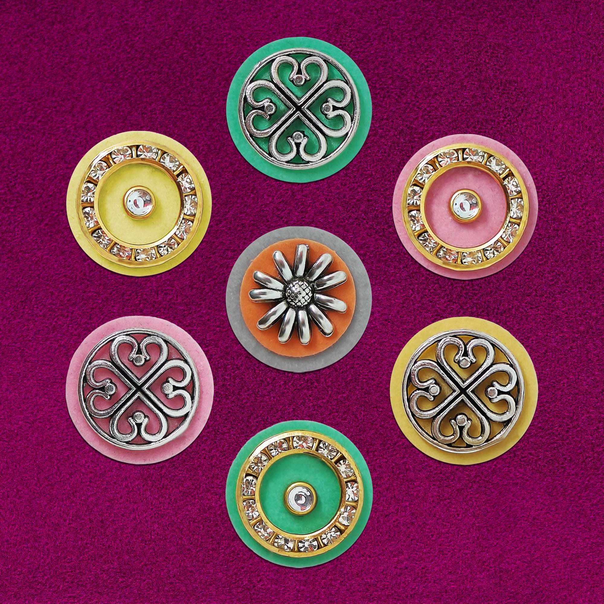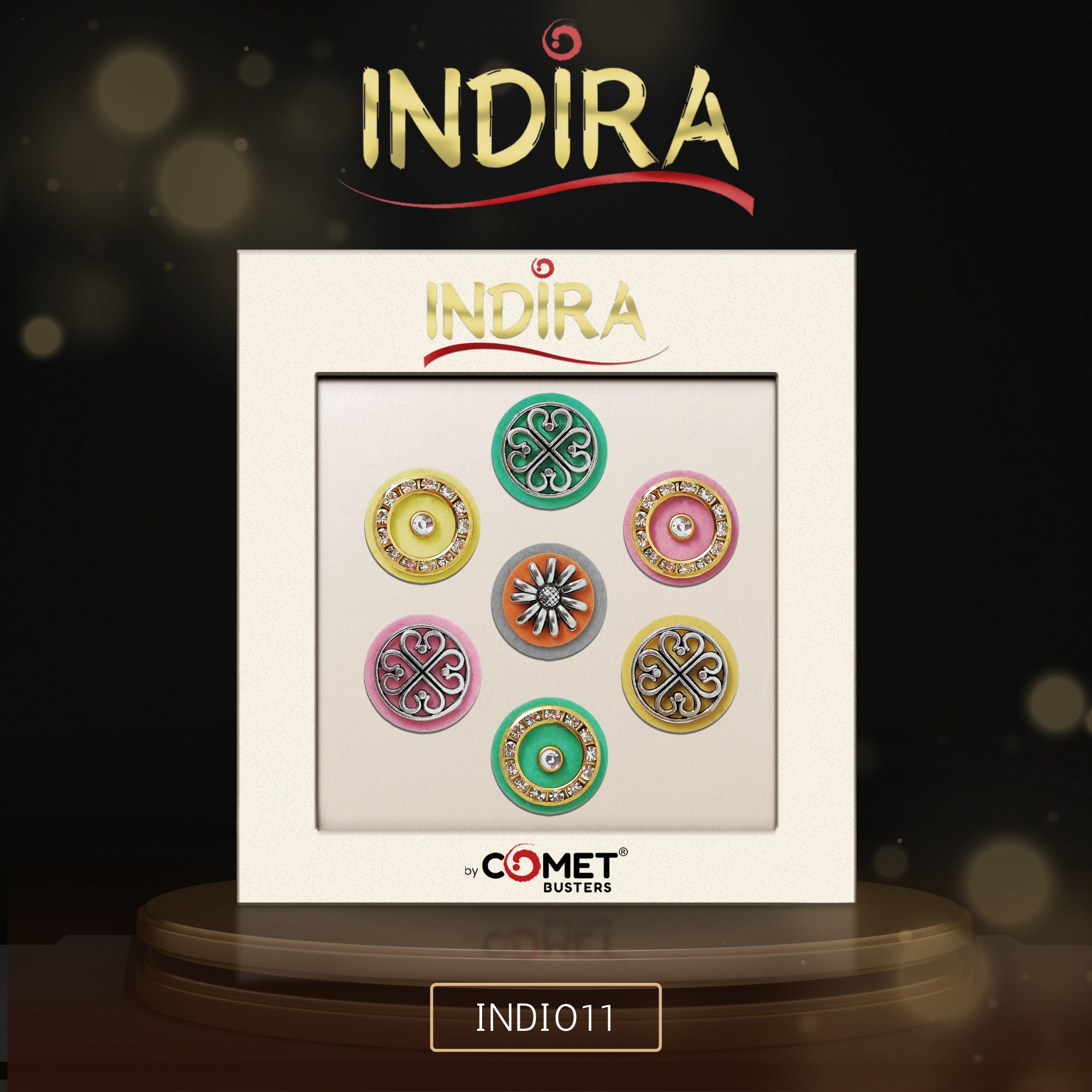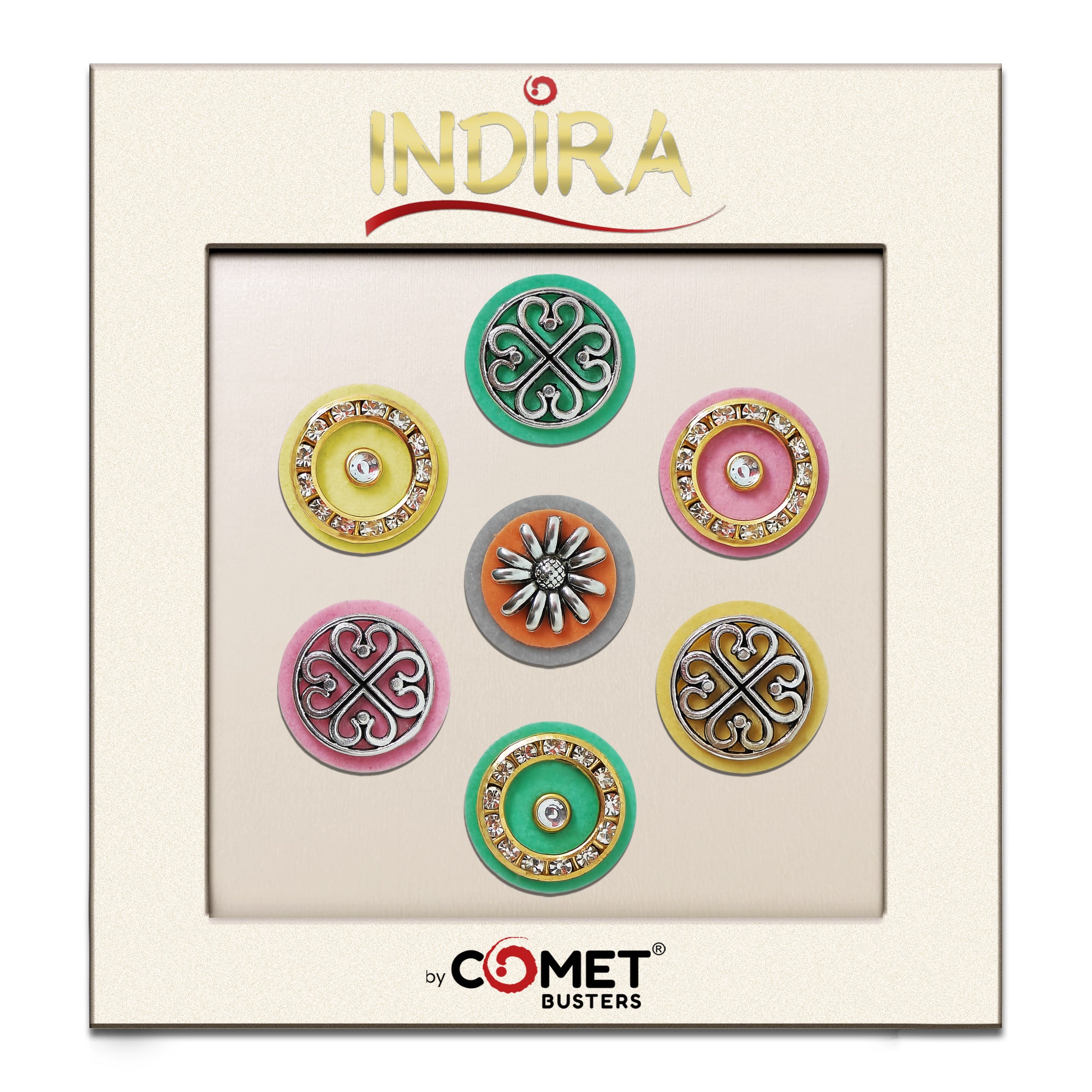 The Indira Artistic Designer Bindis by Comet Busters bring together elegance, creativity, and tradition. This exclusive pack of 7 reusable bindis features a mix of intricate metallic motifs, crystal embellishments, and floral patterns set on colorful velvet bases.