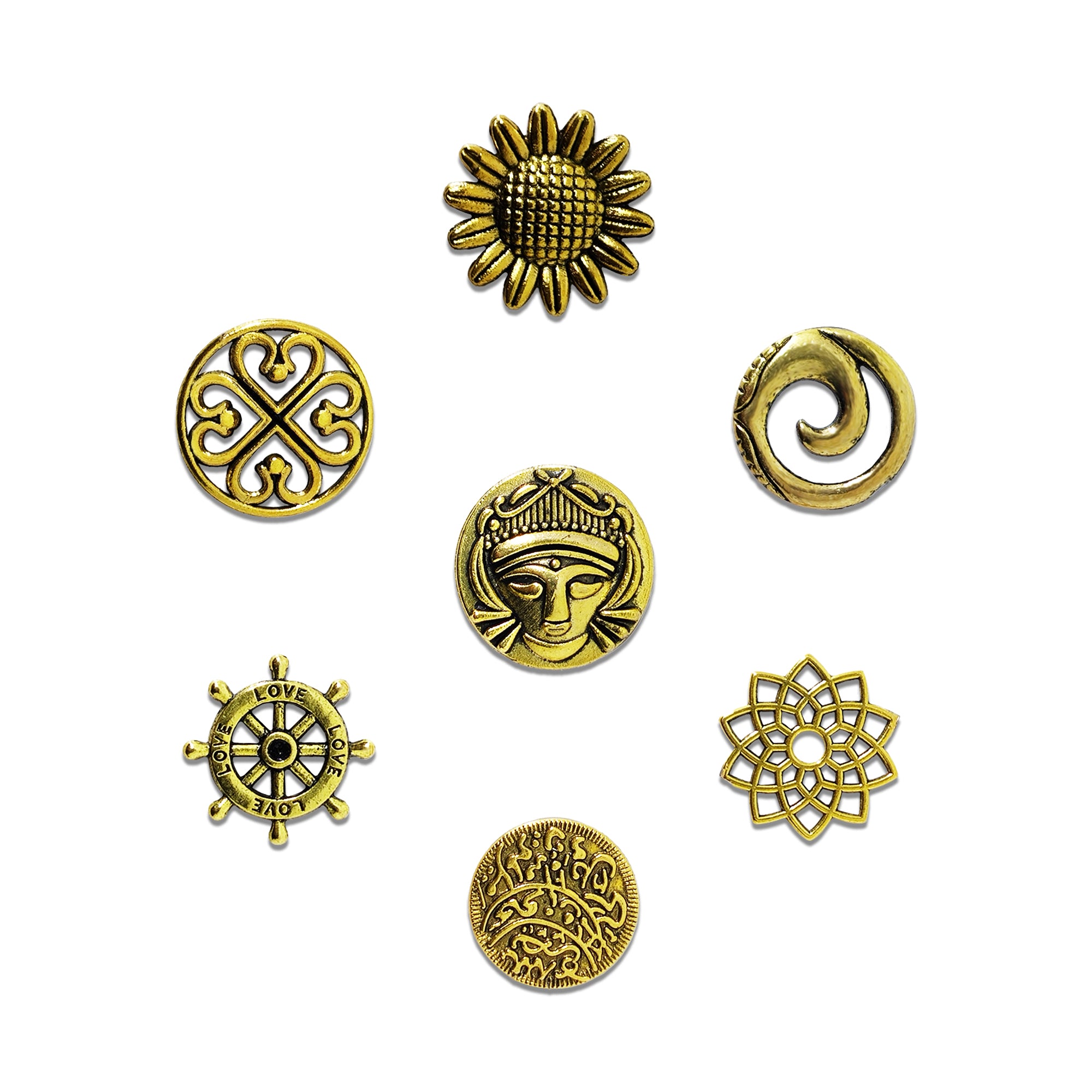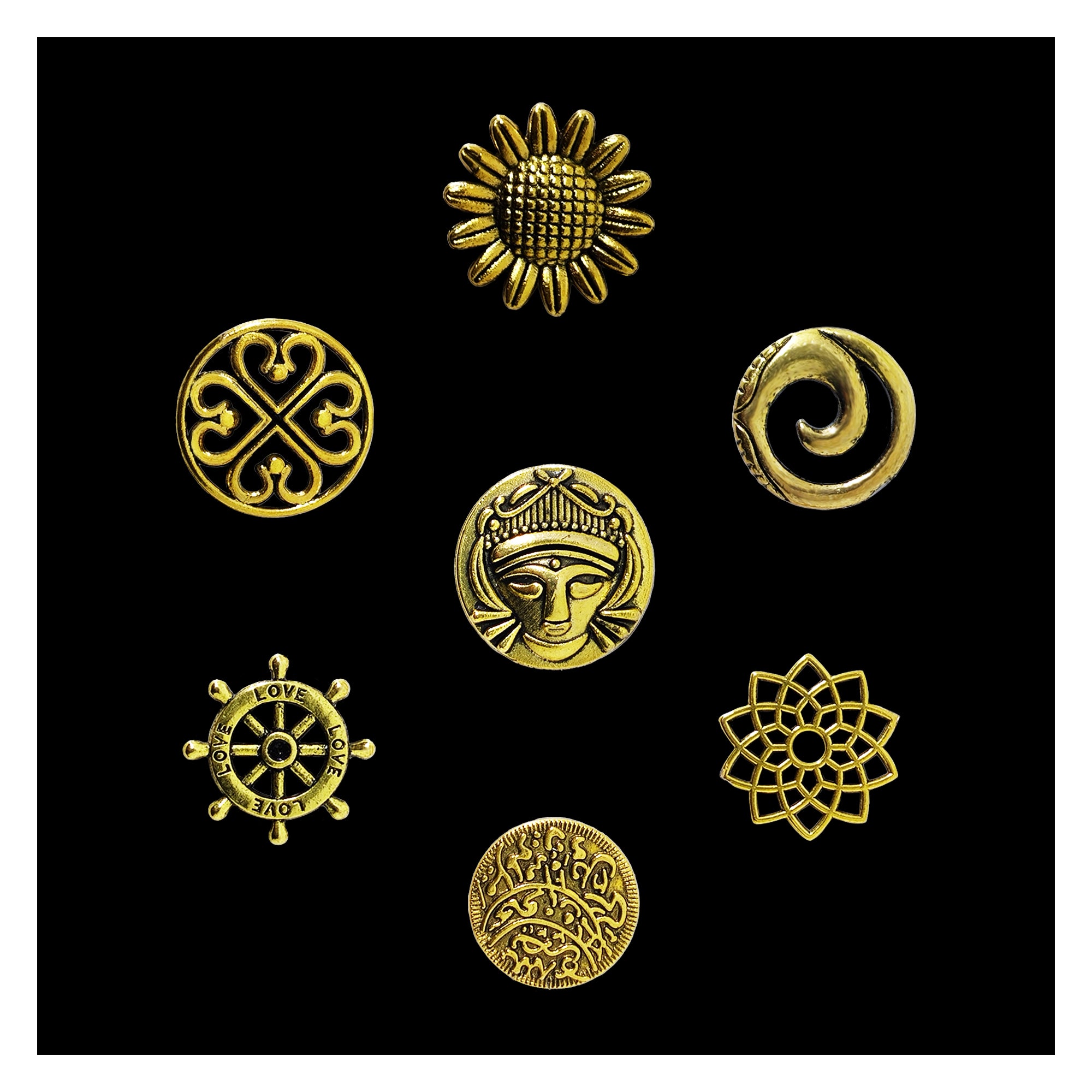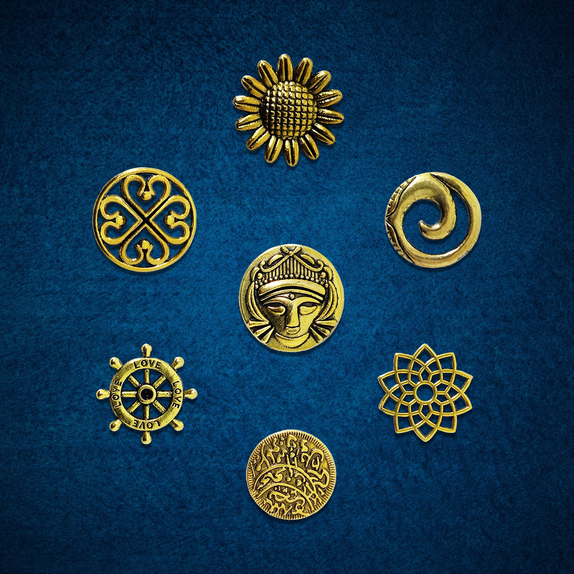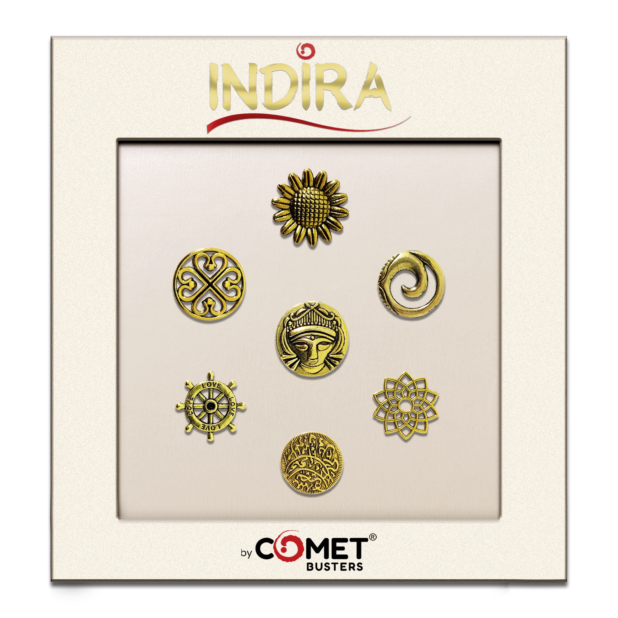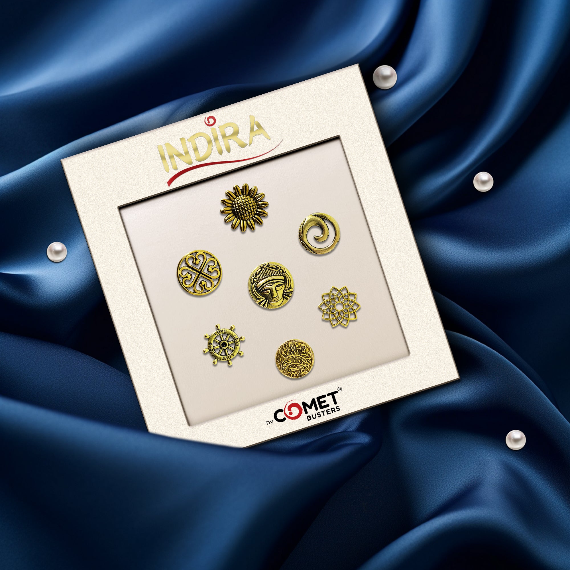 Indira Premium Designer Bindi set features exquisite antique gold metal bindis in unique symbolic designs, including floral, spiral, wheel, geometric, and heritage motifs. Crafted with fine detailing and a rich gold finish, these statement bindis add a regal touch to festive, bridal, and ethnic looks. Lightweight, skin-safe, and reusable.