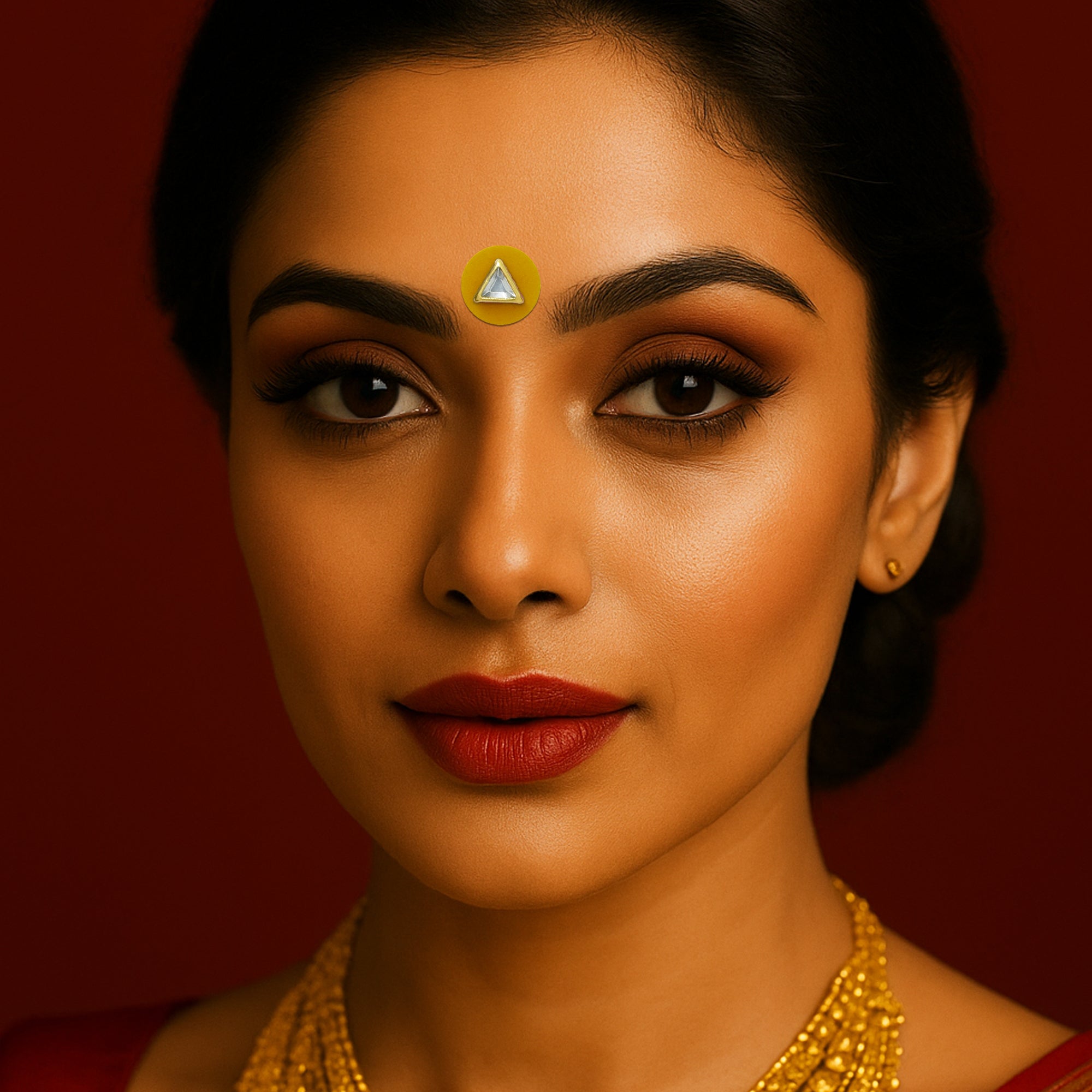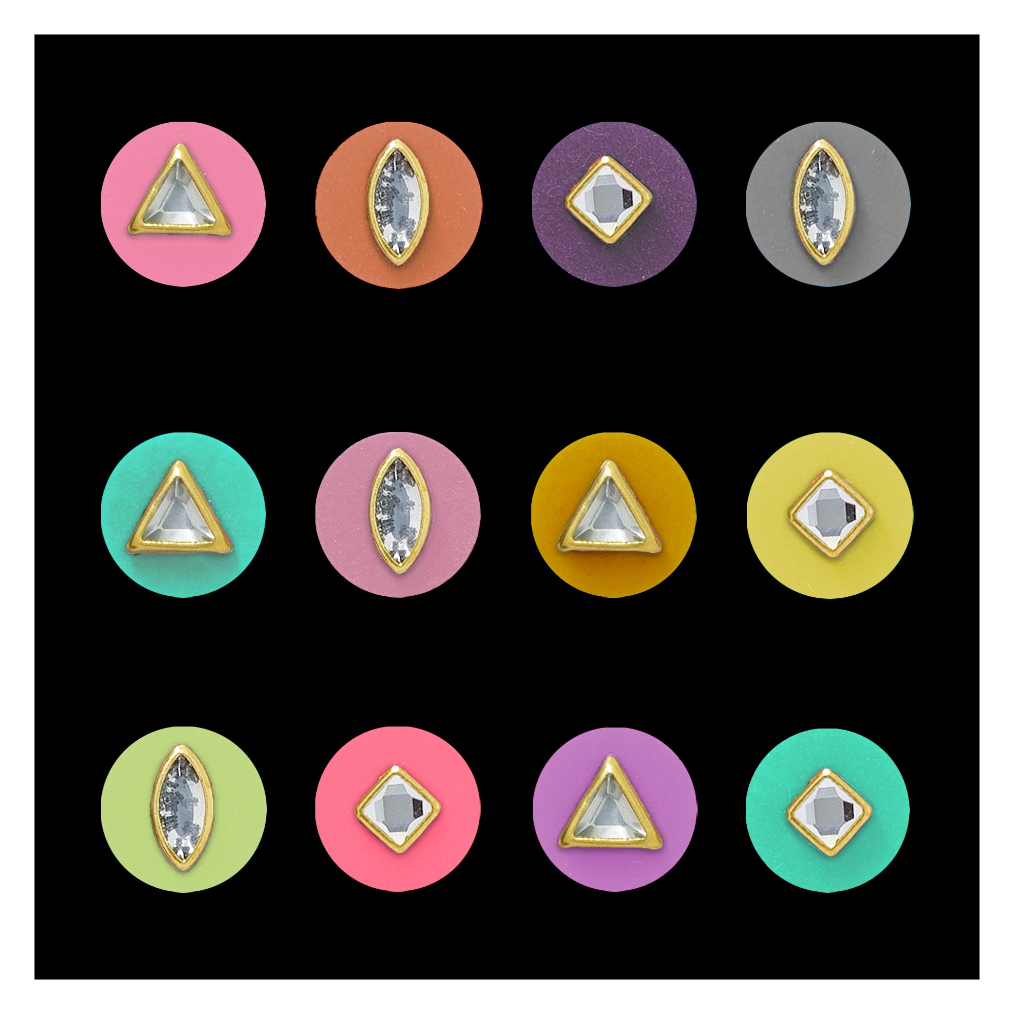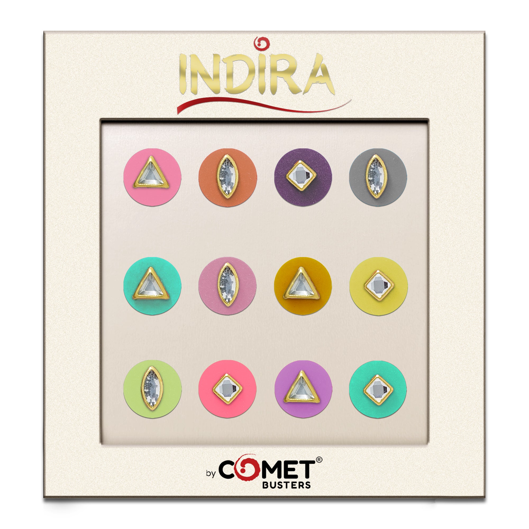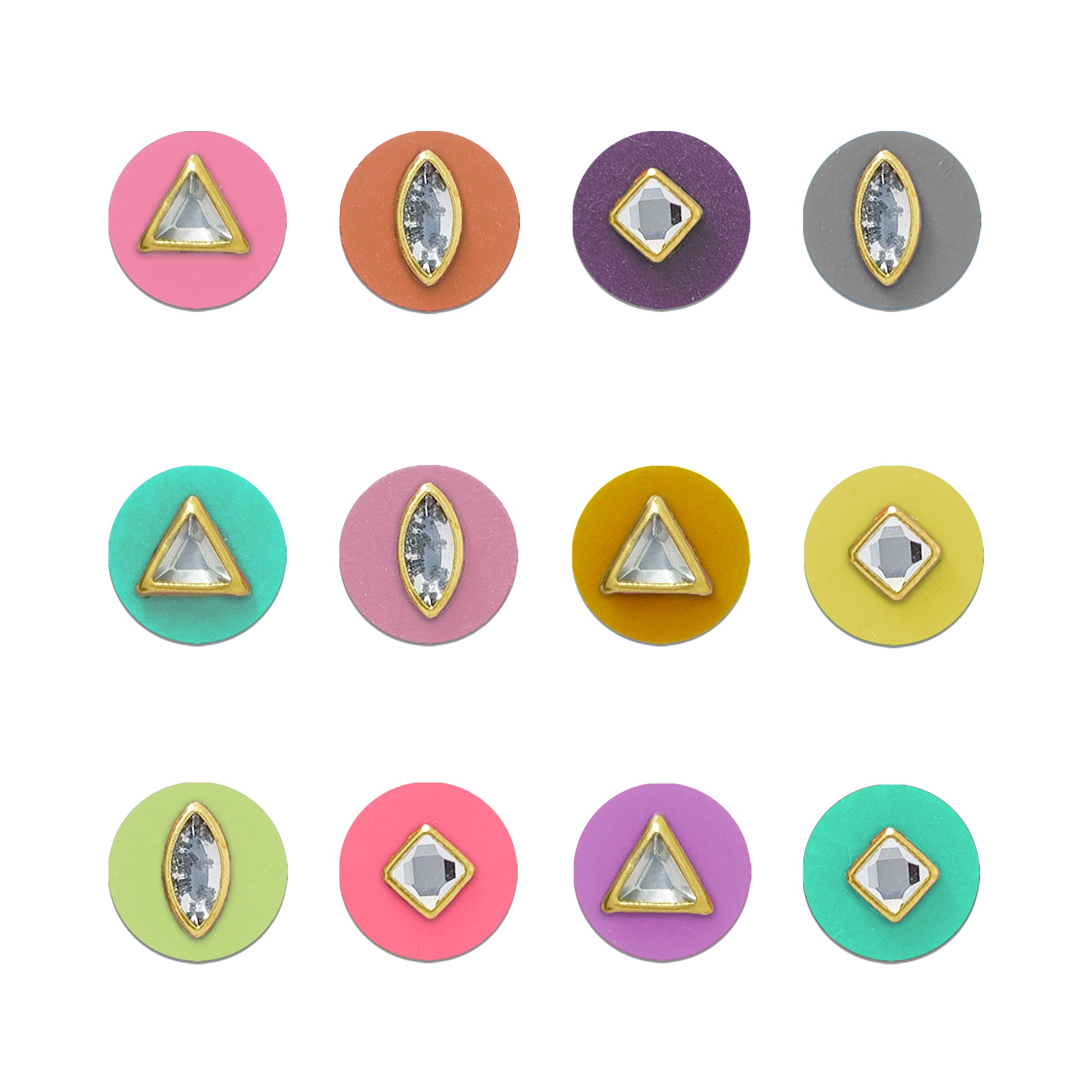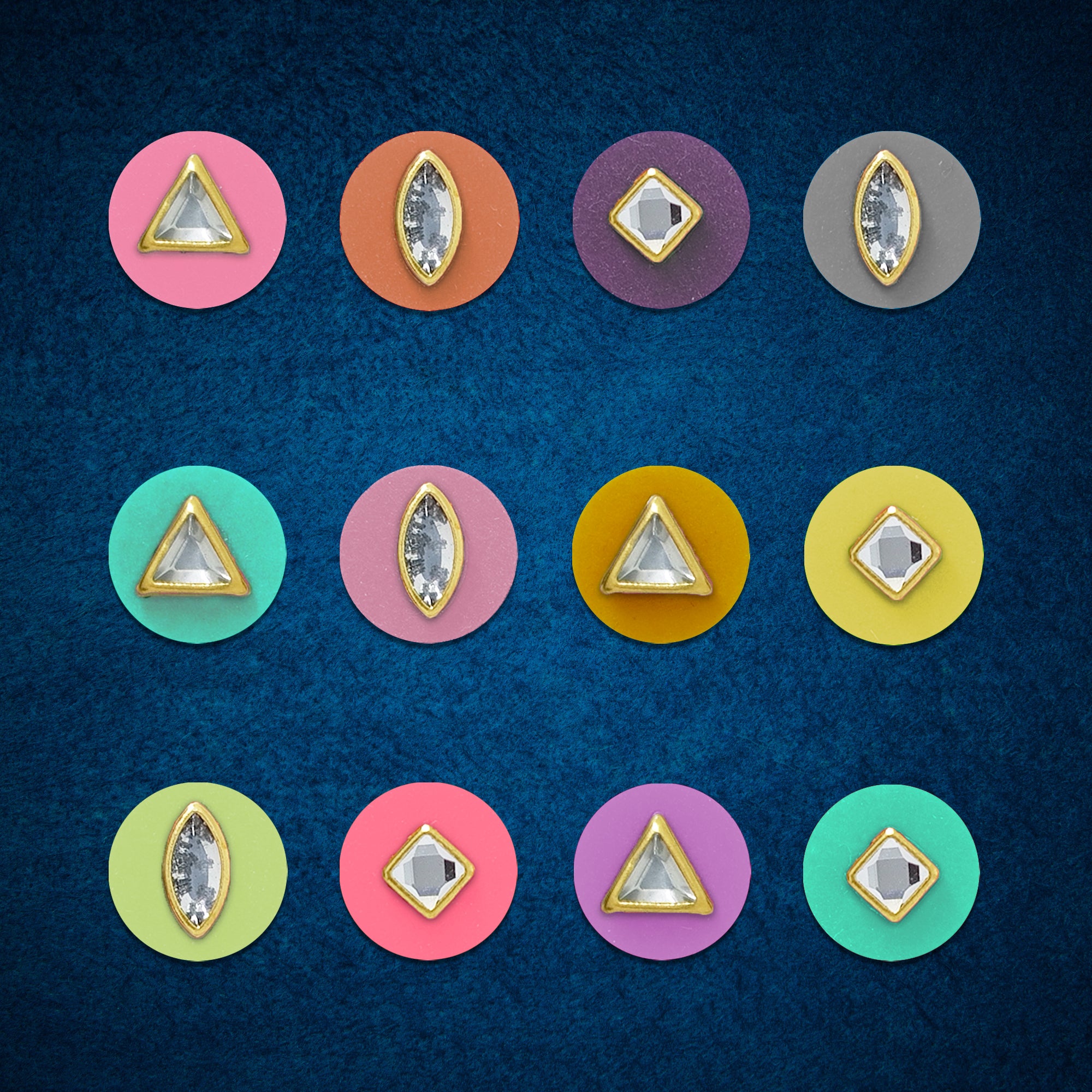 Delicate, modern, and effortlessly elegant — this Indira pastel crystal bindi set features finely cut crystal stones framed in gold-toned metal, placed on soft pastel round bases. Designed for contemporary ethnic styling, these bindis blend subtle colour with refined shine, making them perfect for festive looks, day weddings, brunch wear, and fusion outfits.