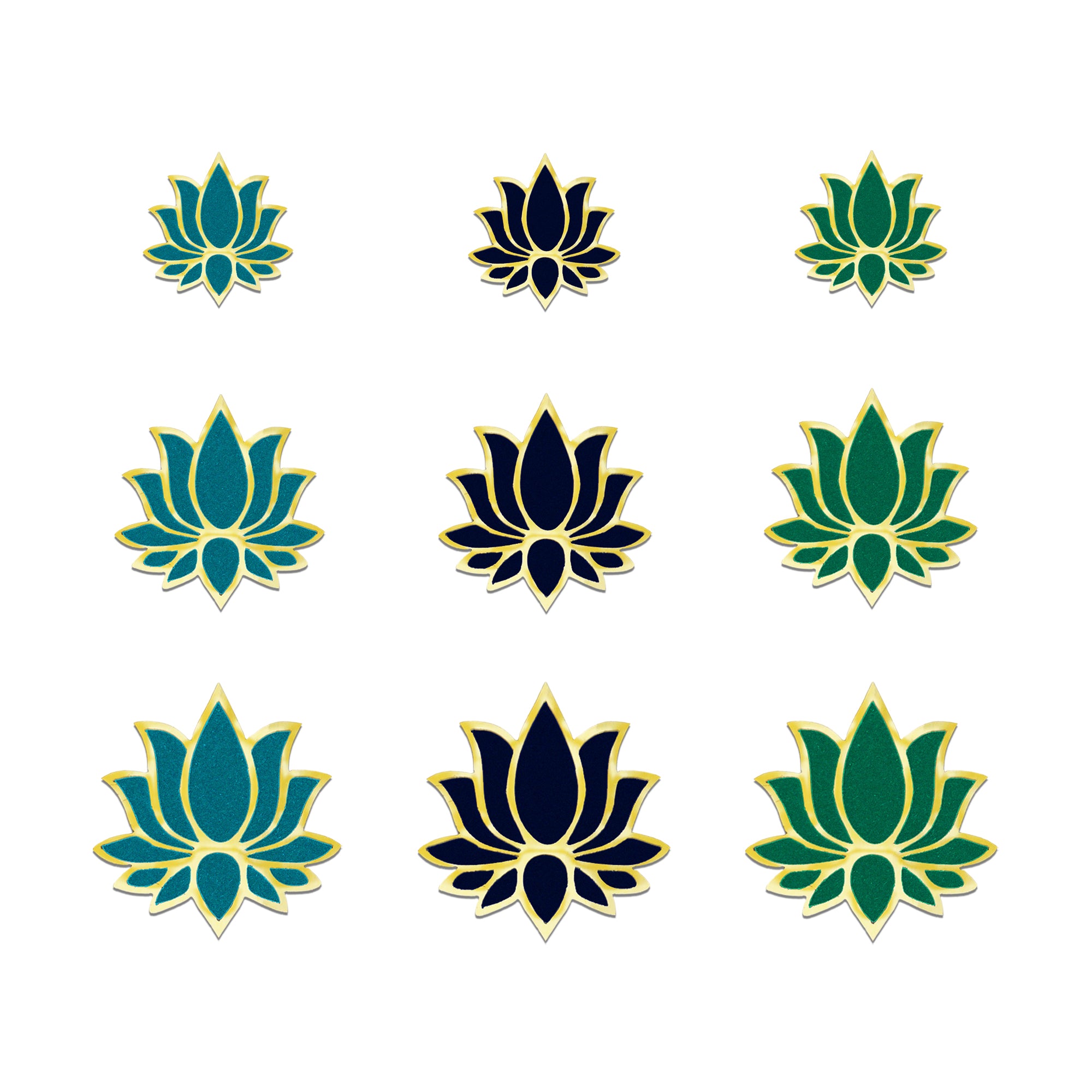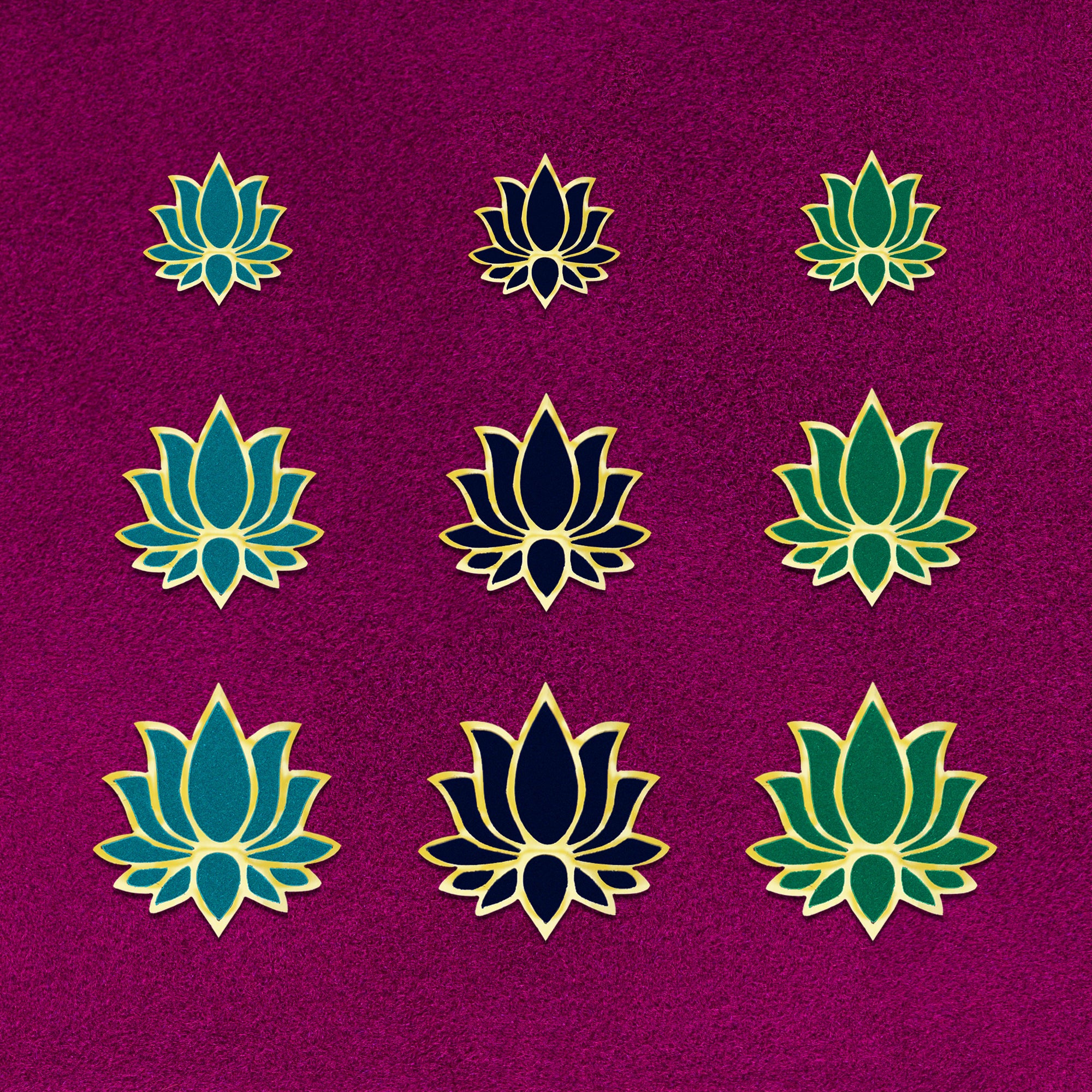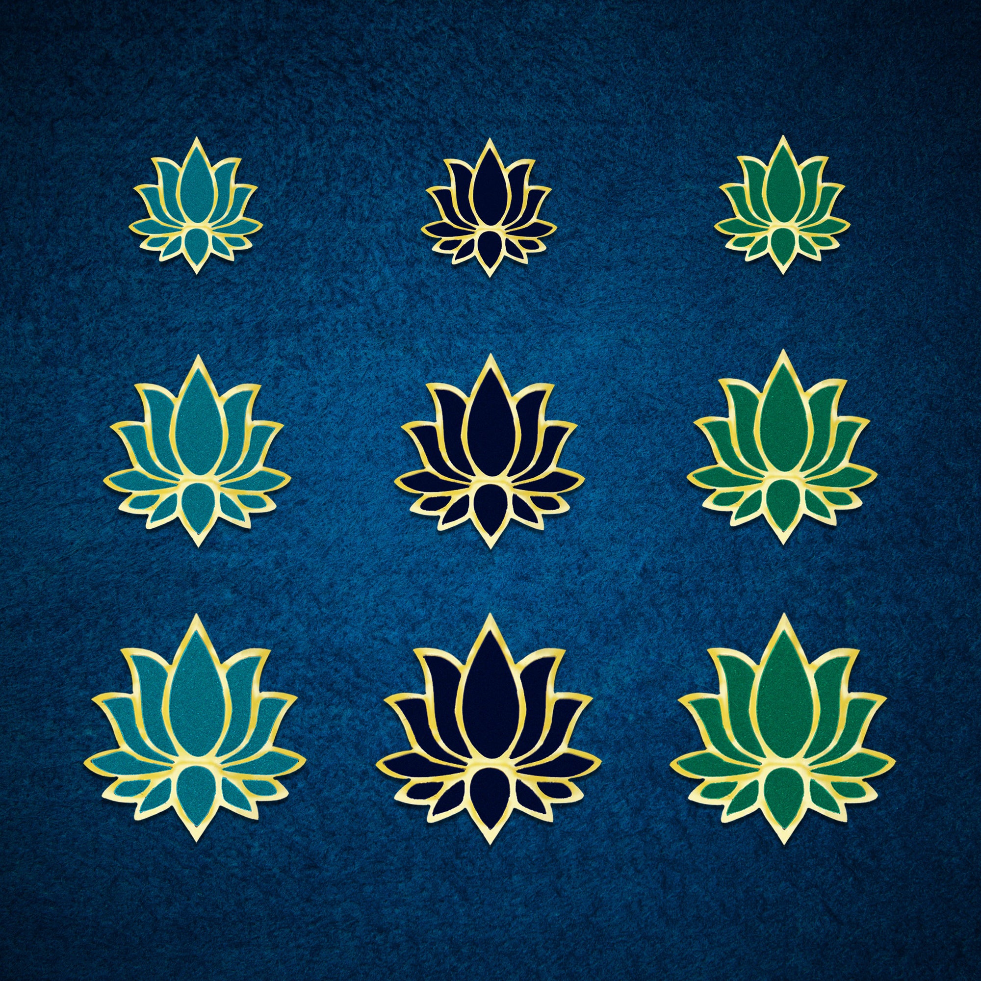 Lotus motifs in teal blue, navy blue, and emerald green