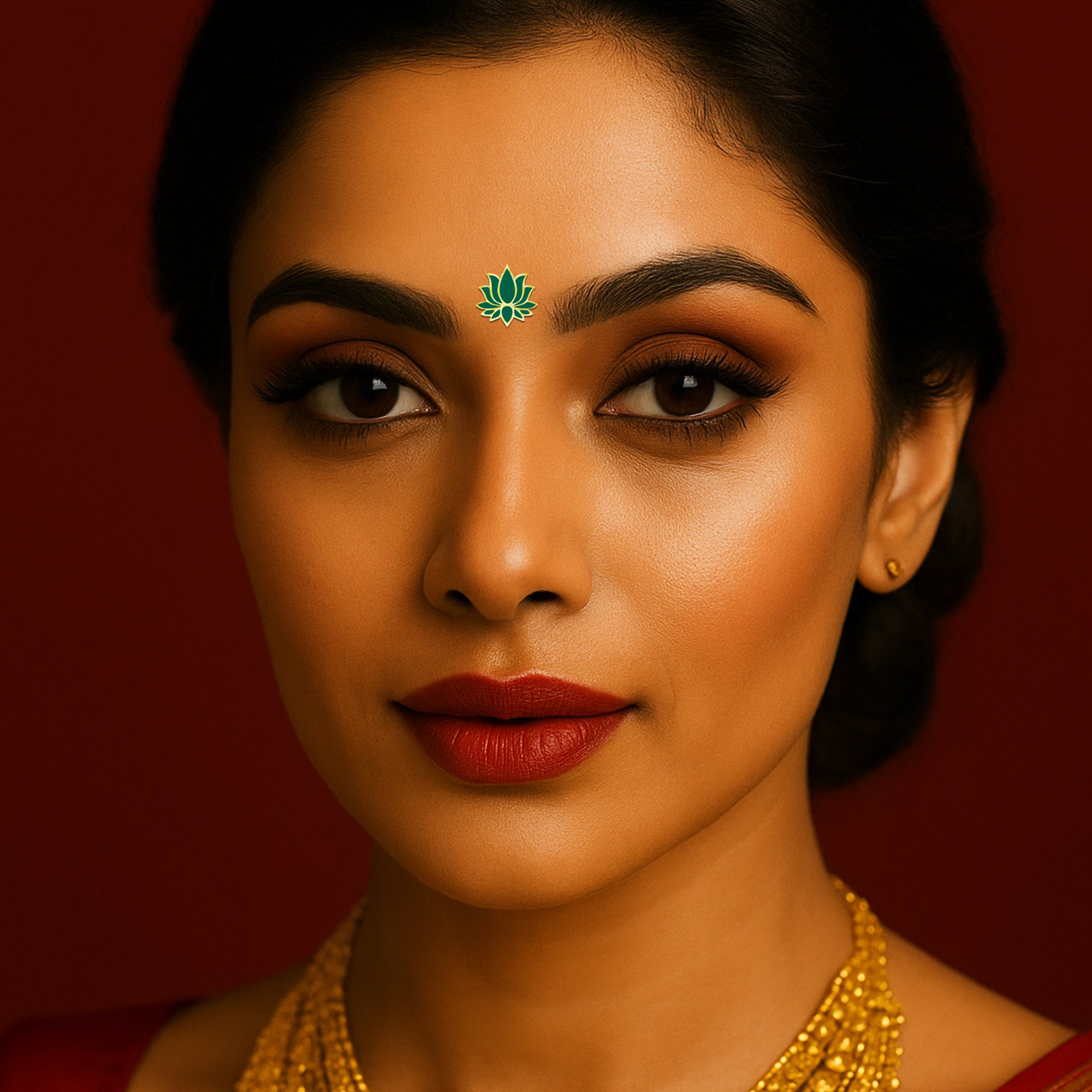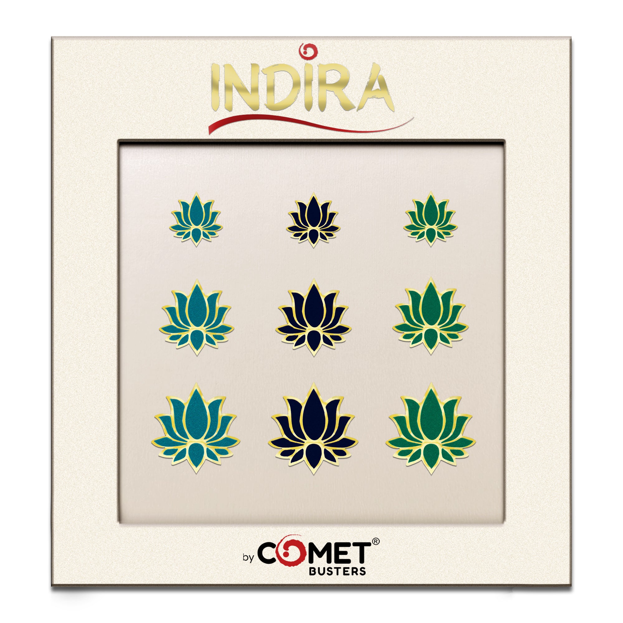 Bold, serene, and beautifully detailed — this Indira lotus bindi set features rich shades of teal blue, navy blue, and deep green, each outlined with elegant gold. Designed in three sizes, these bindis bring a sophisticated yet traditional touch to festive wear, classical dance, temple looks, and everyday ethnic styling.