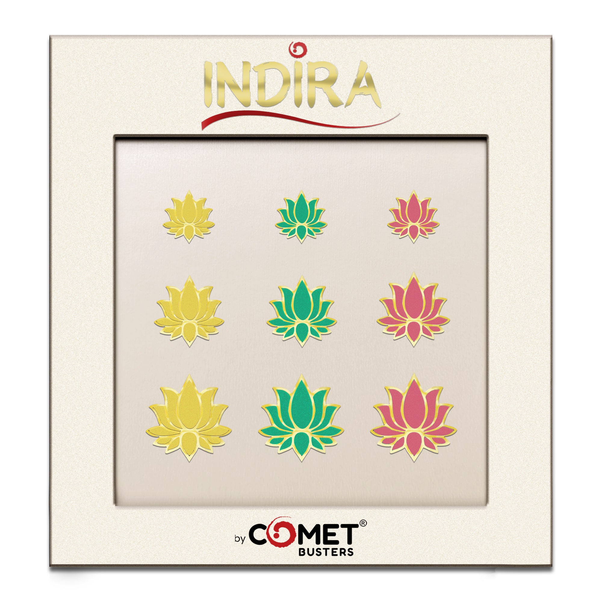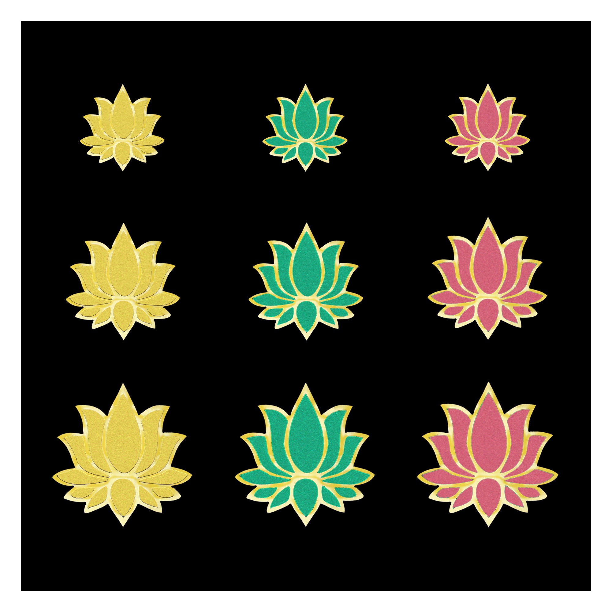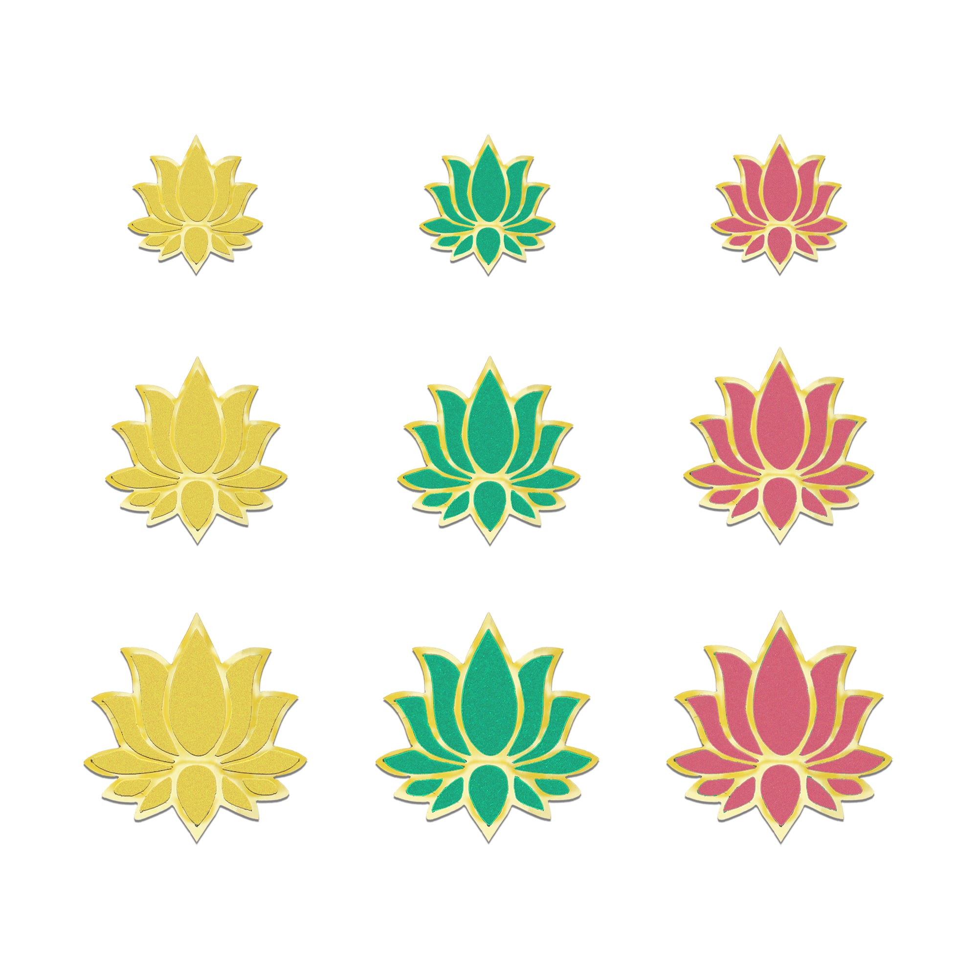 Soft, graceful, and beautifully detailed — this Indira lotus bindi set is crafted in soothing pastel shades of yellow, green, and pink, each outlined with fine gold detailing. Available in three elegant sizes, these pastel lotus bindis bring a fresh, modern yet traditional charm to festive wear, temple visits, classical dance, and everyday ethnic looks.