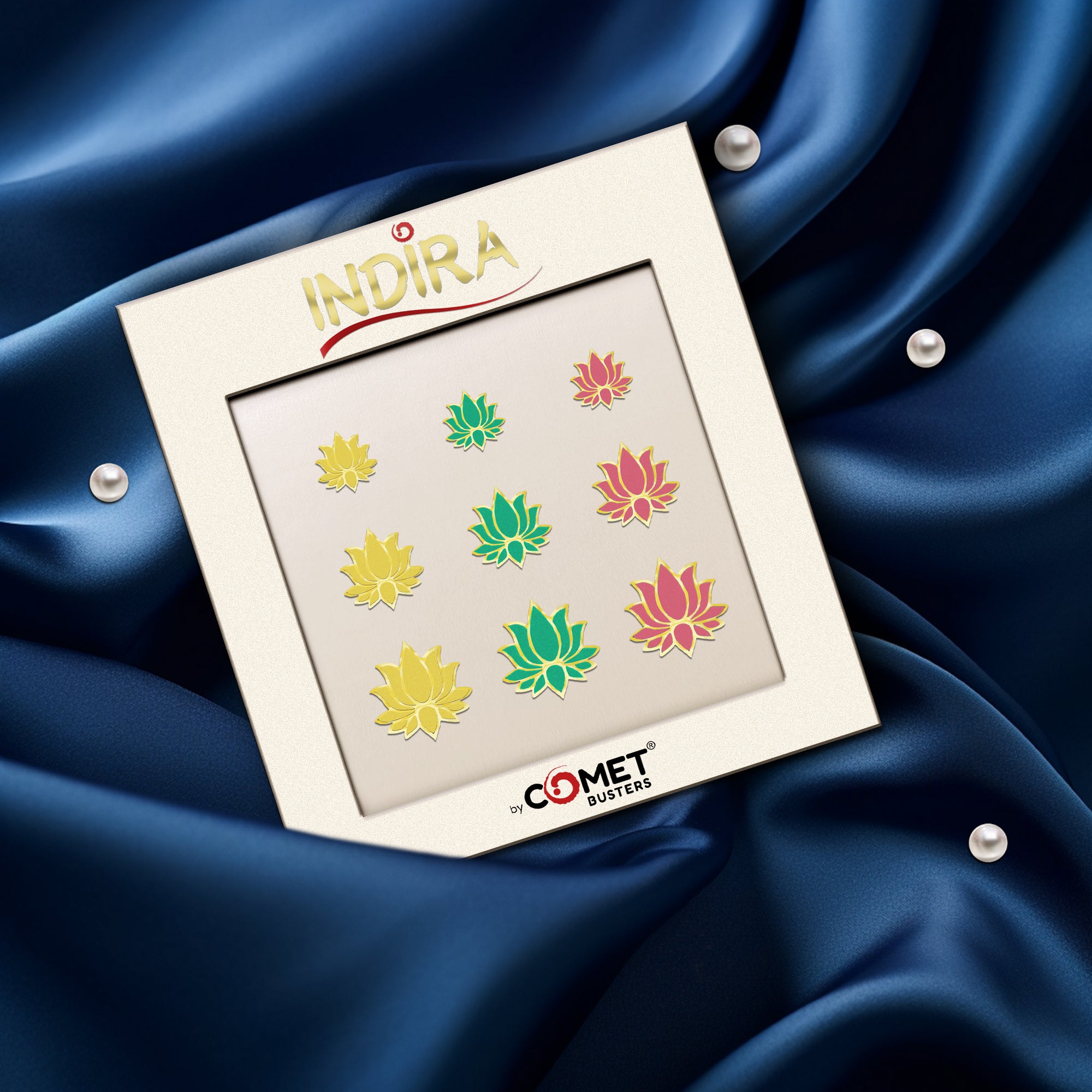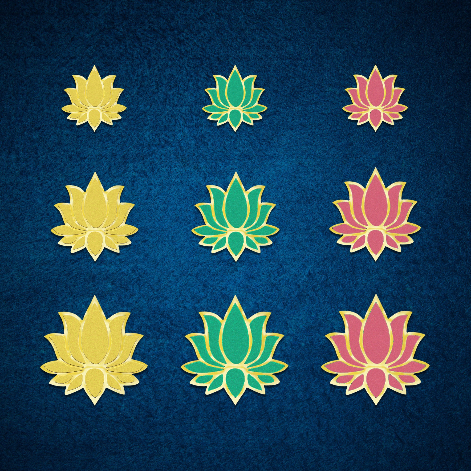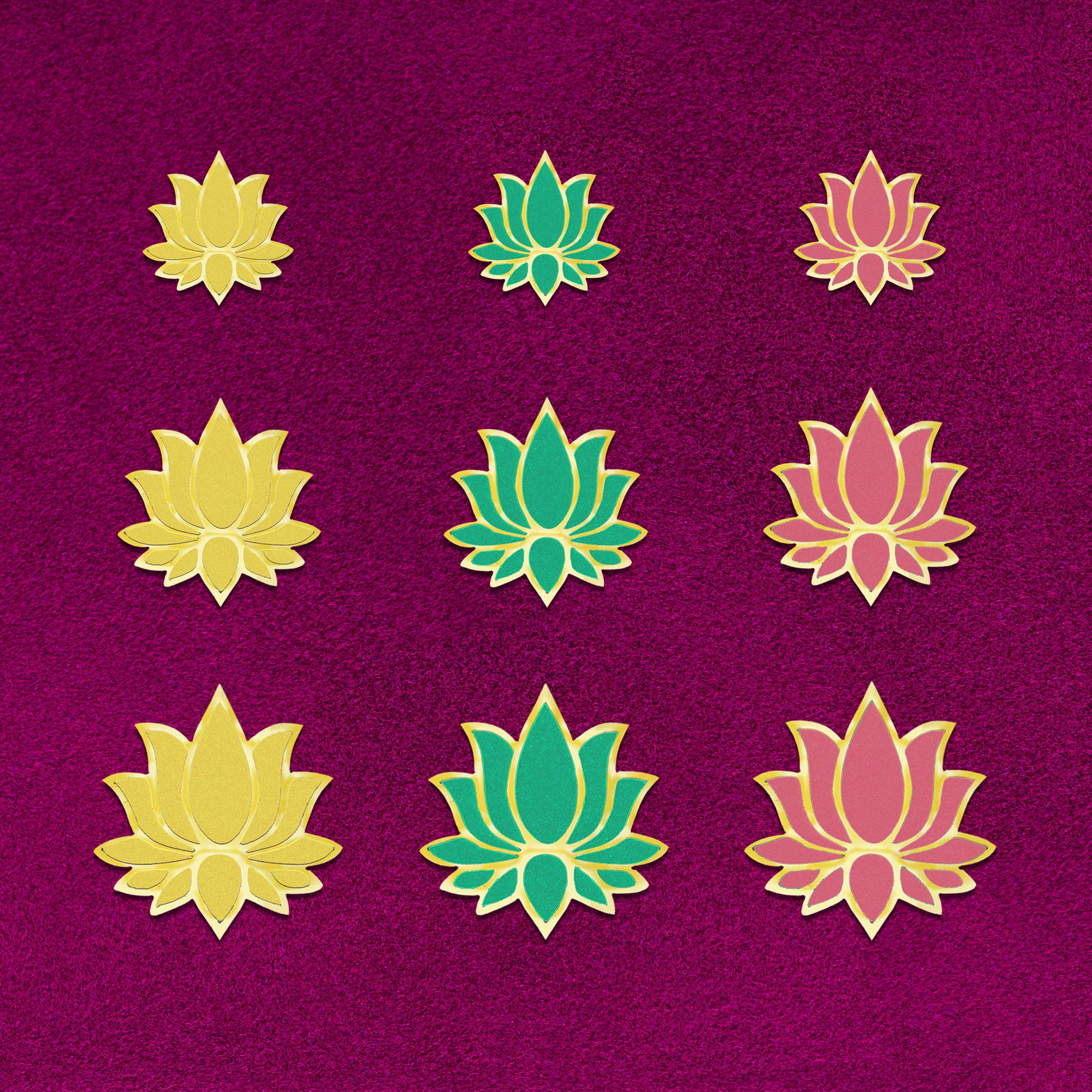 Soft, graceful, and beautifully detailed — this Indira lotus bindi set is crafted in soothing pastel shades of yellow, green, and pink, each outlined with fine gold detailing. Available in three elegant sizes, these pastel lotus bindis bring a fresh, modern yet traditional charm to festive wear, temple visits, classical dance, and everyday ethnic looks.