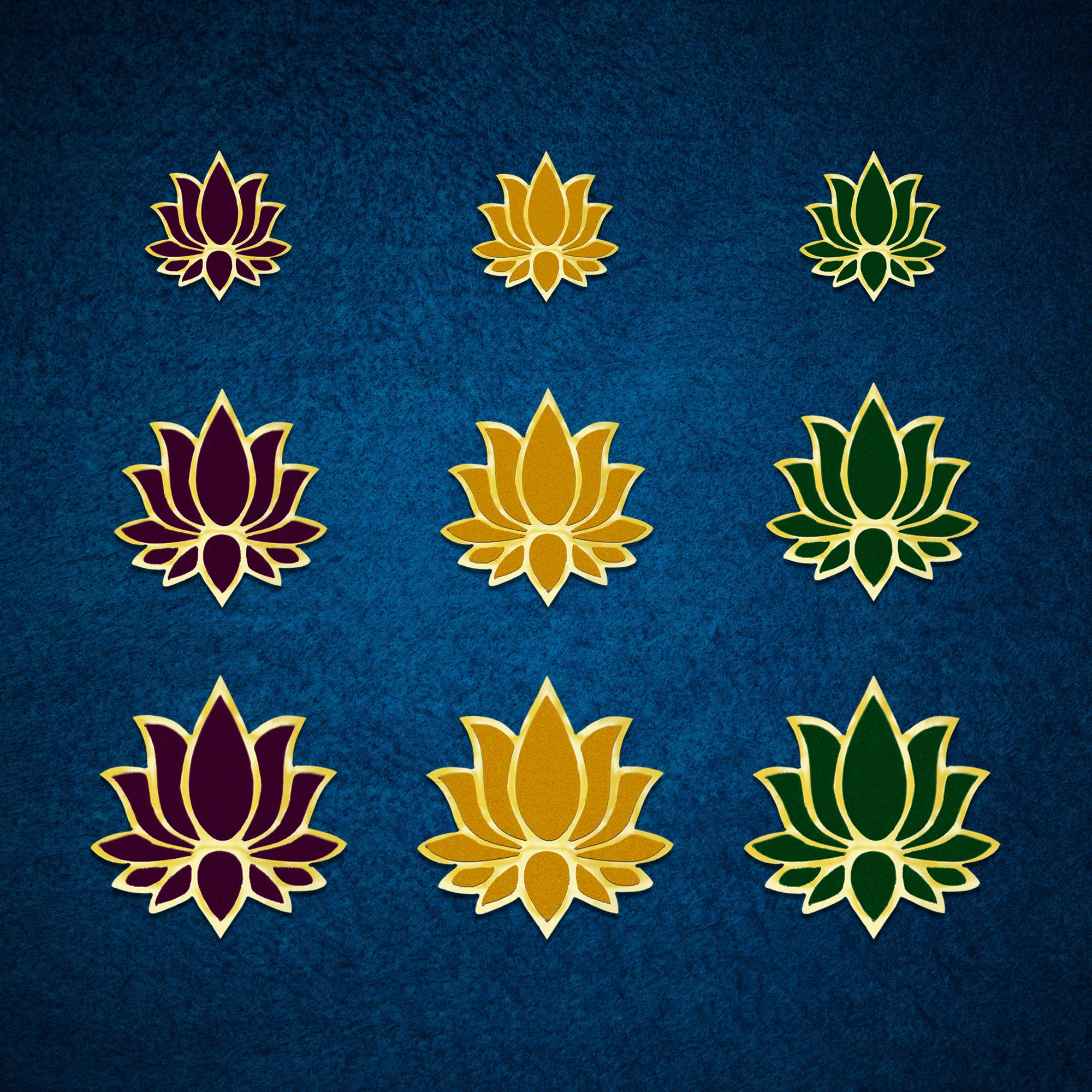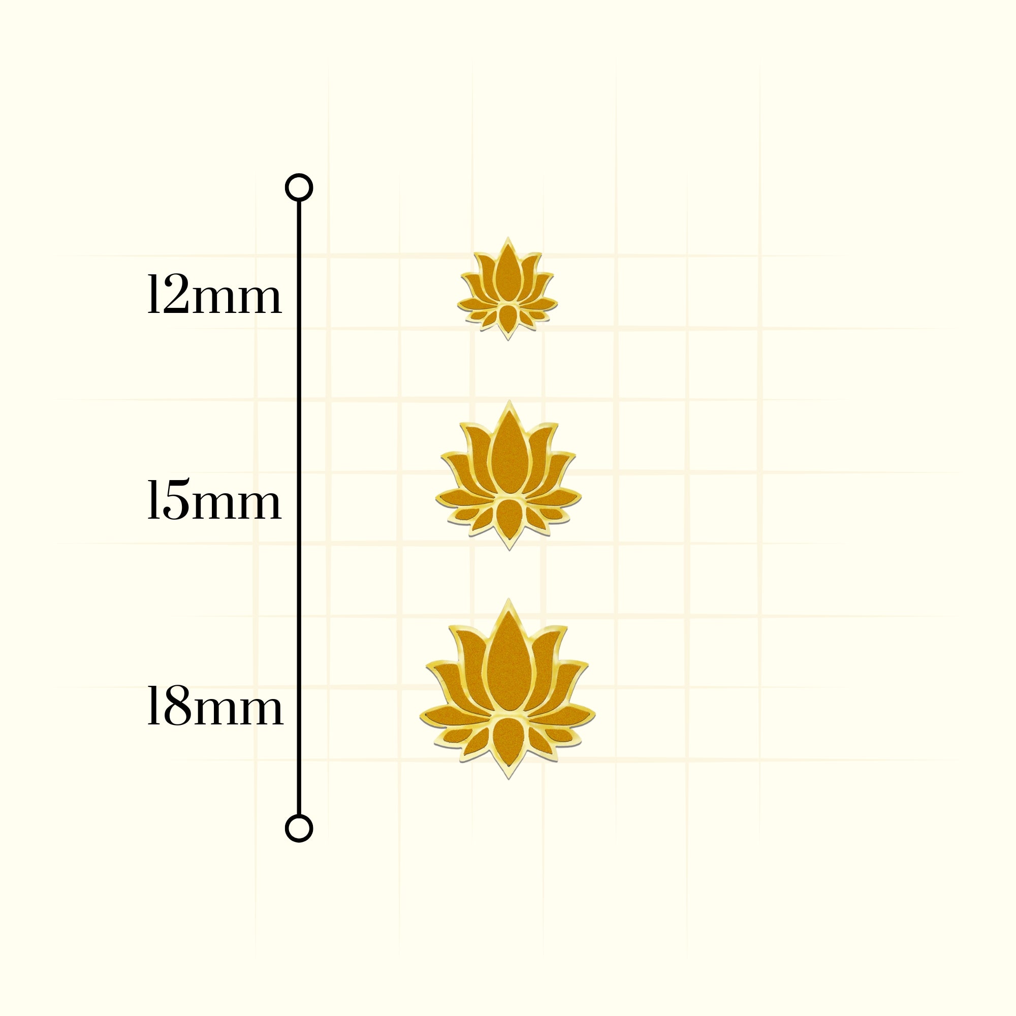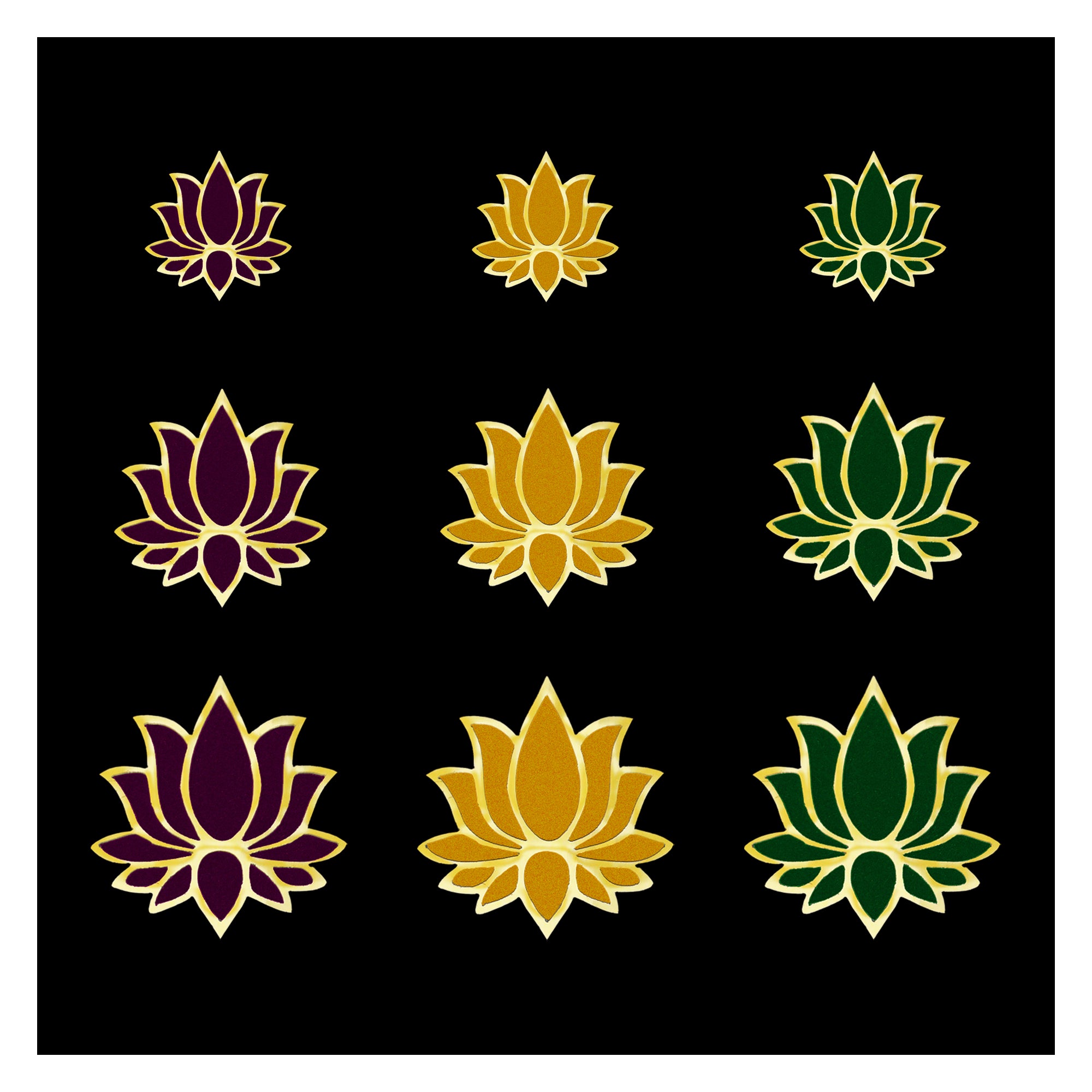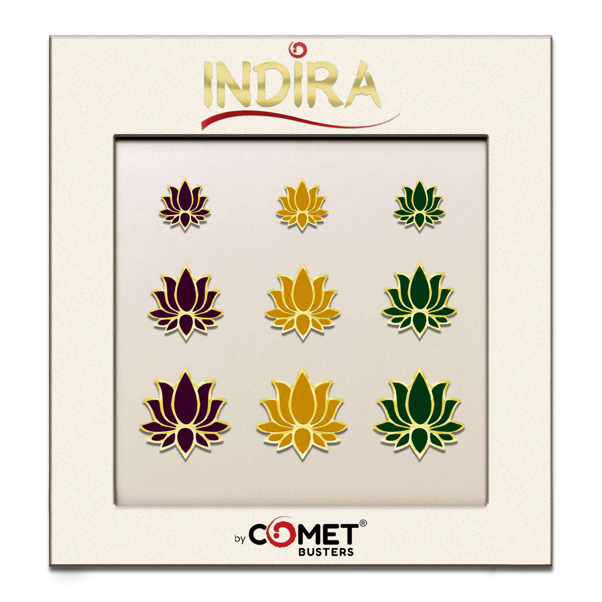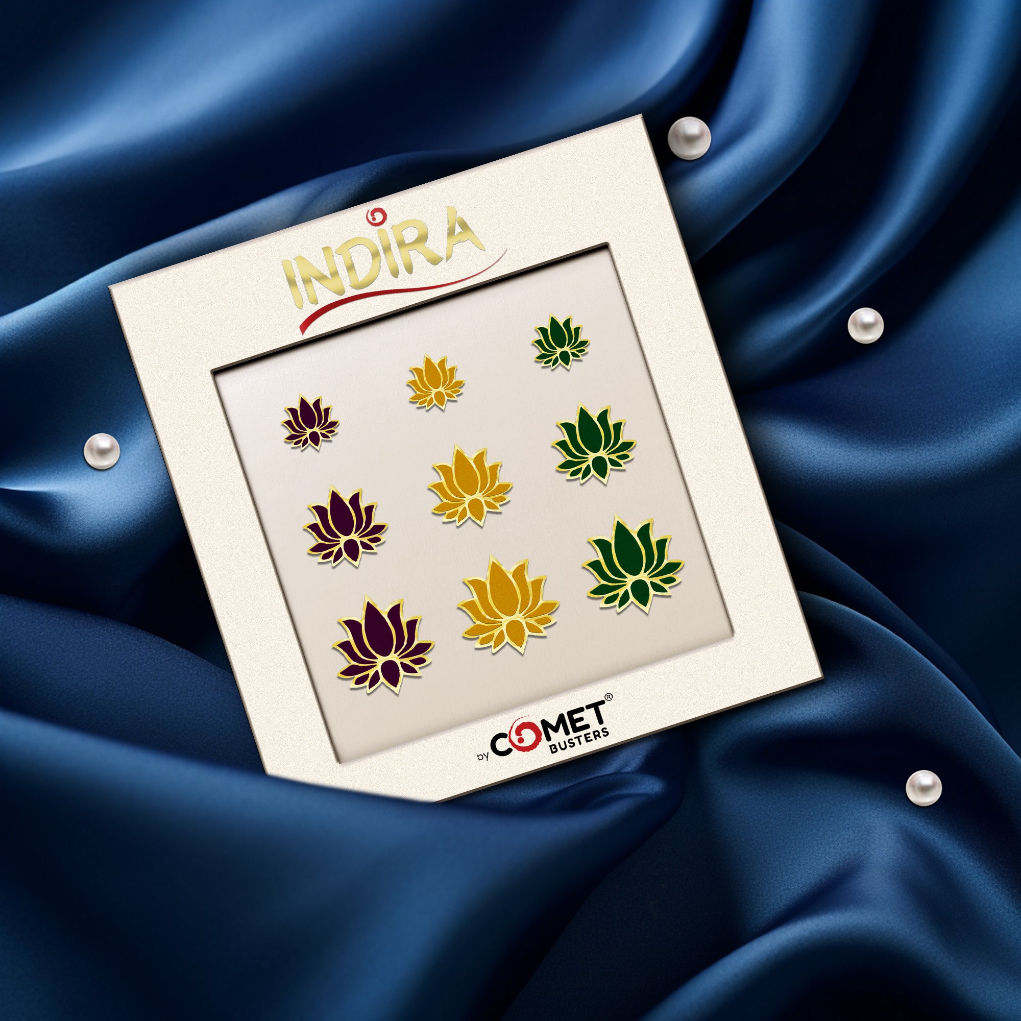 Rich, traditional, and exquisitely detailed — this Indira lotus bindi set features festive shades of purple, mustard yellow, and deep green, each outlined with elegant gold. Designed in three versatile sizes, these lotus bindis add a divine, regal charm to weddings, festive celebrations, classical dance, temple looks, and elevated everyday ethnic styling.