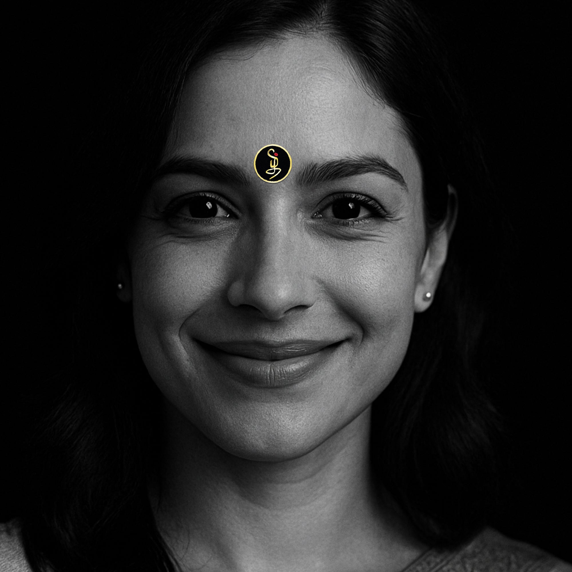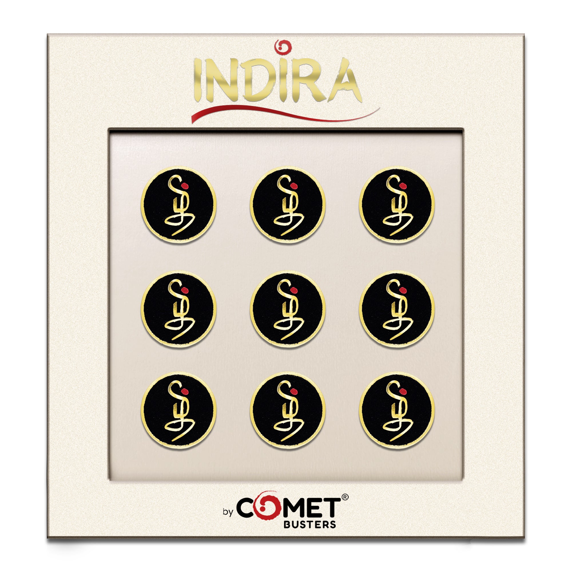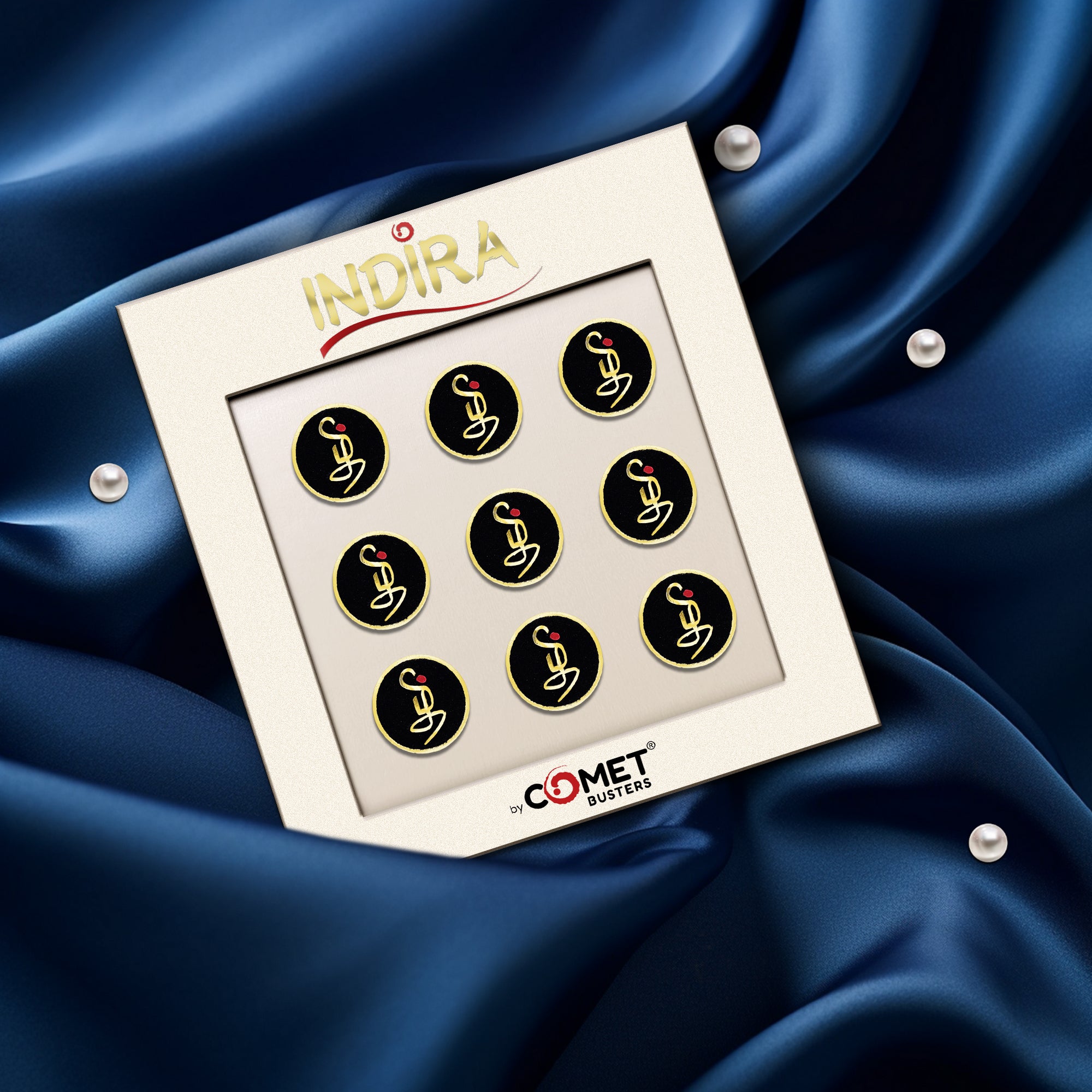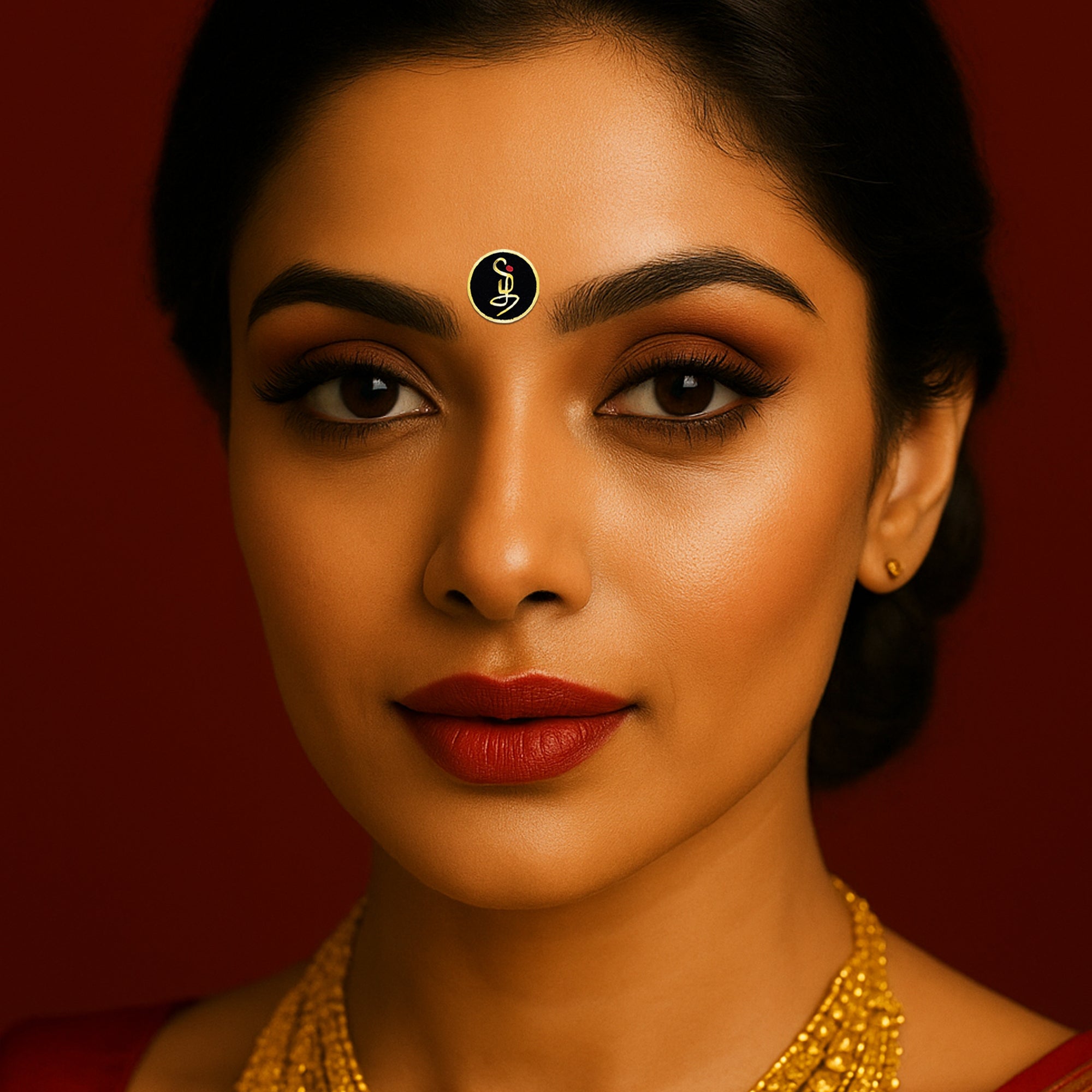 Elevate your ethnic look with this exquisite Indira bindi featuring a stylised Tamil-inspired symbol in elegant gold detailing and a signature red accent. Designed for premium occasions, this 15mm round bindi adds a bold yet refined touch to any traditional attire.