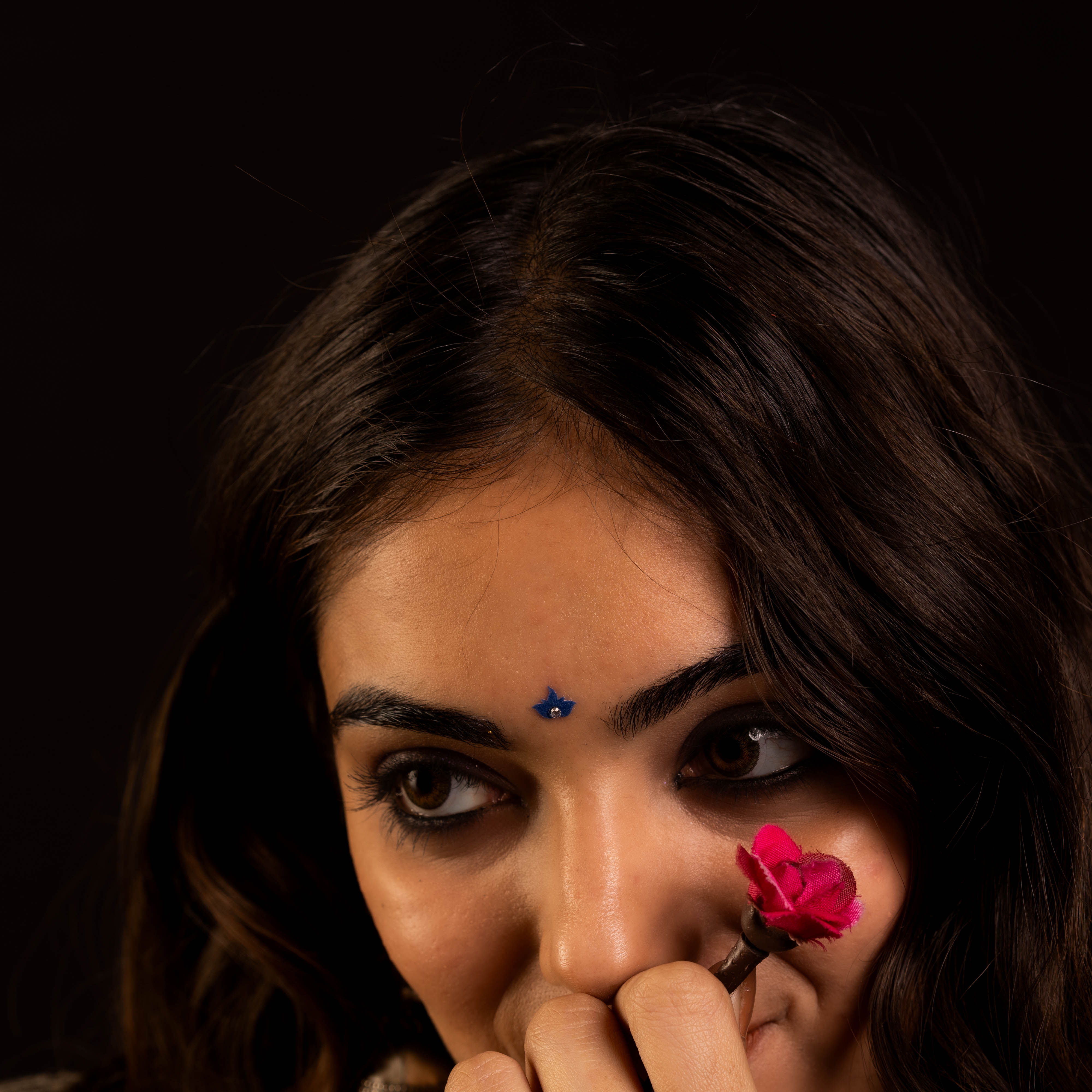 • To apply, gently remove the bindi from its backing and place it between the eyebrows.