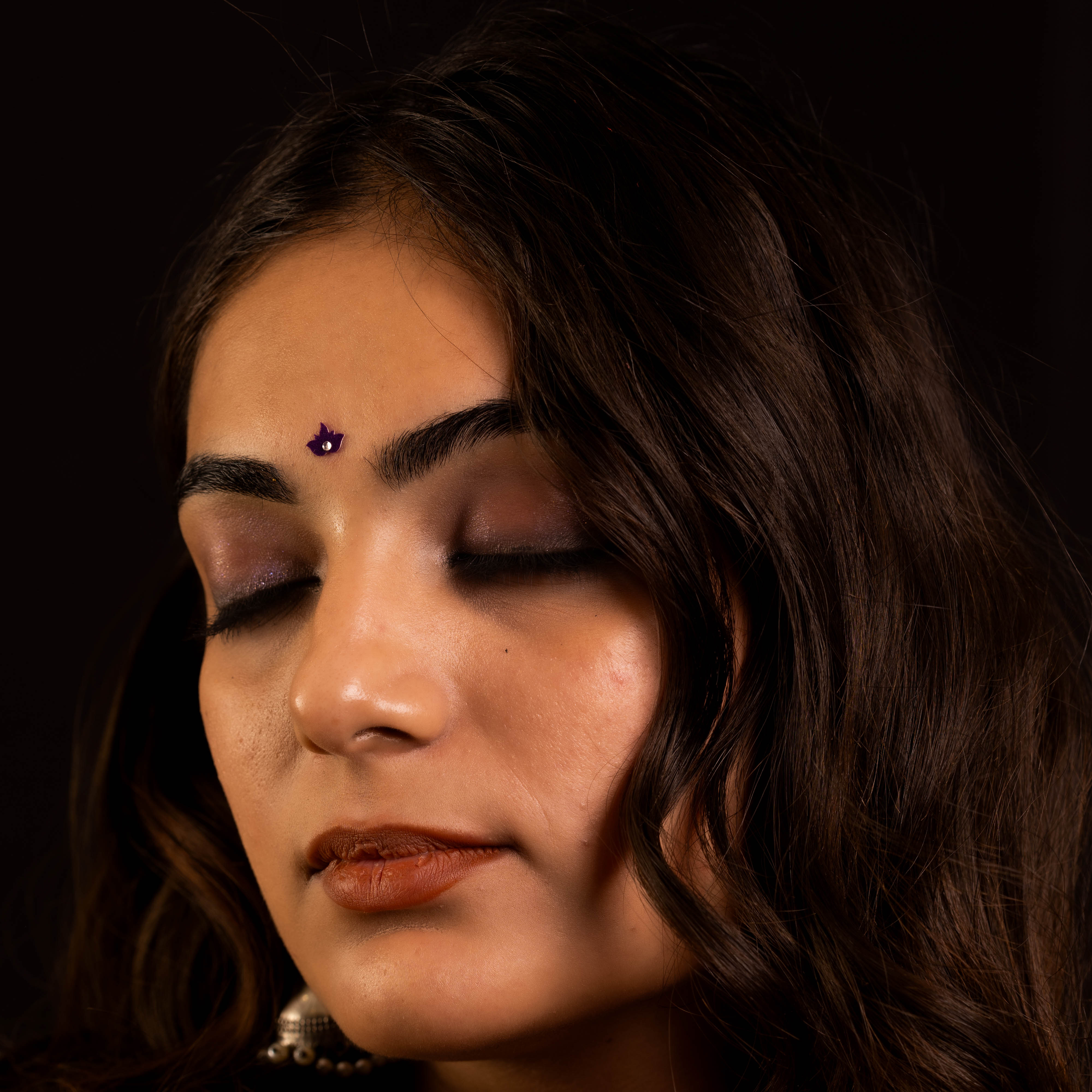 • To apply, gently remove the bindi from its backing and place it between the eyebrows.
