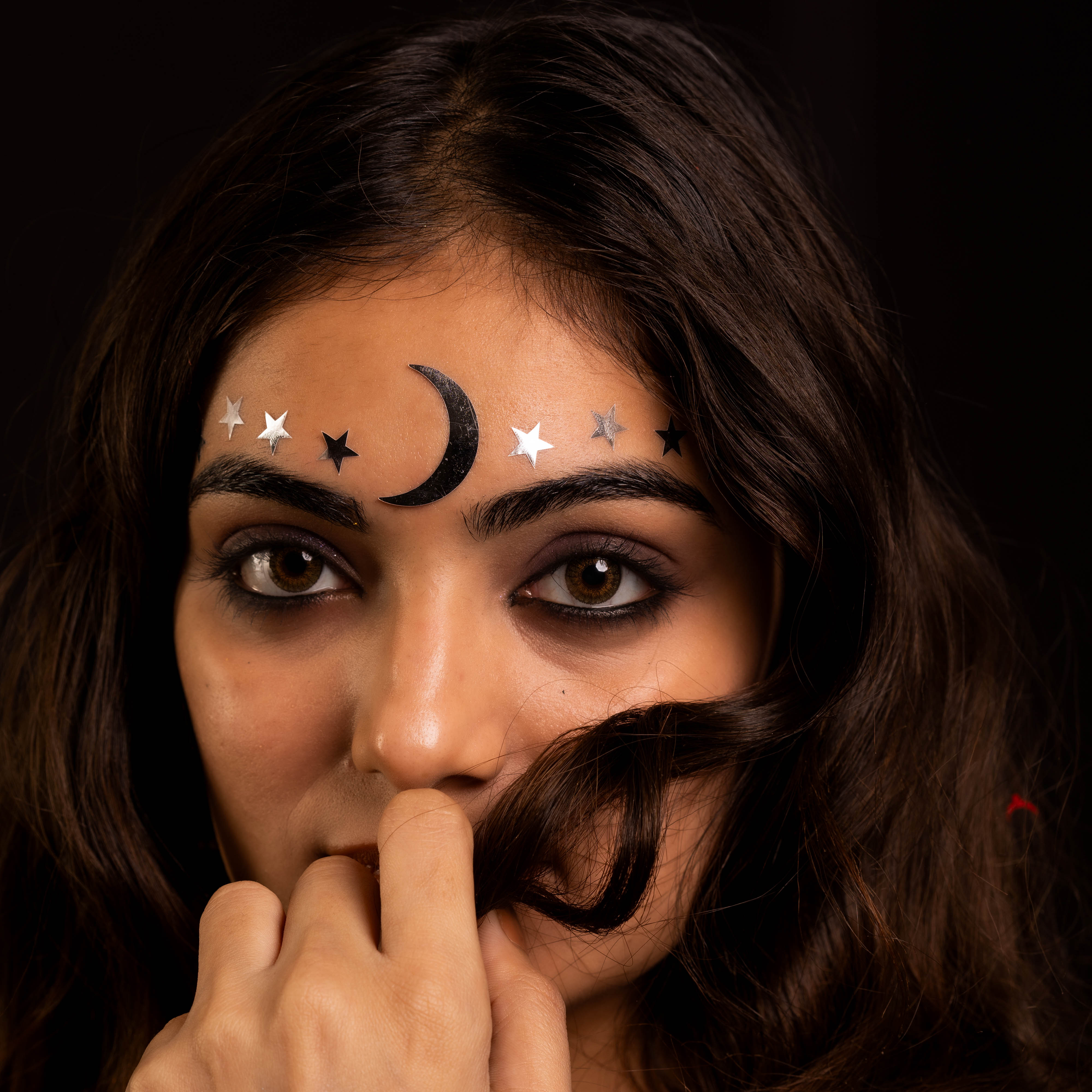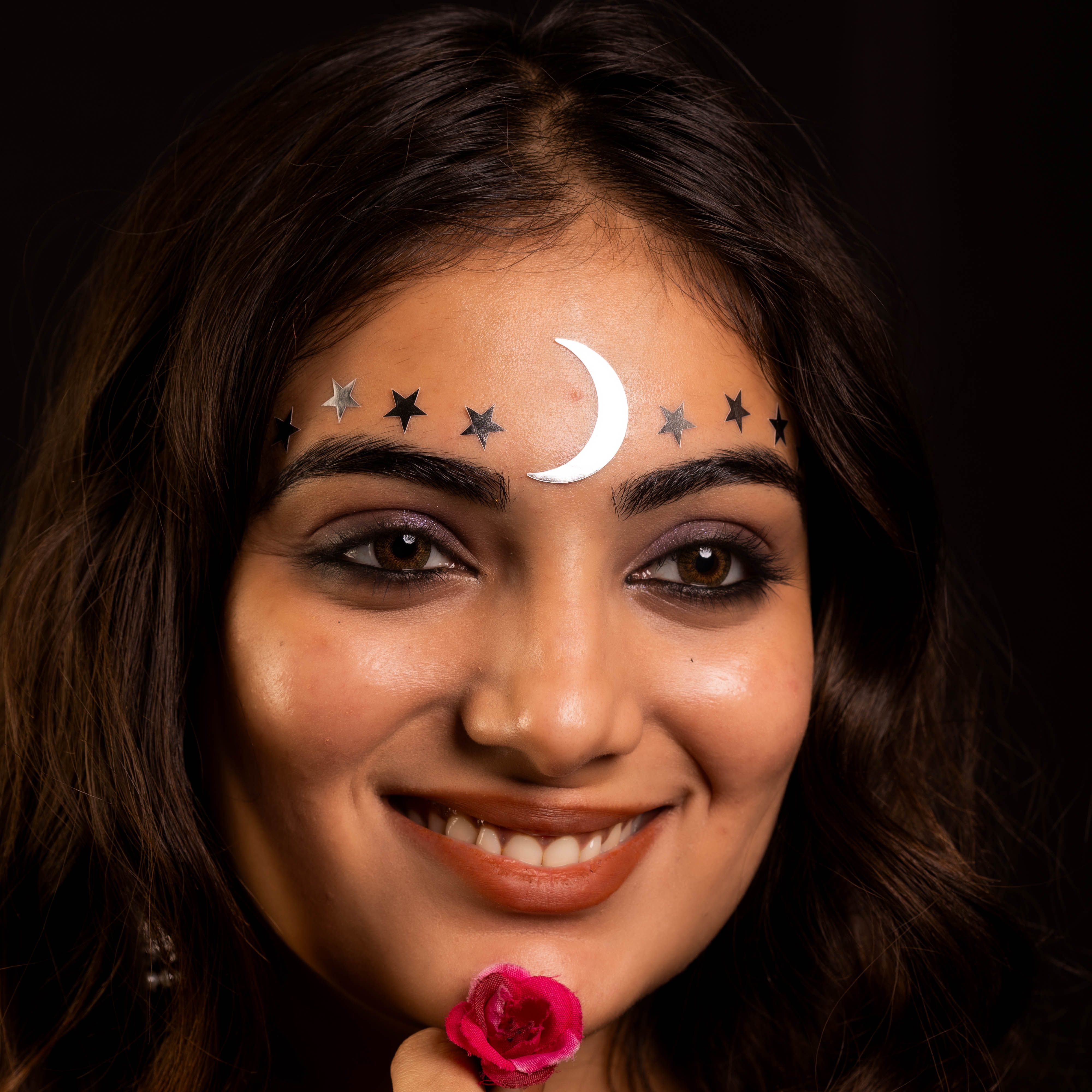 • To apply, gently remove the bindi from its backing and place it between the eyebrows.