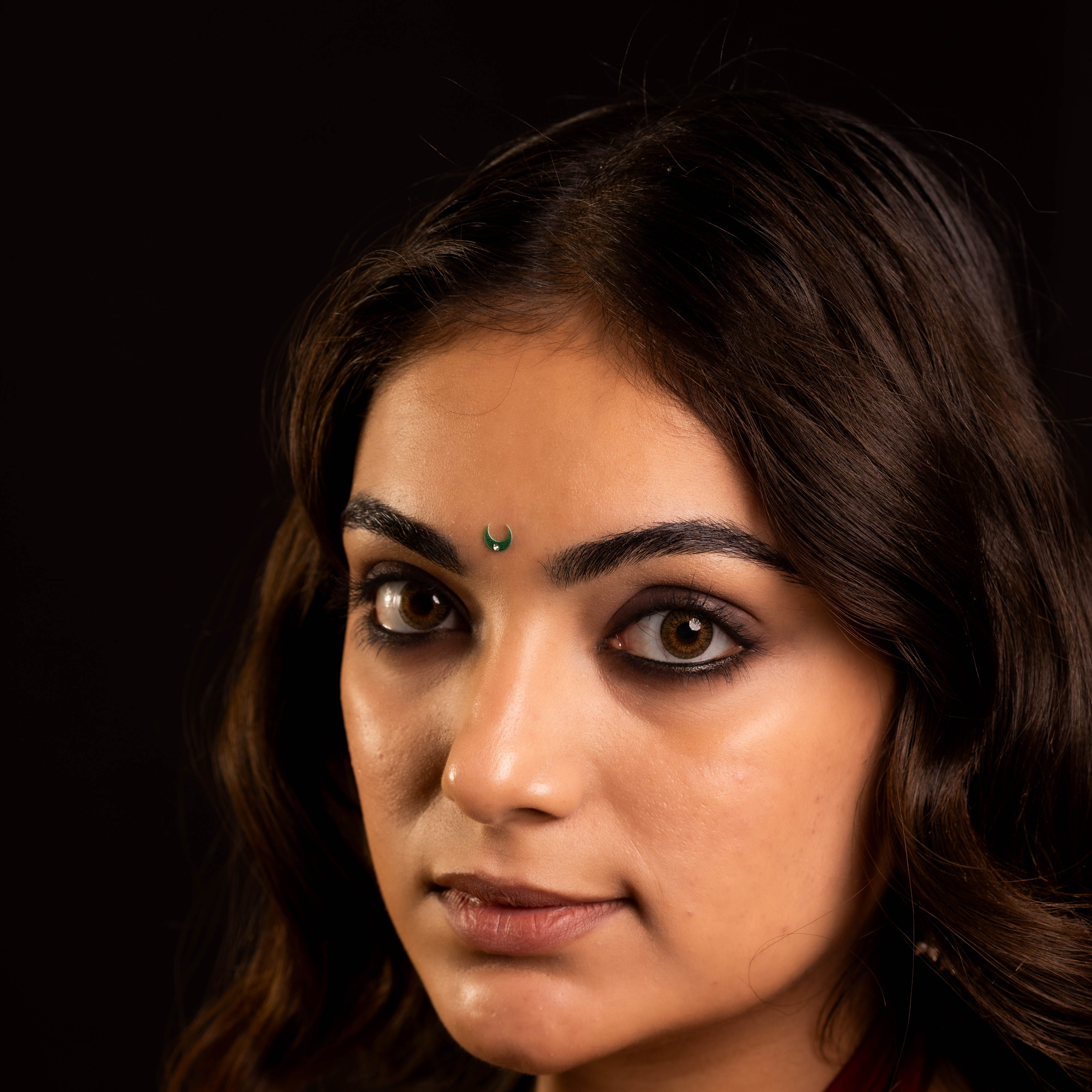 • To apply, gently remove the bindi from its backing and place it between the eyebrows.