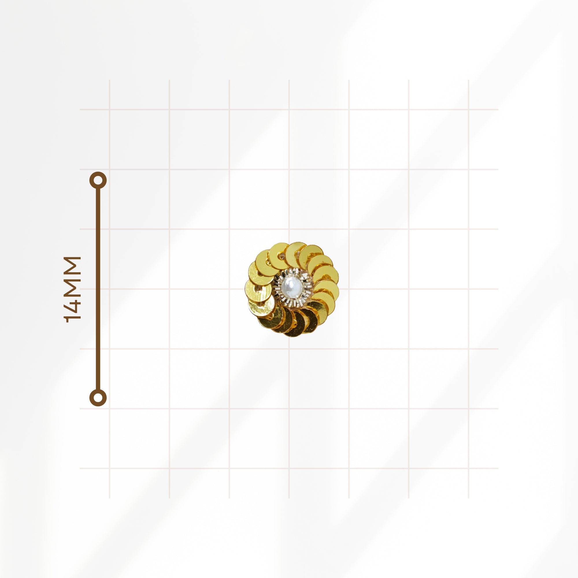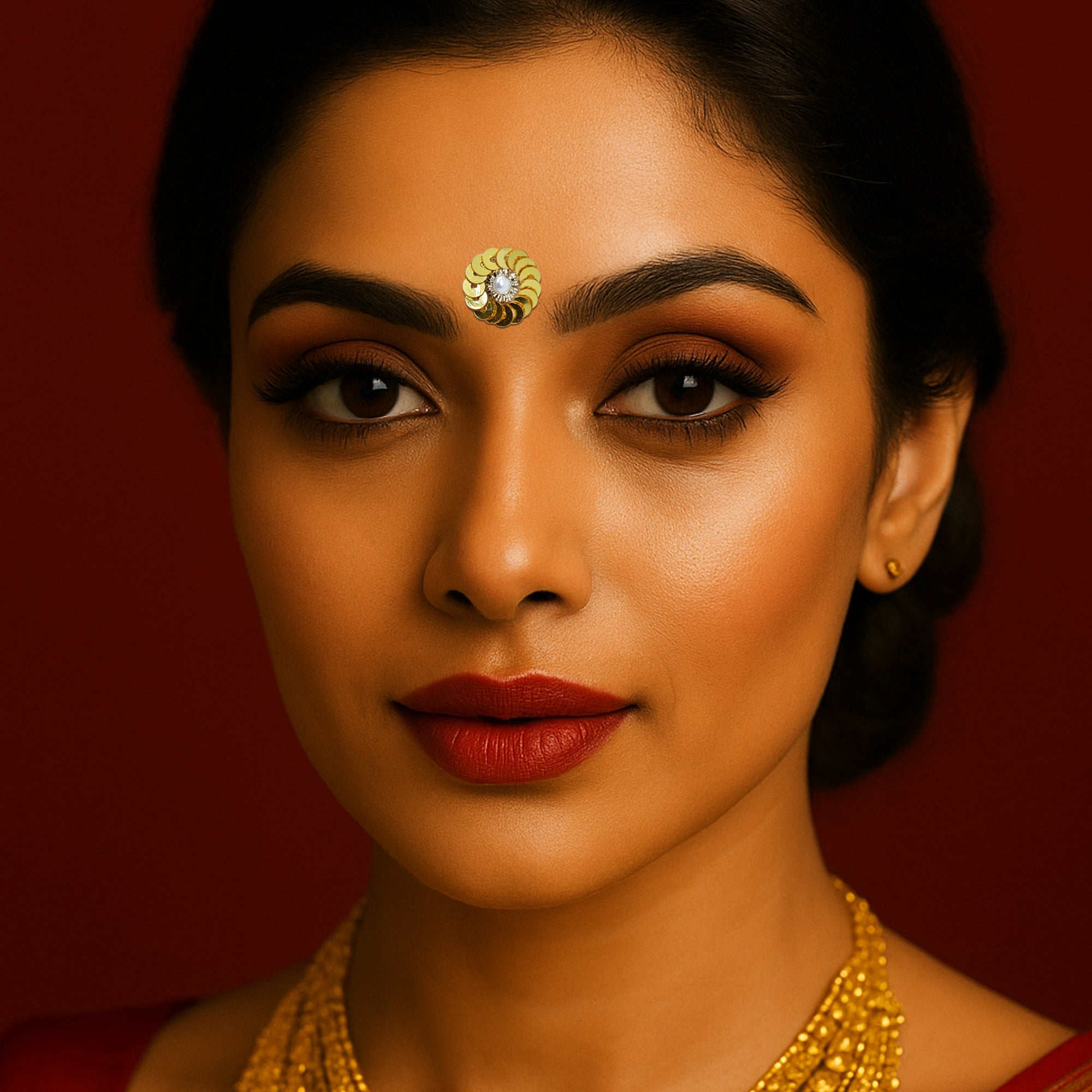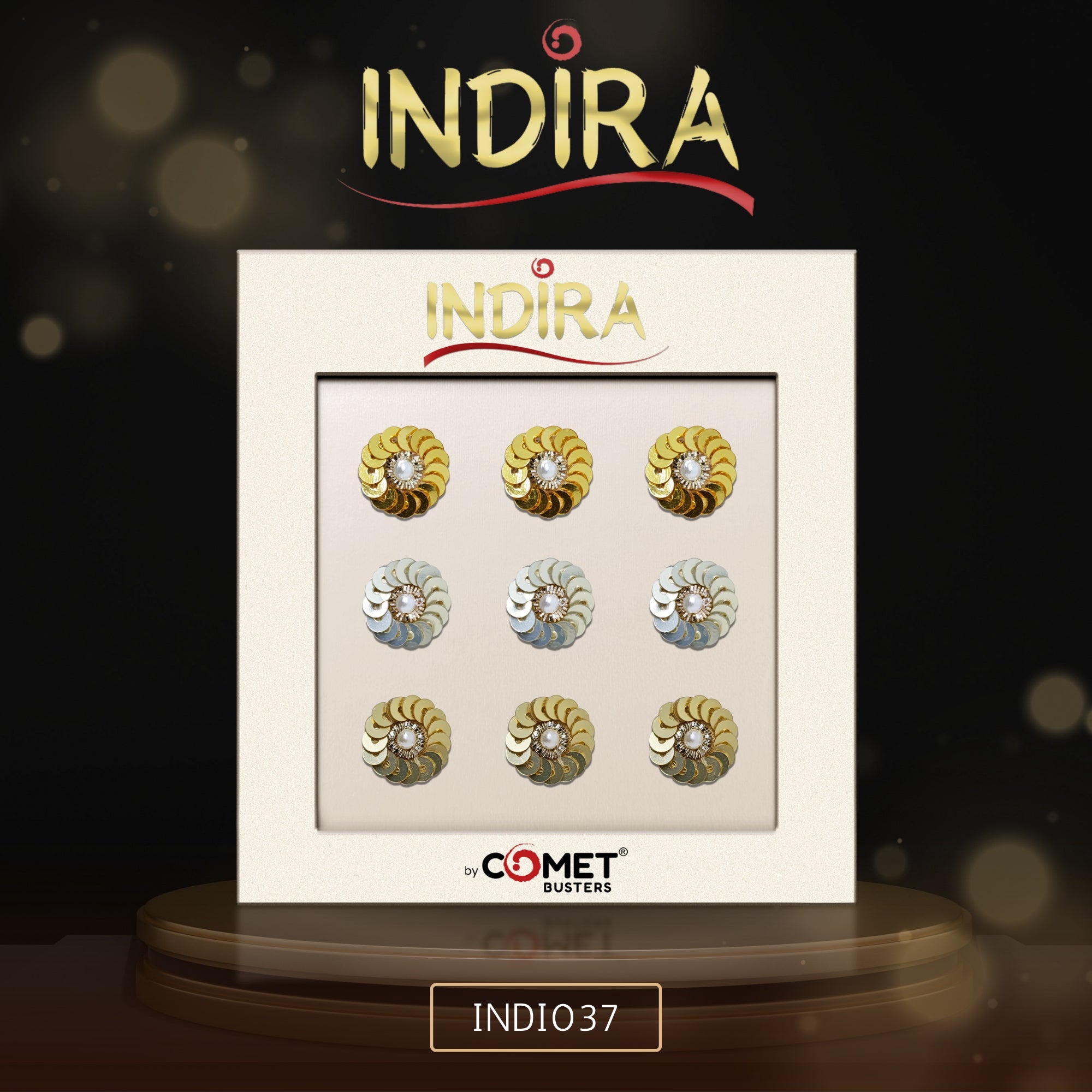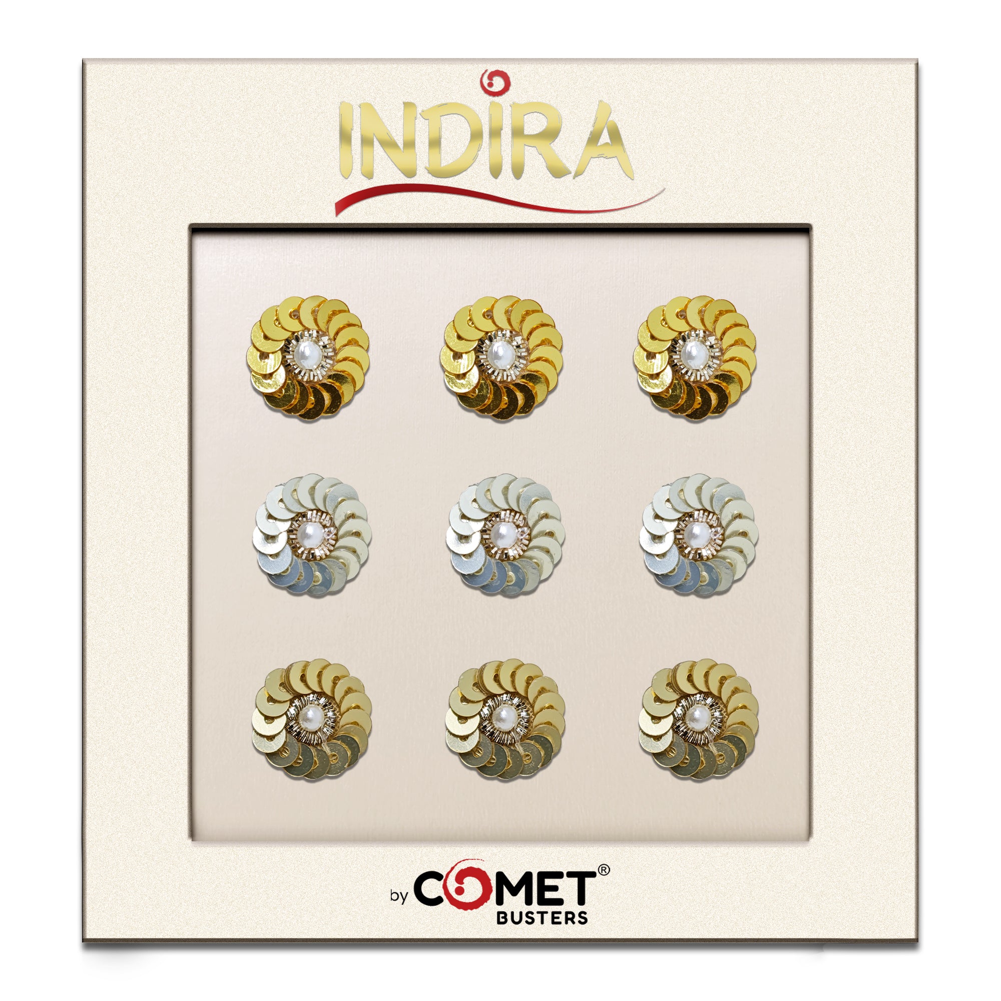 Add sparkle and elegance to your festive look with Indira, our premium handcrafted bindi collection. These 14mm round bindis feature layered metallic sequins arranged in a floral pattern with a pearl centre, creating a rich, dazzling finish perfect for weddings, festivals, classical dance and traditional celebrations.