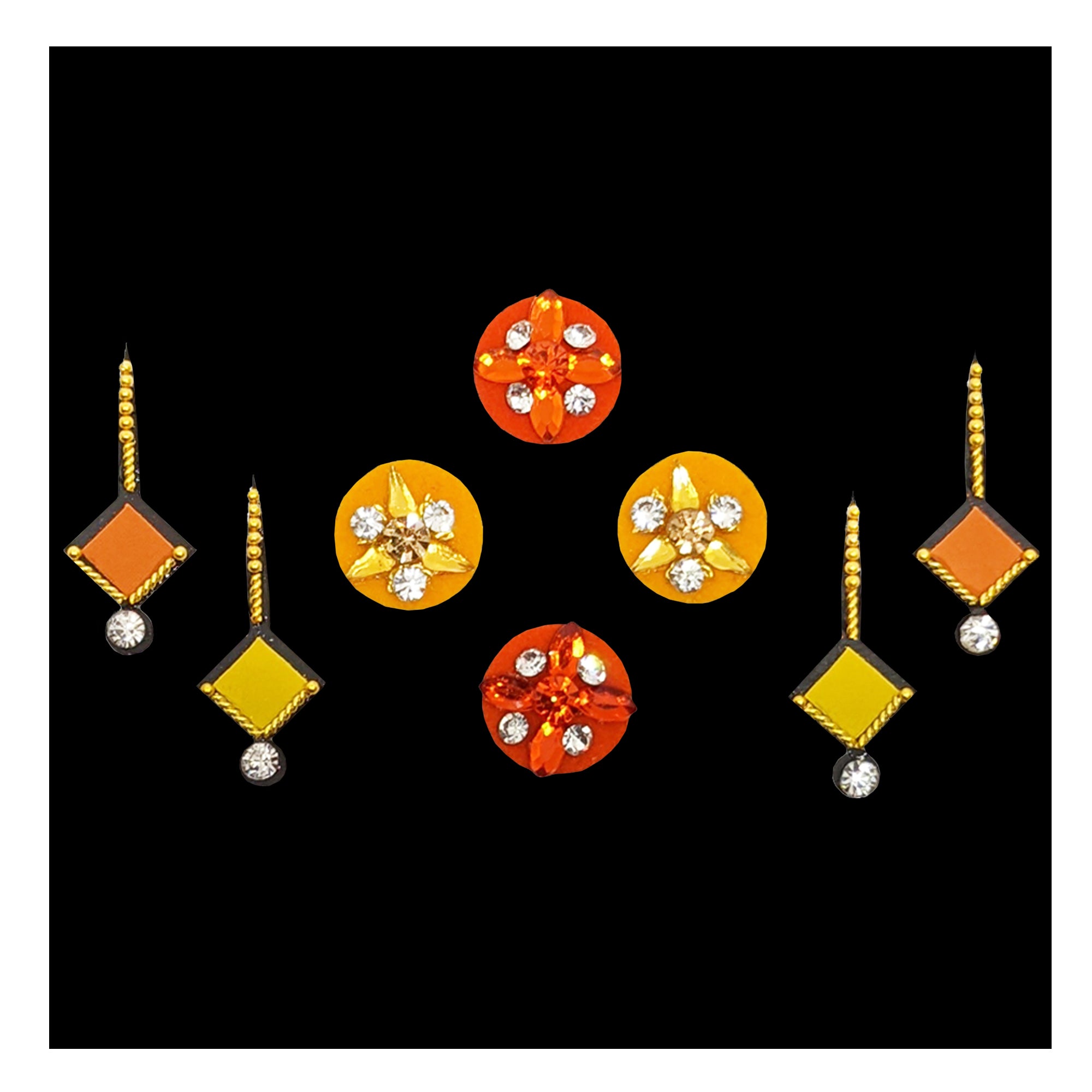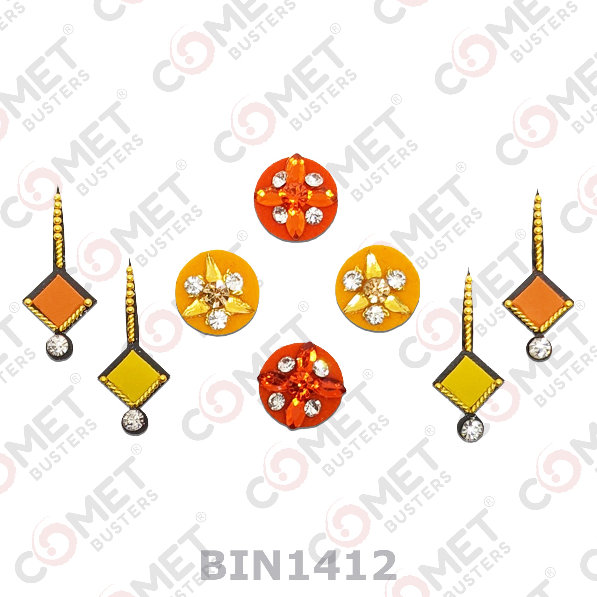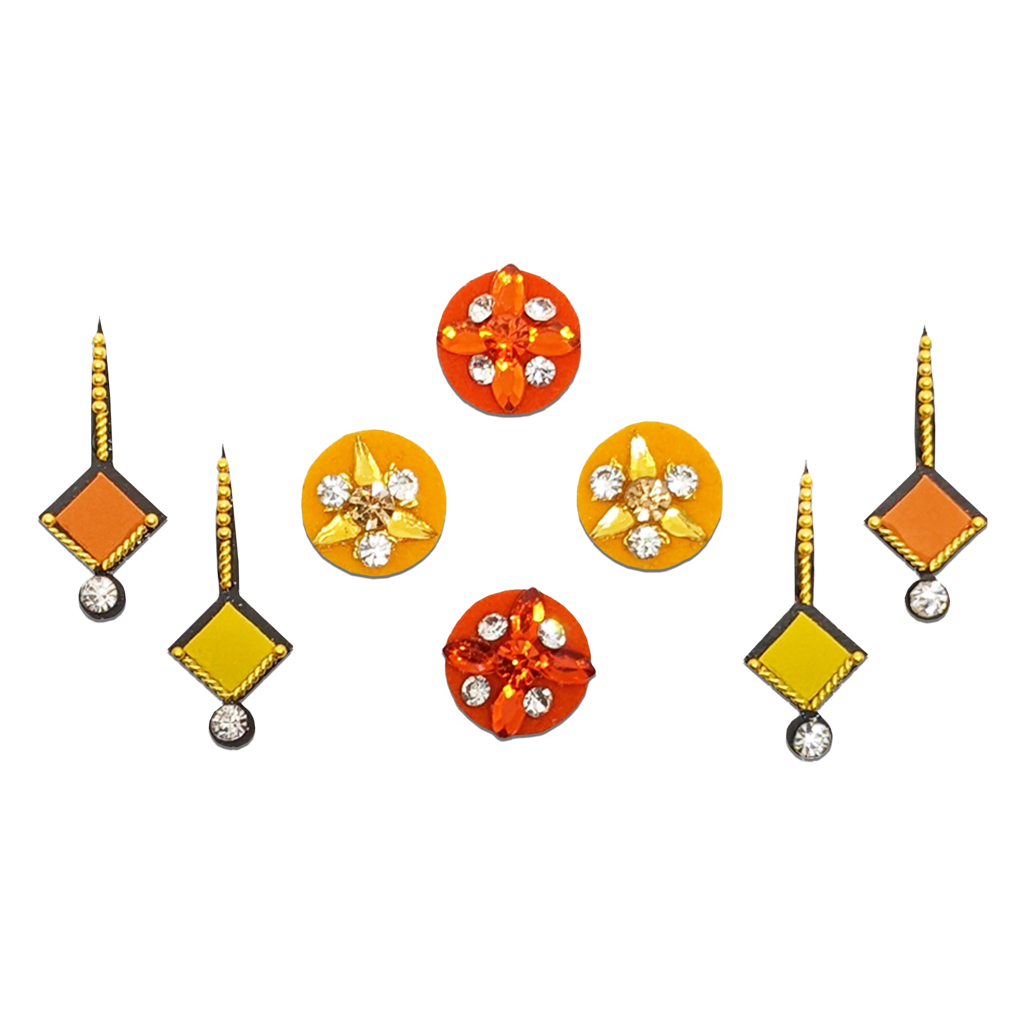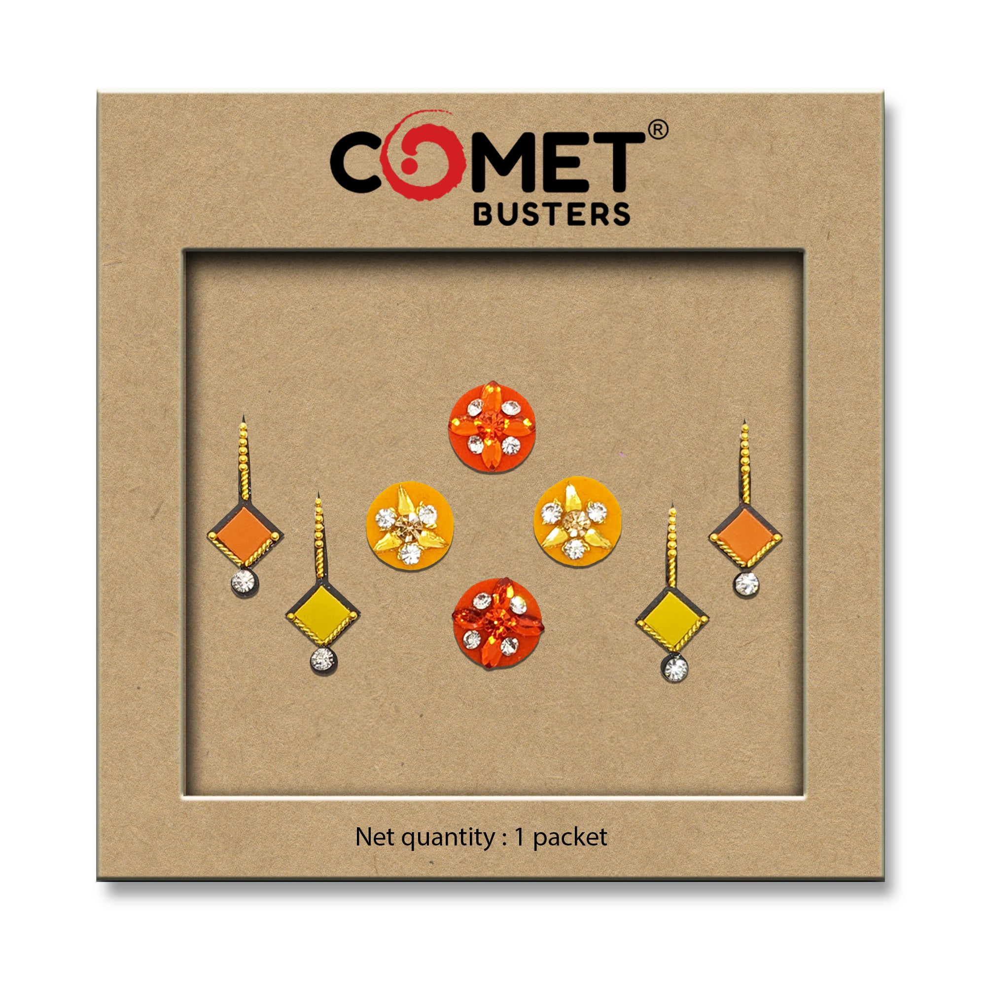 Comet Busters® Yellow, Orange, Multicolor Round, Square – Diamond, Velvet, Shiny Beads – Handcrafted, Reusable & Skin-Friendly Bindis for Party Wear (9, 20mm) – Forehead Bindi Stickers for Women & Girls – BIN1412