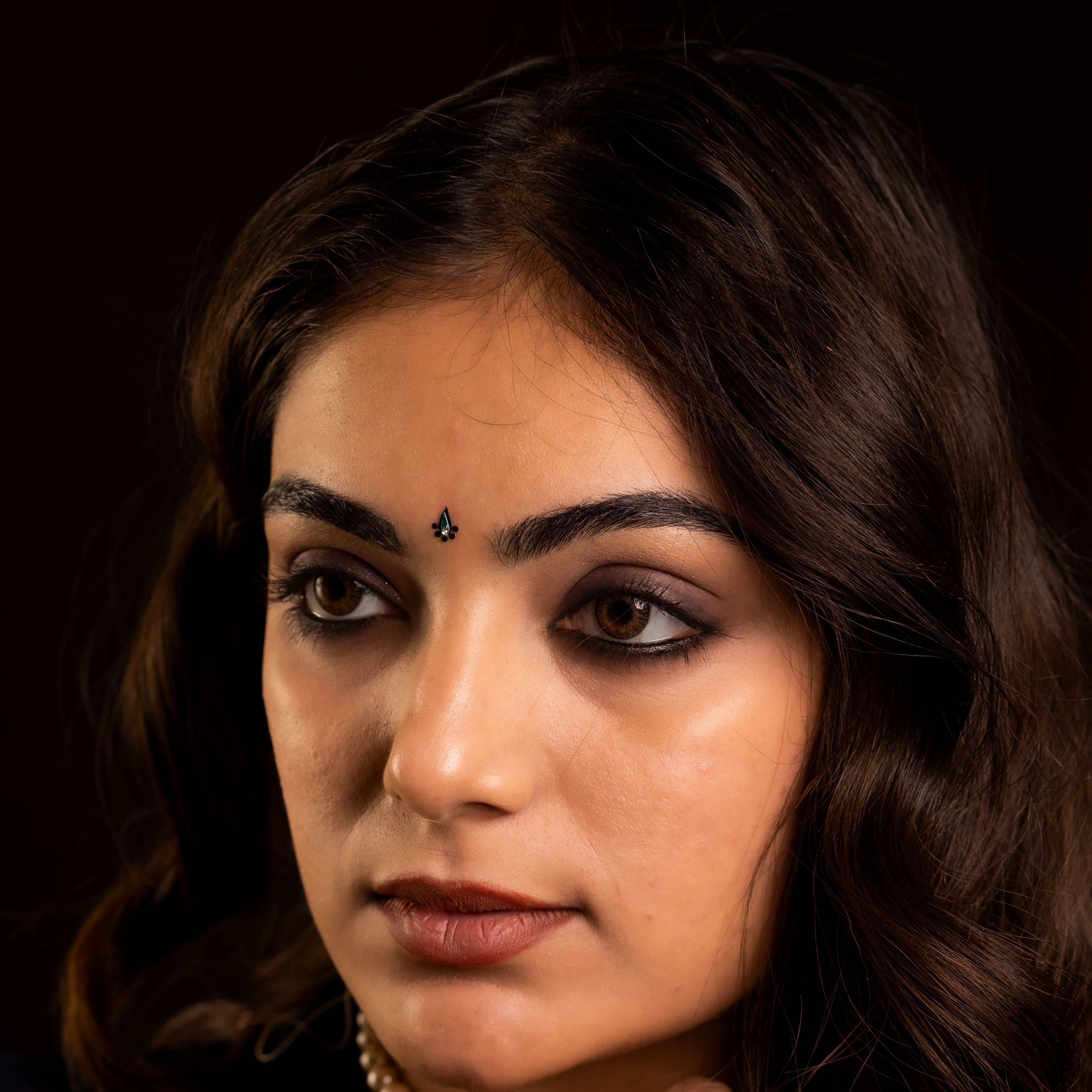 • To apply, gently remove the bindi from its backing and place it between the eyebrows.