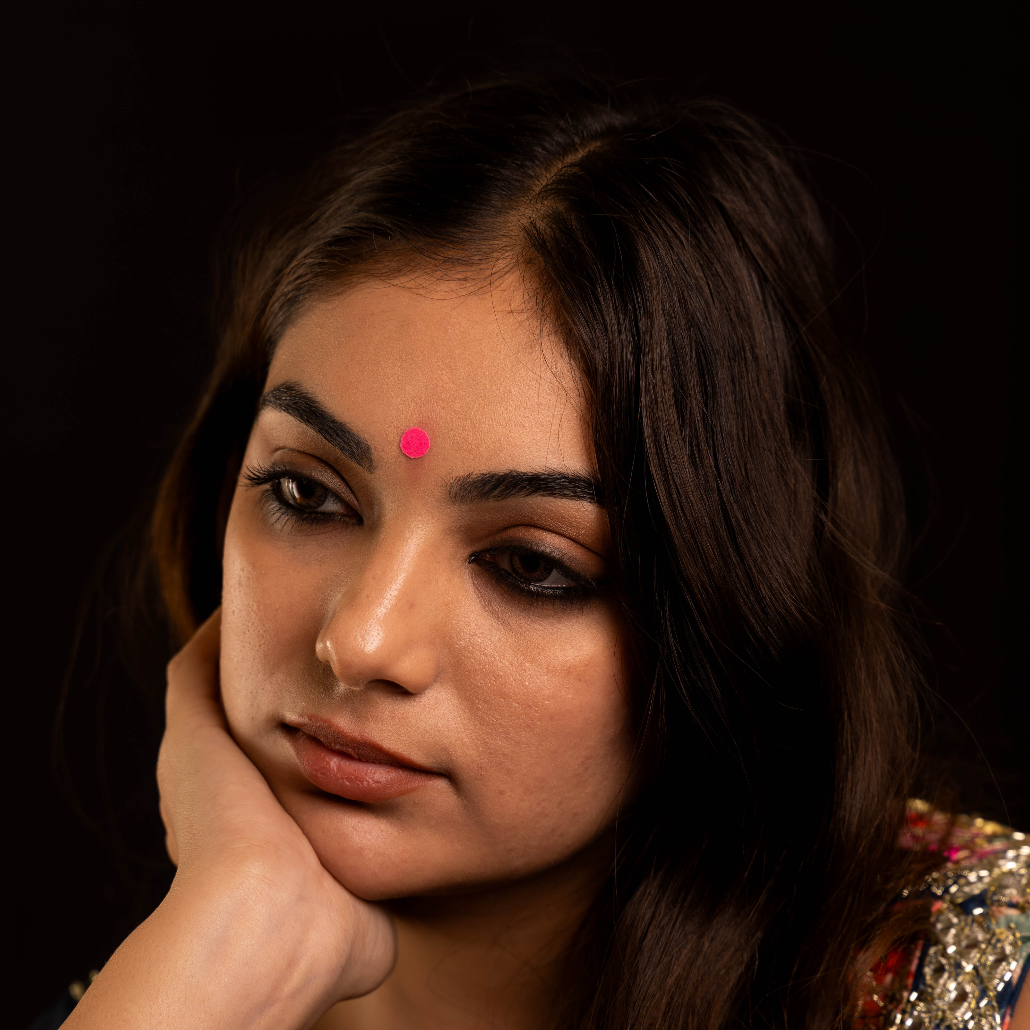 • To apply, gently remove the bindi from its backing and place it between the eyebrows.
