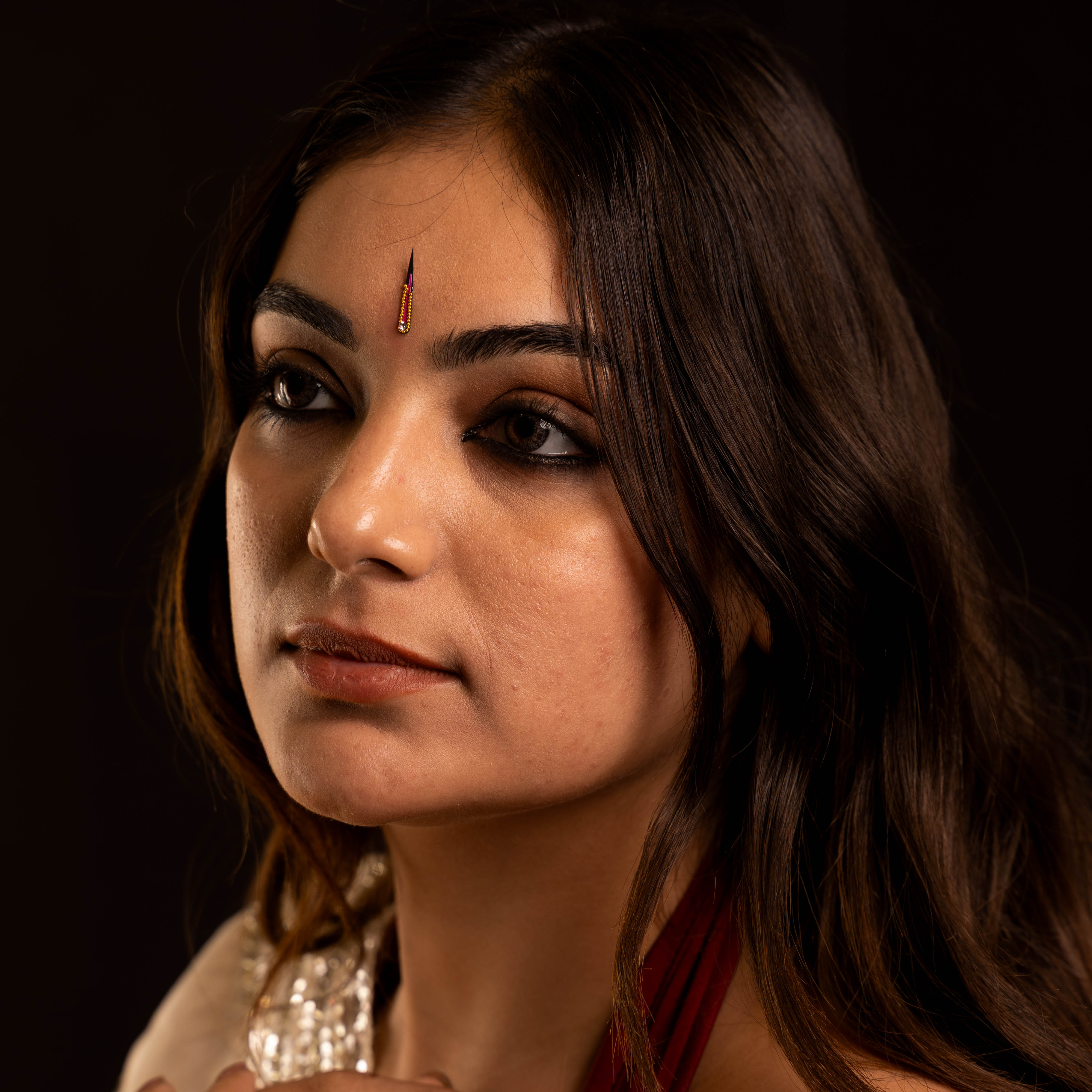• To apply, gently remove the bindi from its backing and place it between the eyebrows.